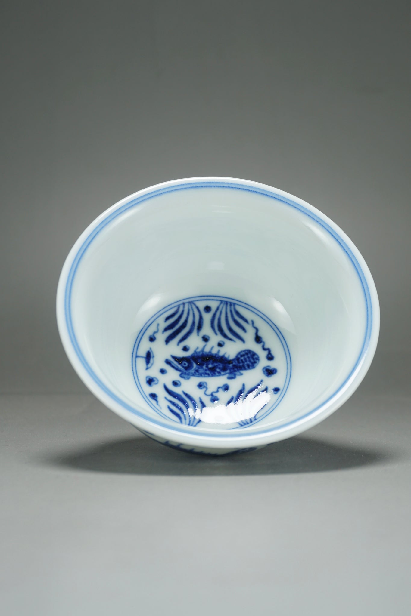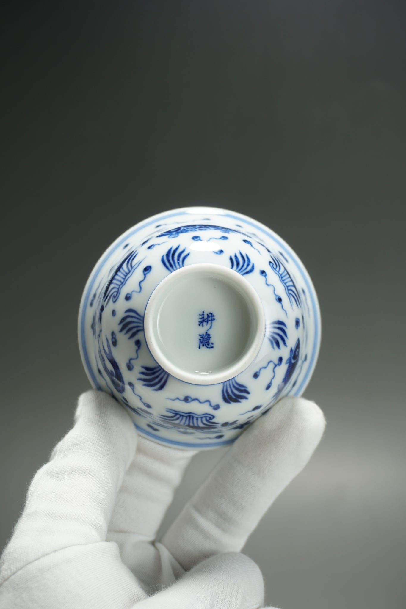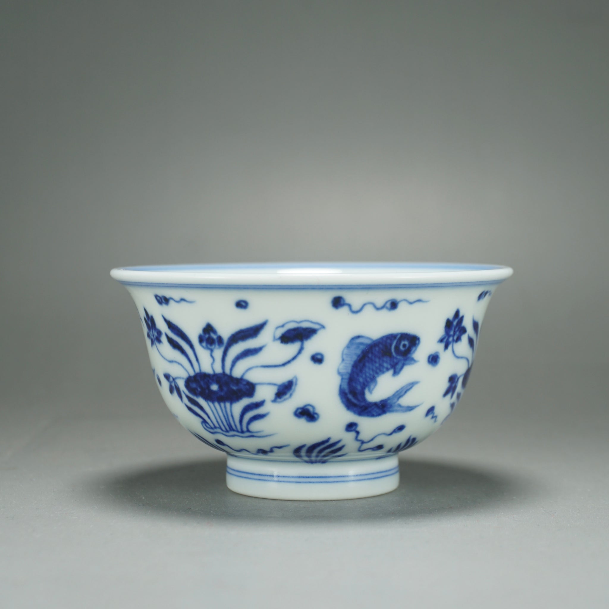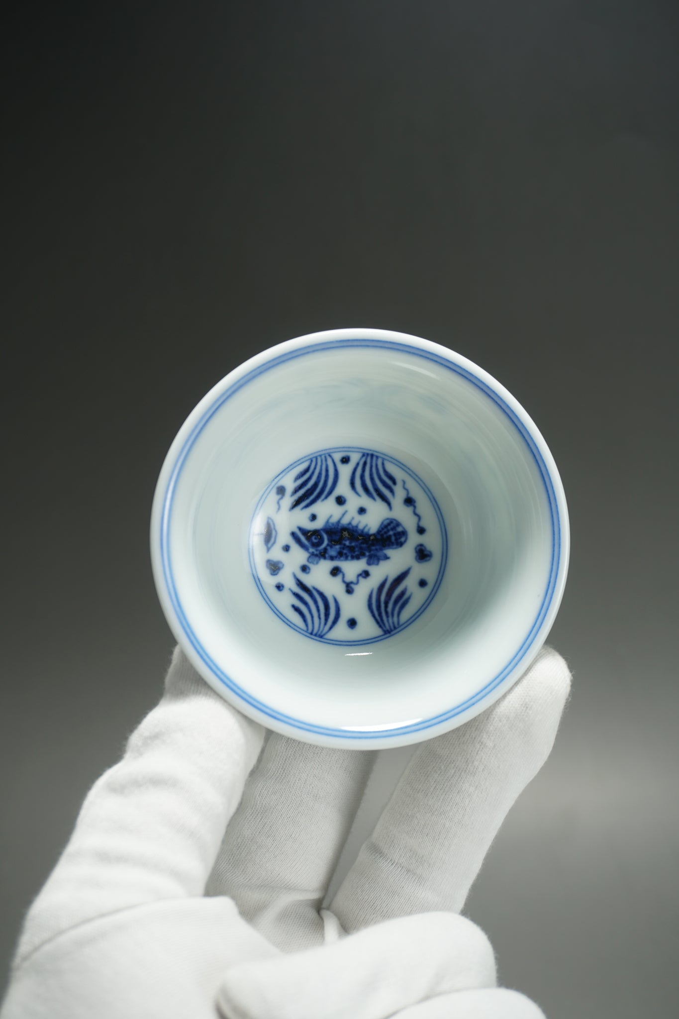 This teacup was handmade of white porcelain and features a hand painted fish and the sea motif in qinghua blue. This kind of porcelain is known as fanggu porcelain because it aims to revive and reproduce an ancient style of porcelain. Fanggu technique is more costly and difficult to execute properly than modern styles of porcelain.