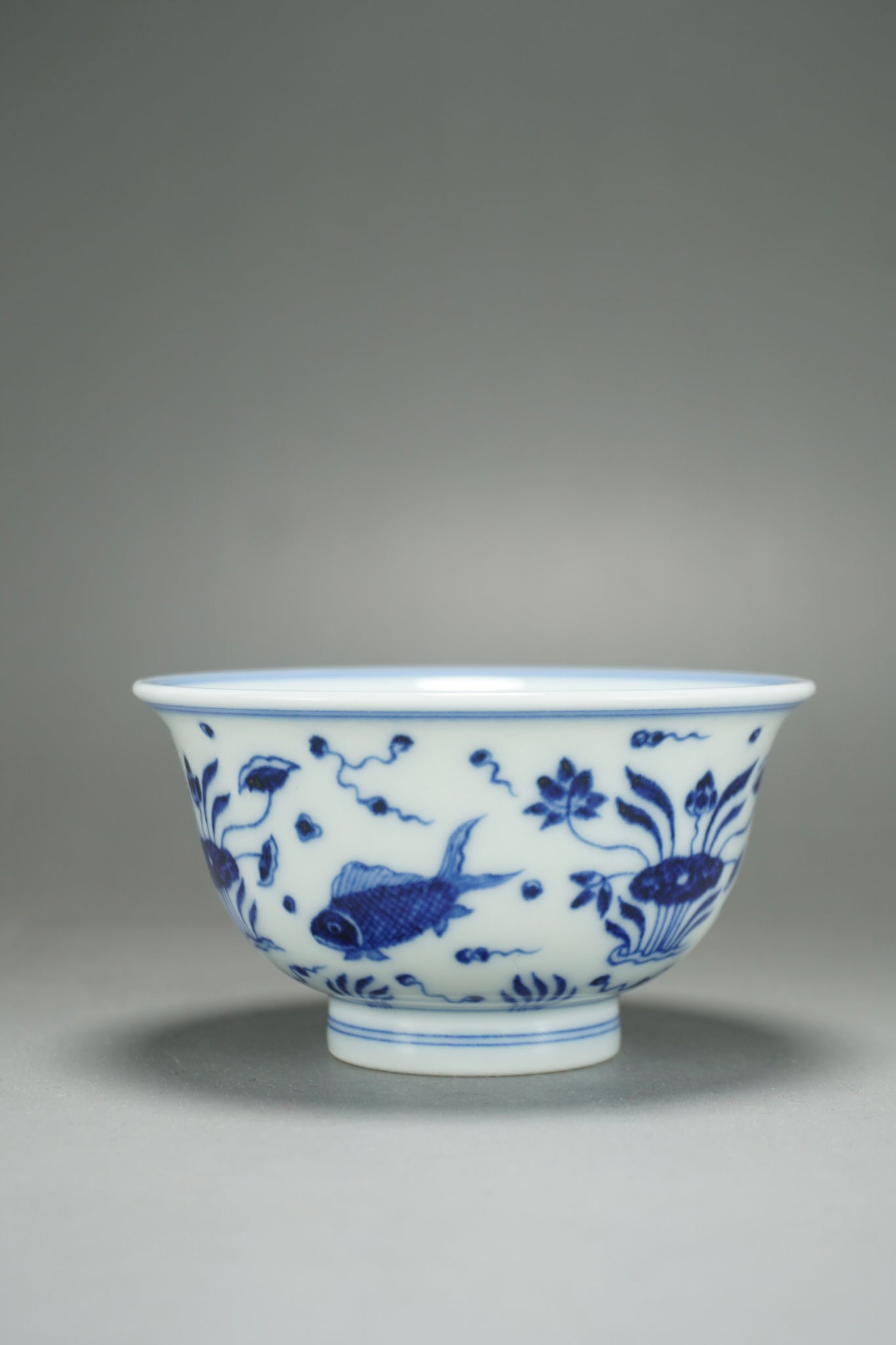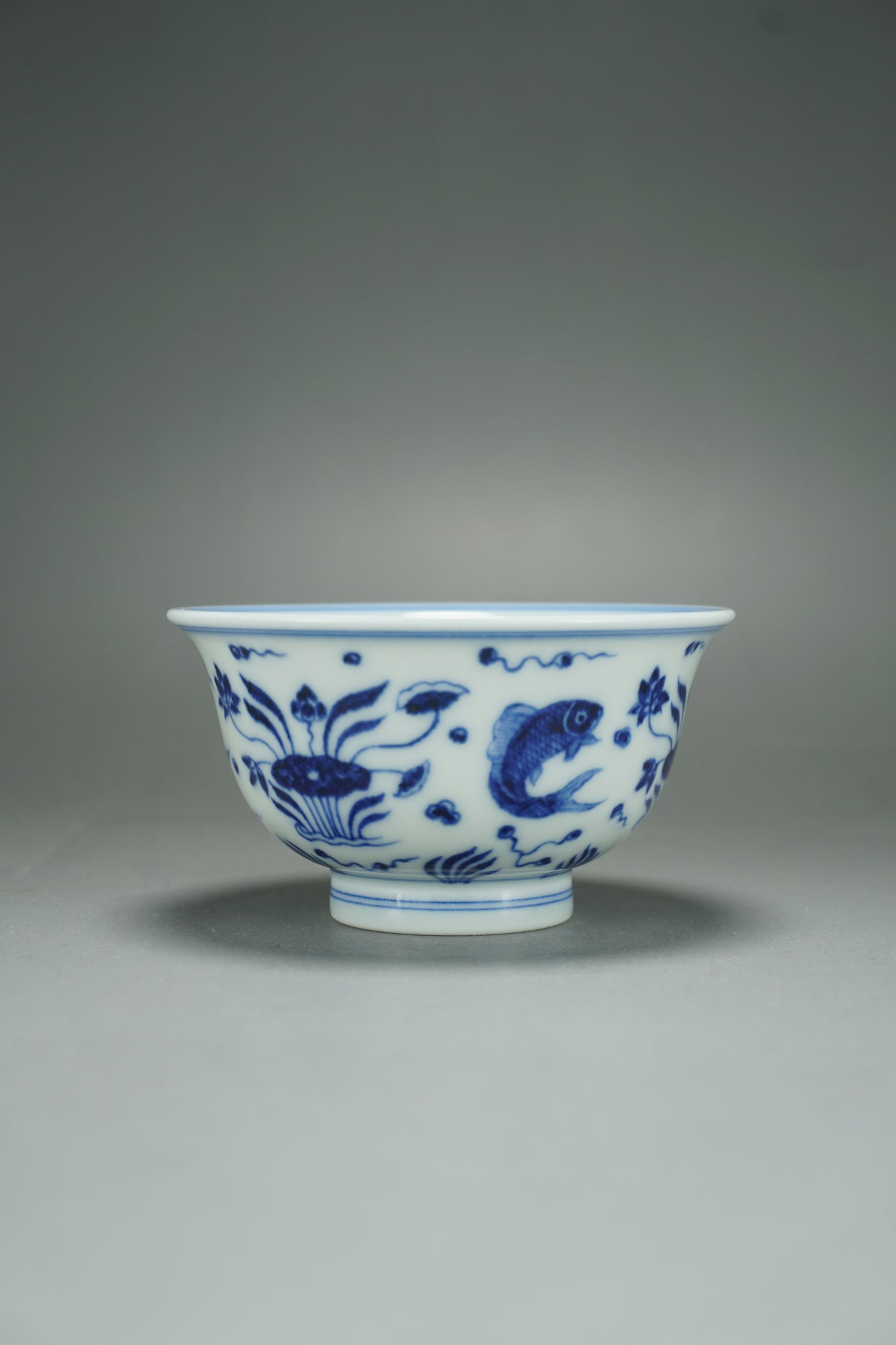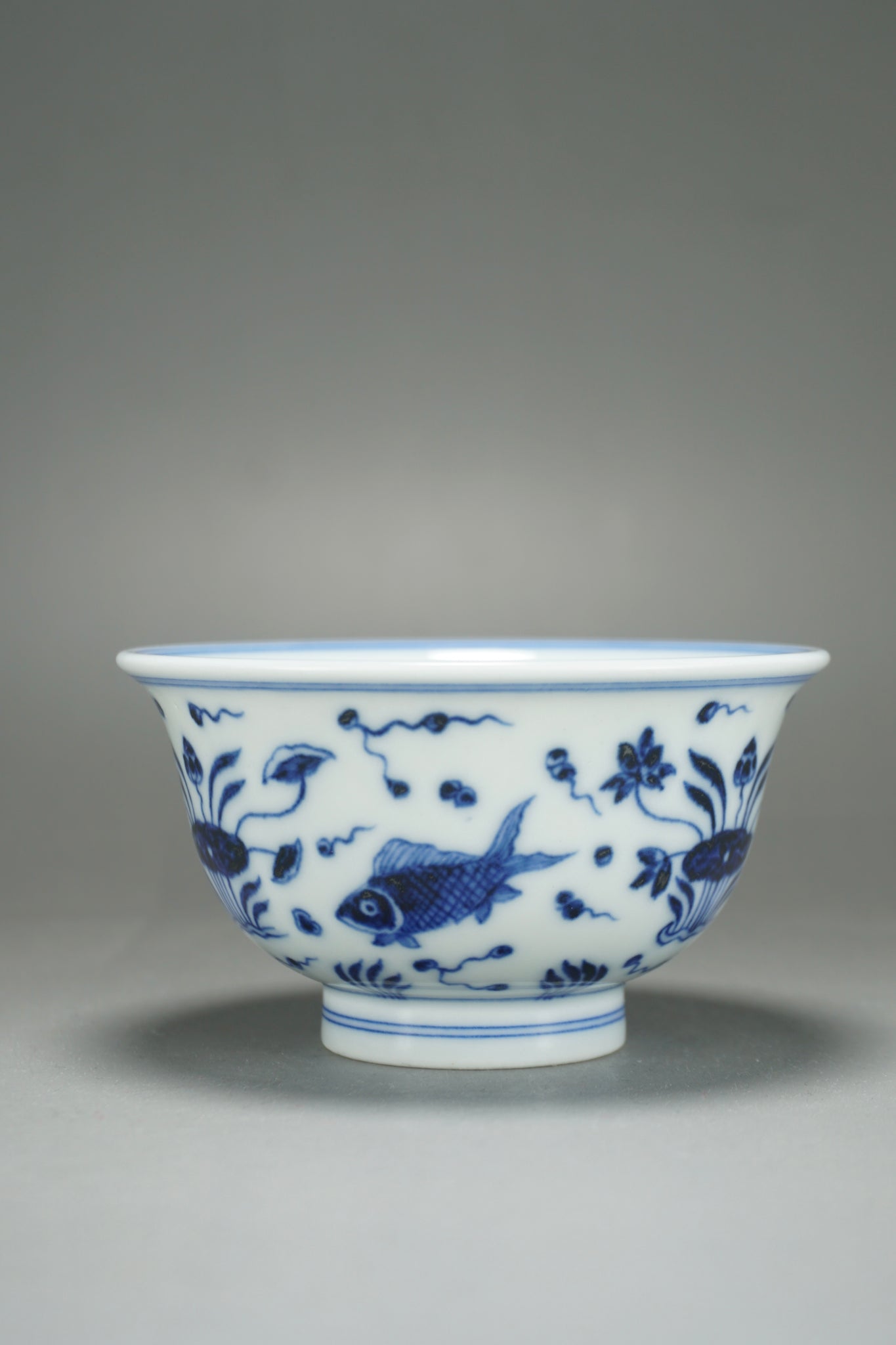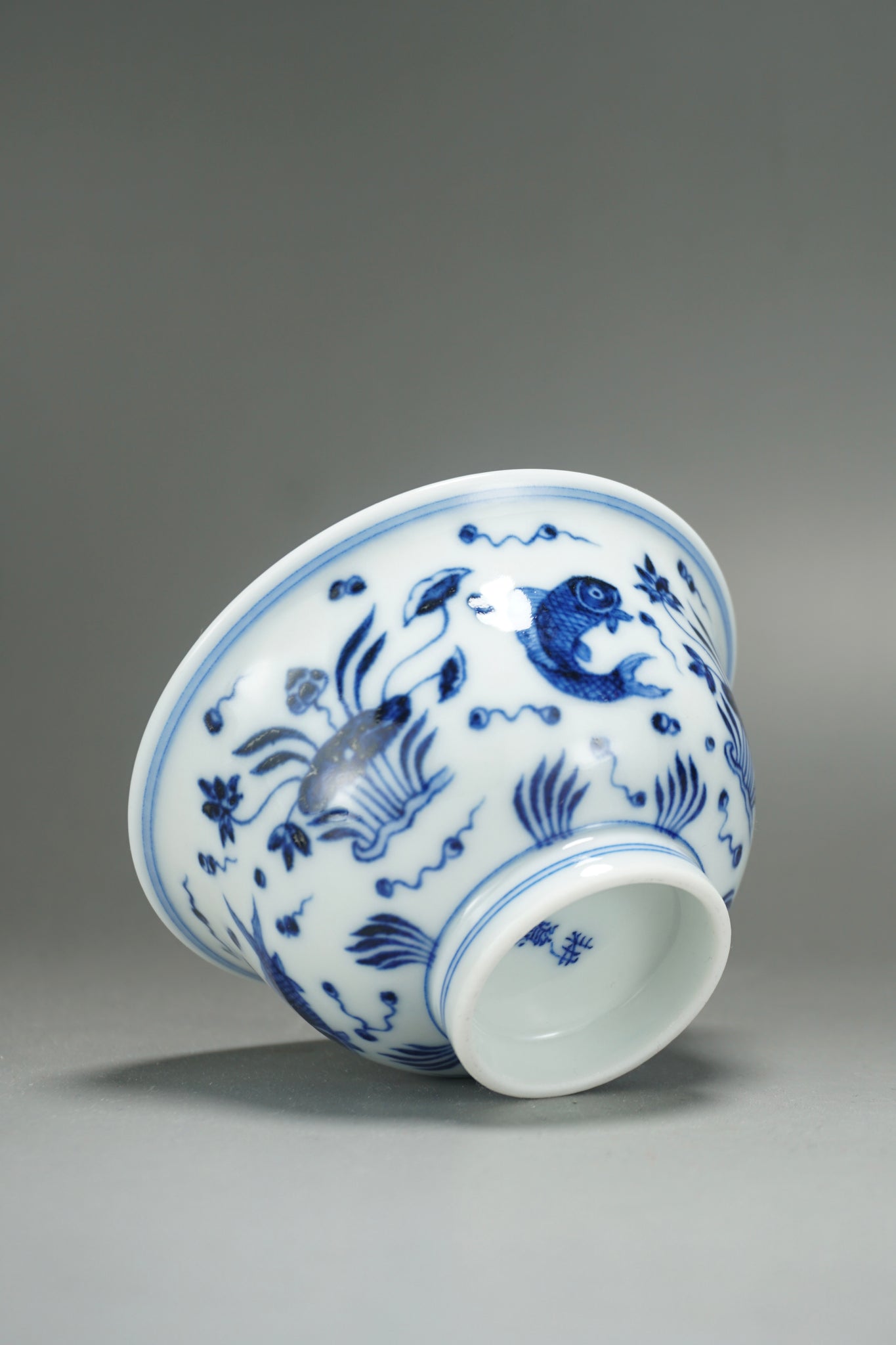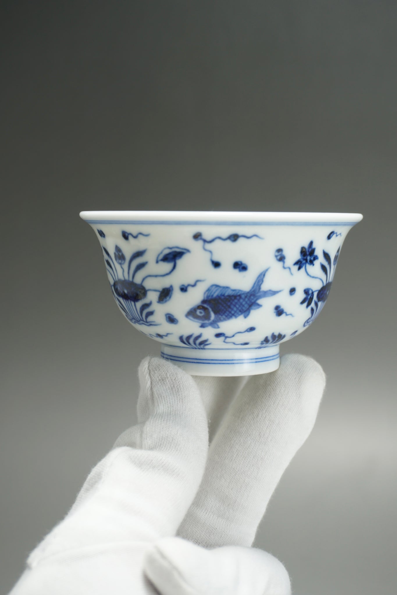 This teacup was handmade of white porcelain and features a hand painted fish and the sea motif in qinghua blue. This kind of porcelain is known as fanggu porcelain because it aims to revive and reproduce an ancient style of porcelain. Fanggu technique is more costly and difficult to execute properly than modern styles of porcelain.