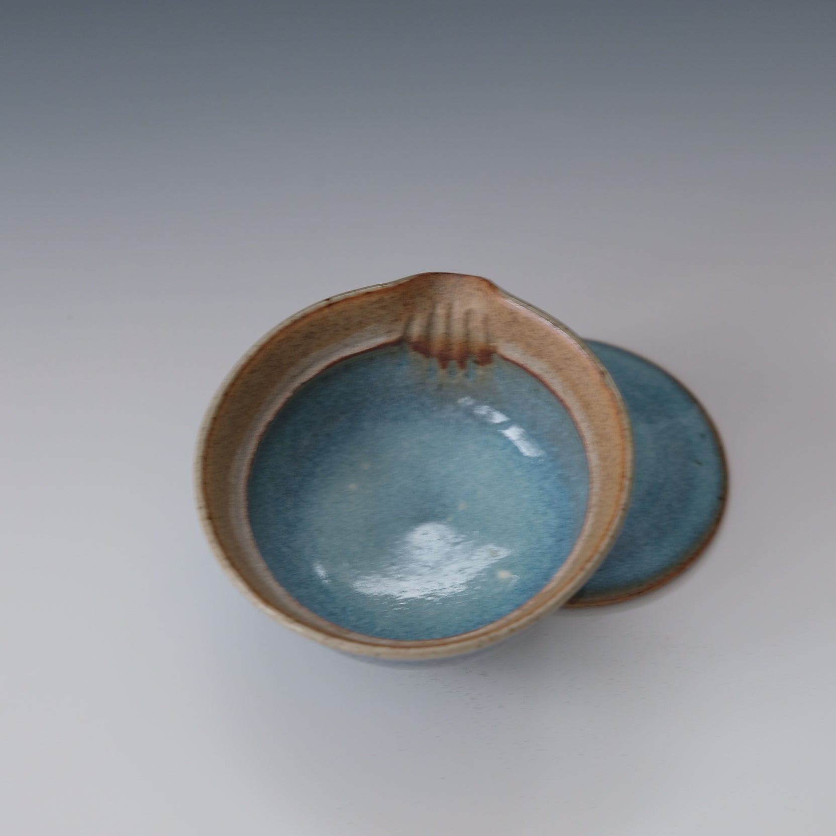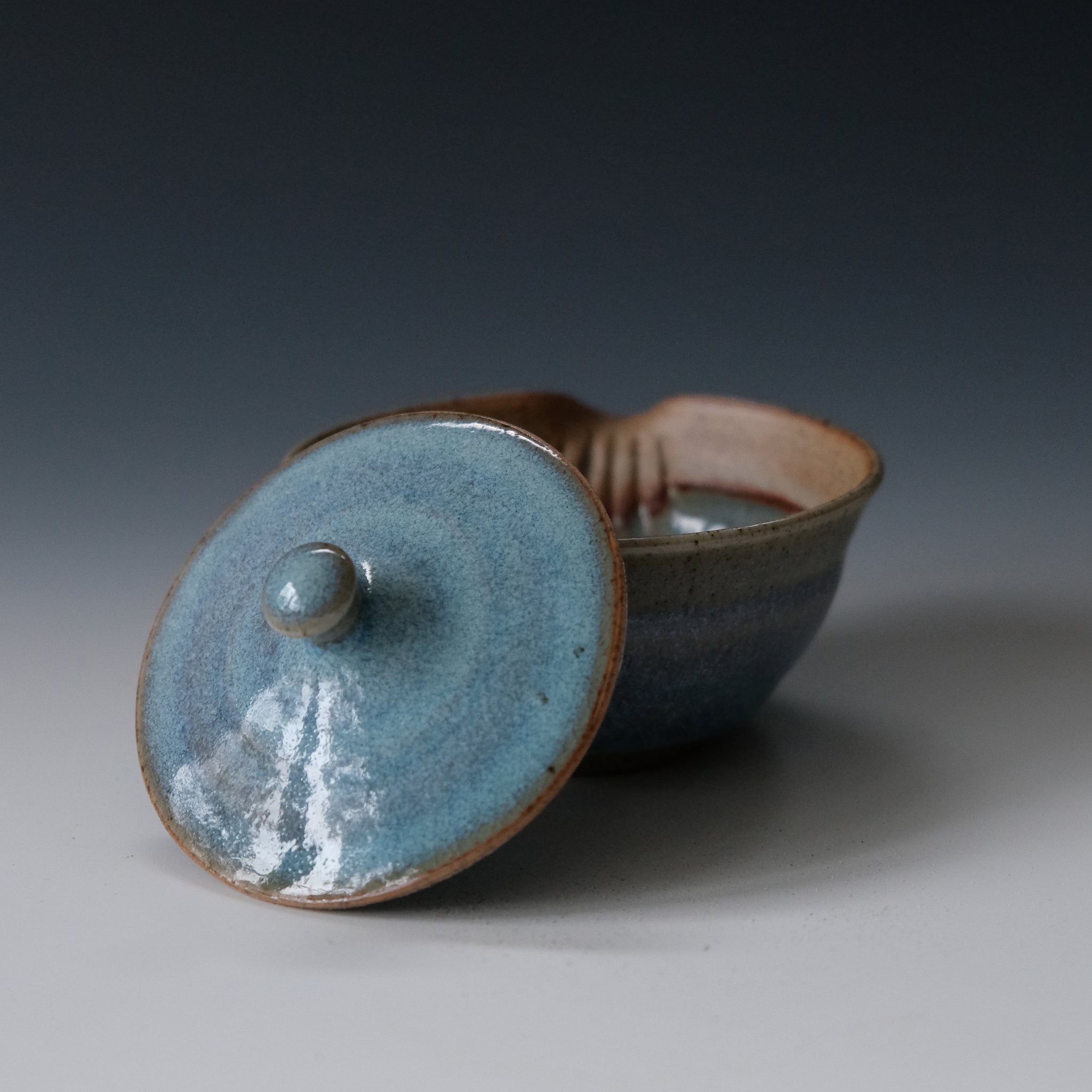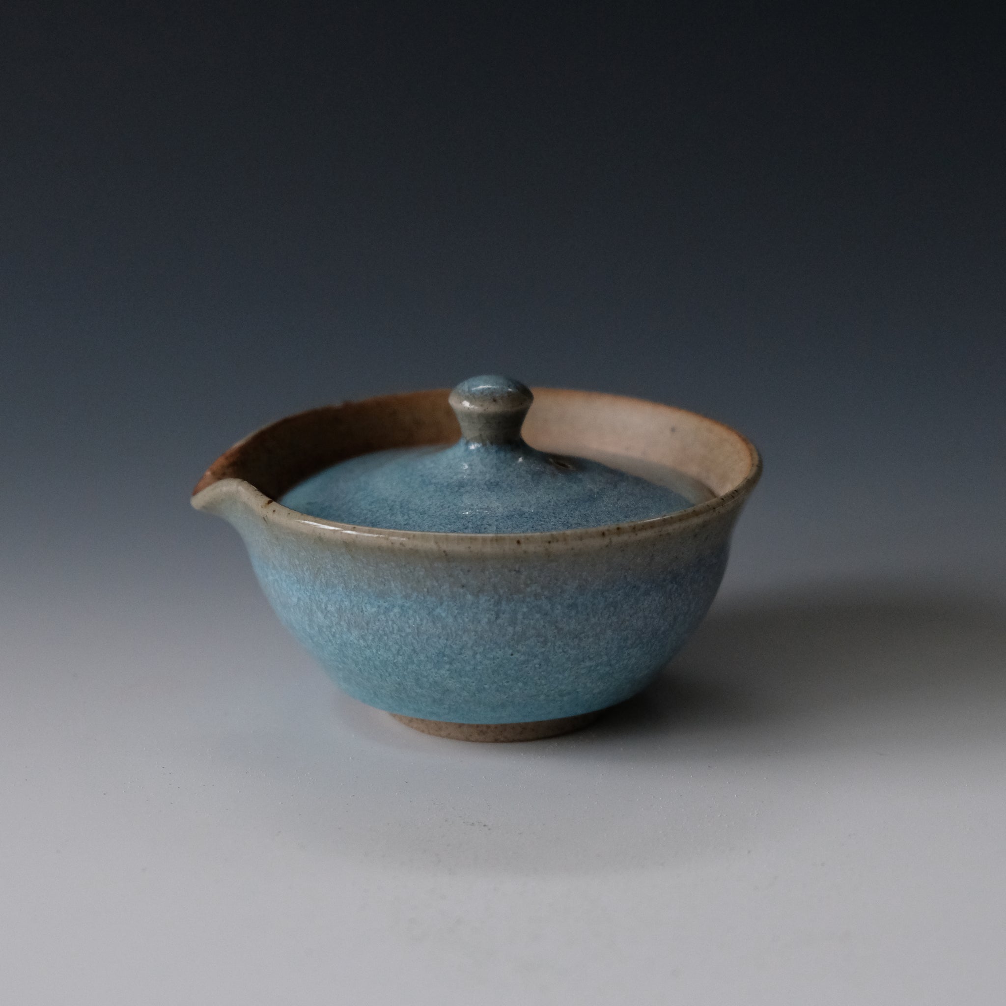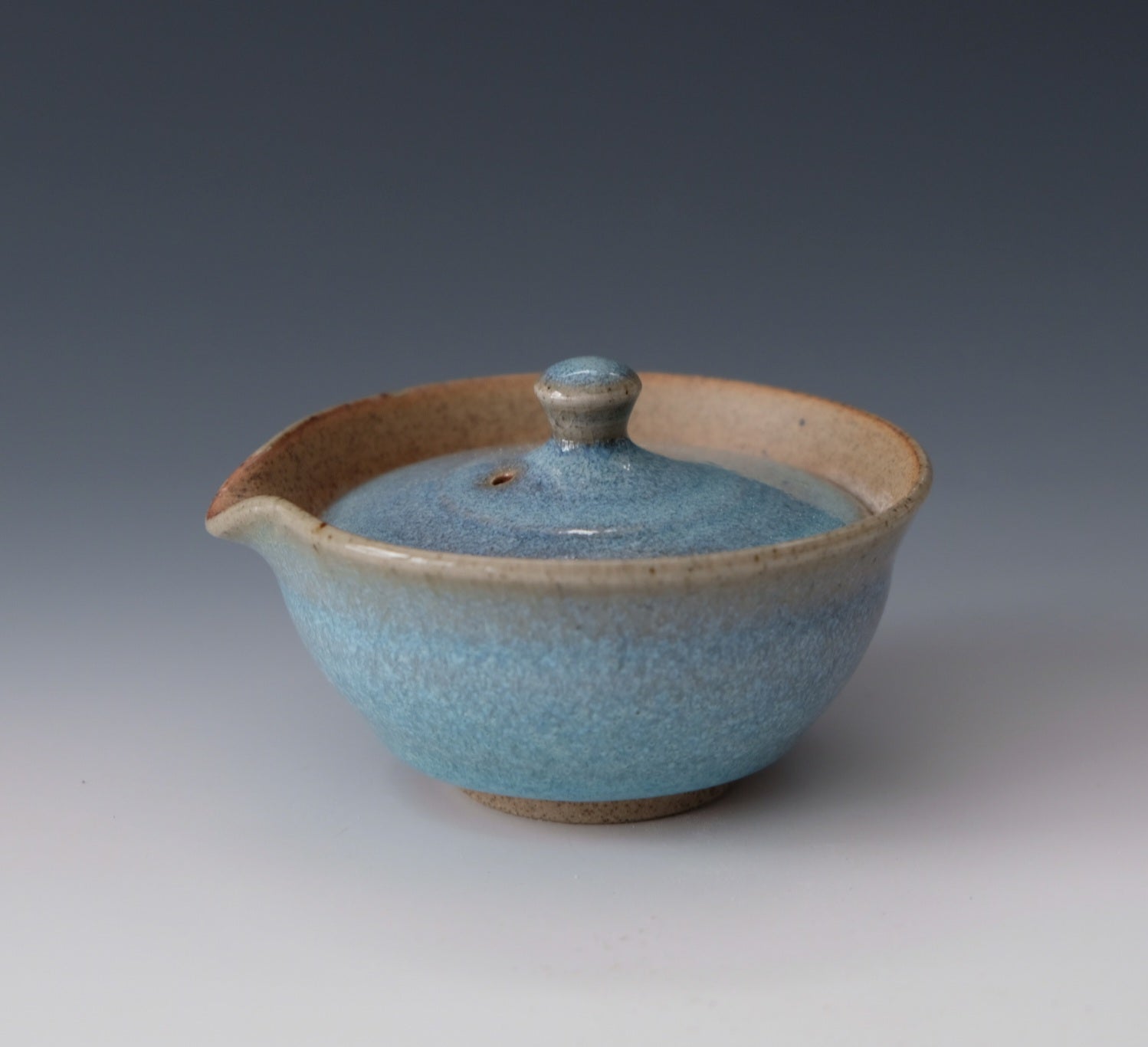 This shiboridashi was handmade by the artist Inge Nielsen and is a lovely light blue Jun + Nuka ("Juka") glaze over porcellaneous stoneware. It was fired in the studio's kiln to 1260 degrees.