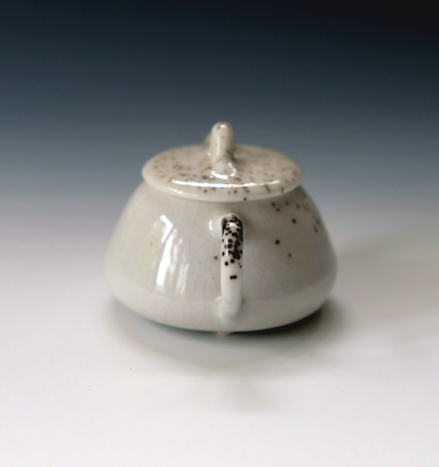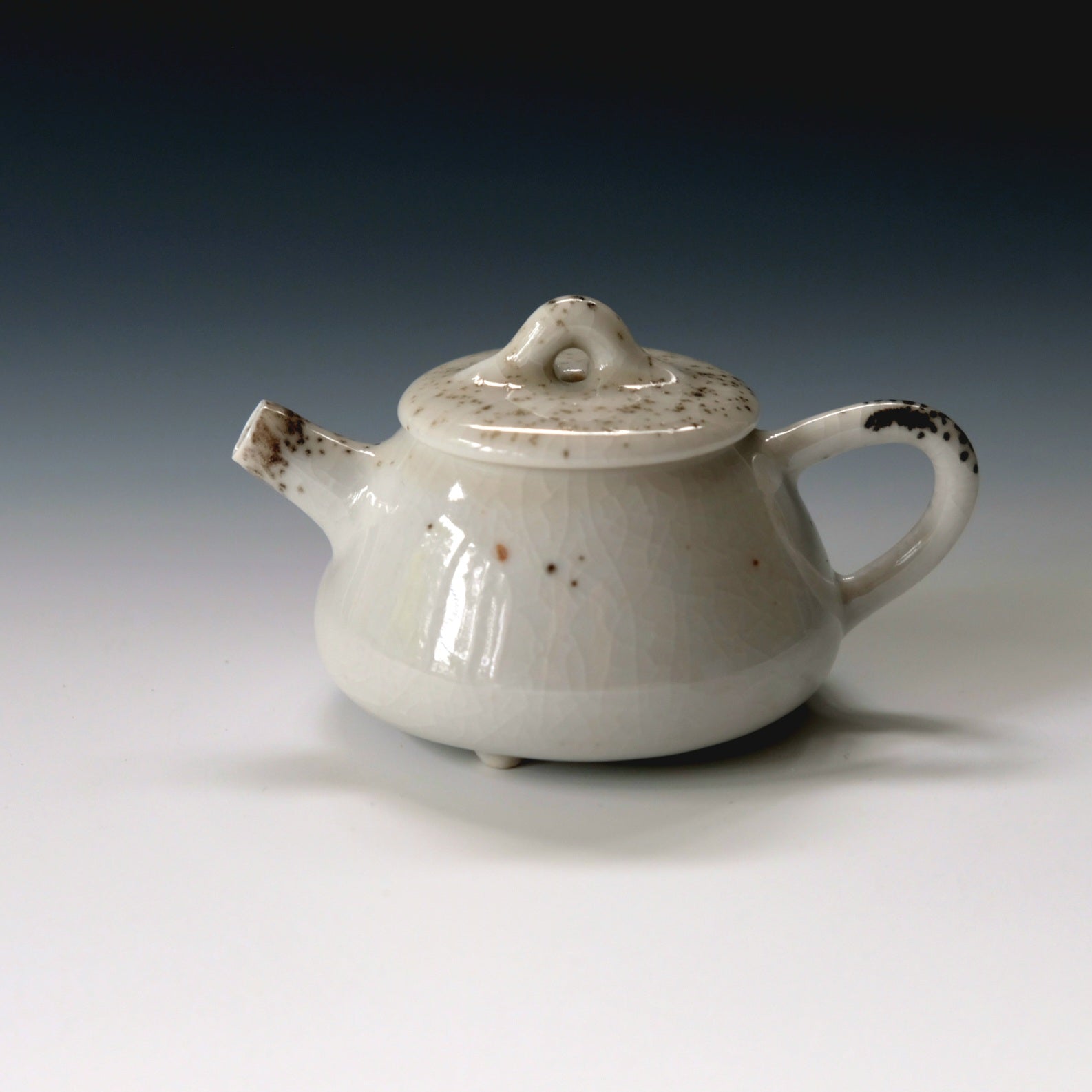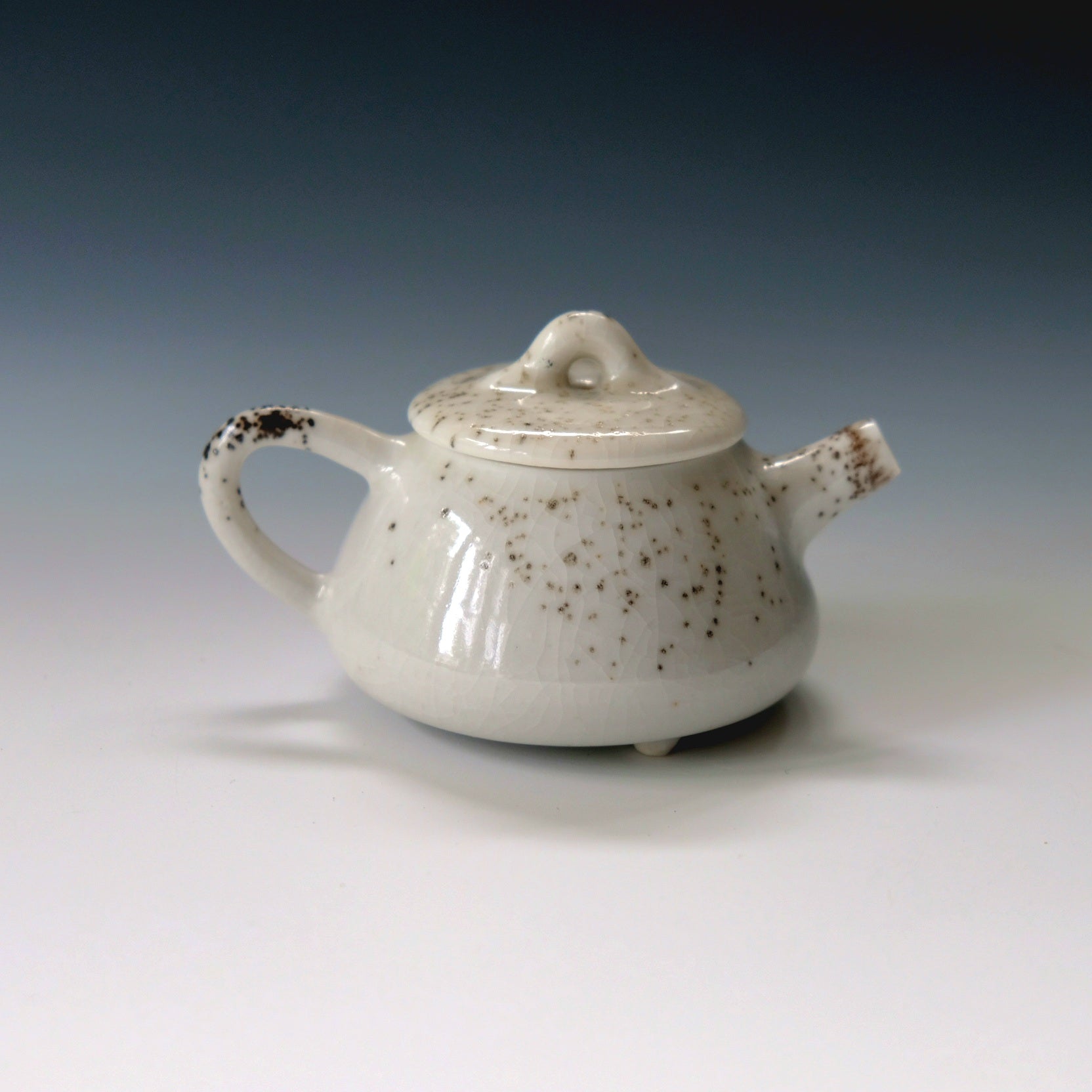 This teapot was handmade by the artist Inge Nielsen and is carbontrap shino glaze over Porcelain. The shino glaze on this teapot displays lovely carbon trapping. It was fired in the studio's kiln to 1260 degrees.