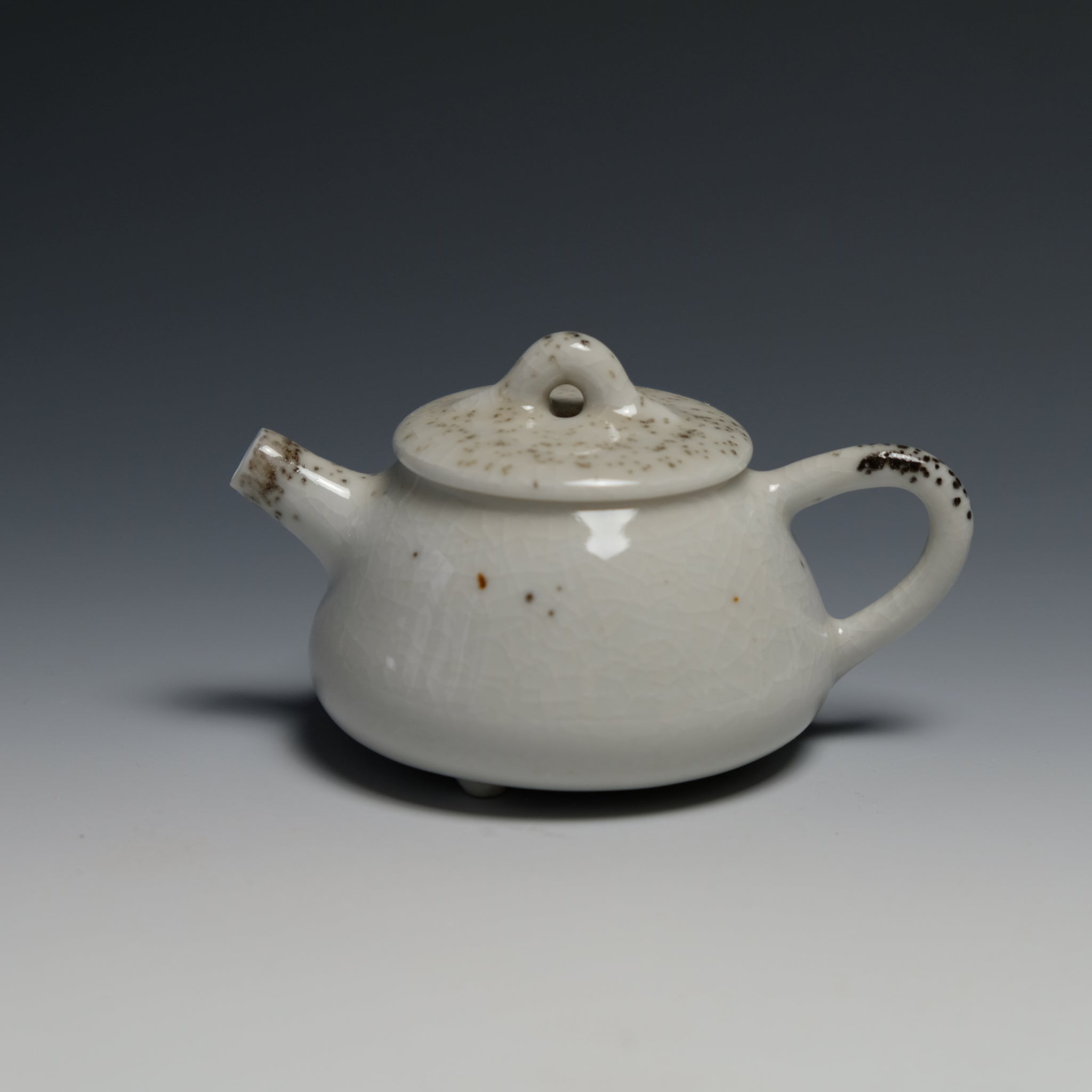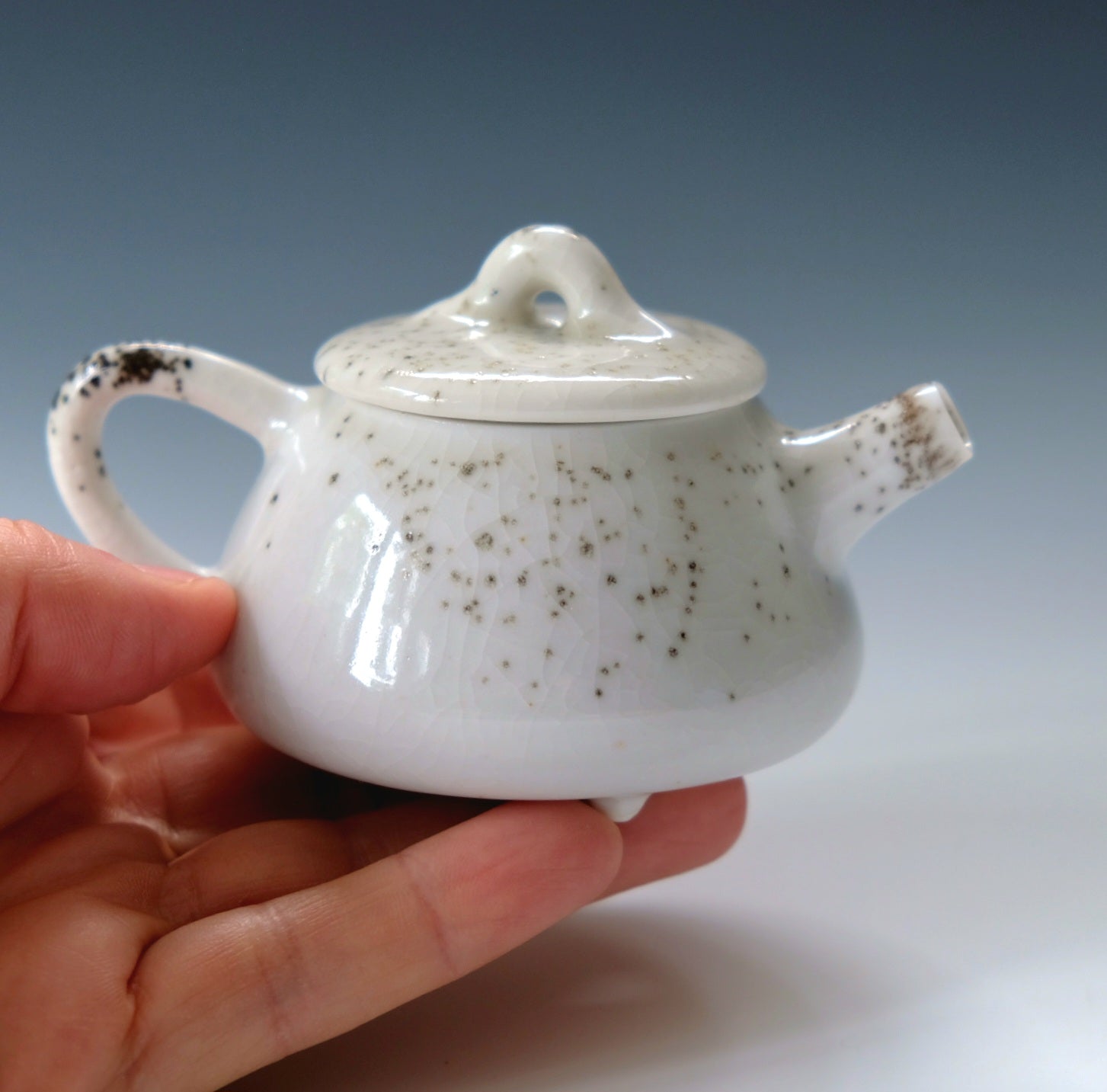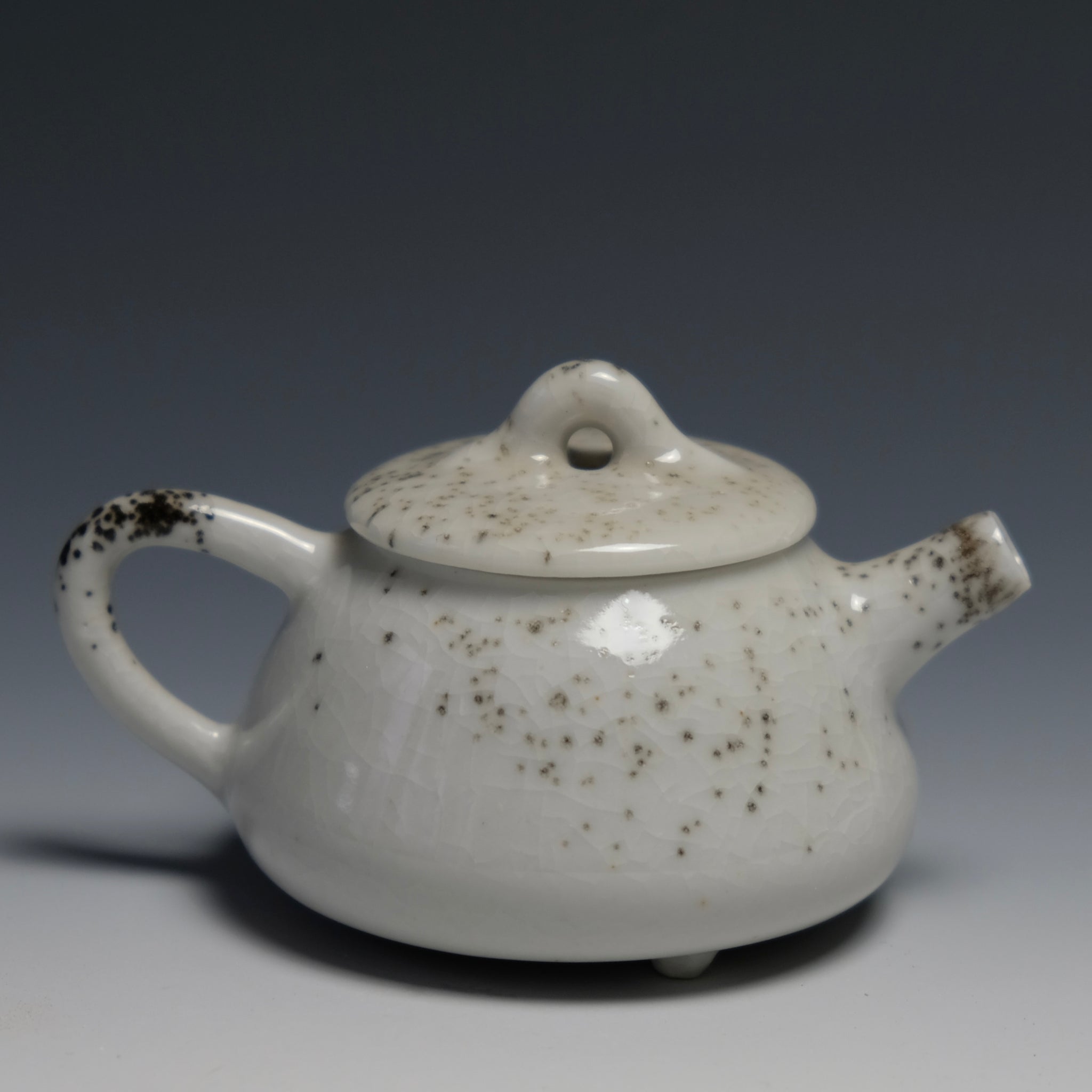 This teapot was handmade by the artist Inge Nielsen and is carbontrap shino glaze over Porcelain. The shino glaze on this teapot displays lovely carbon trapping. It was fired in the studio's kiln to 1260 degrees.