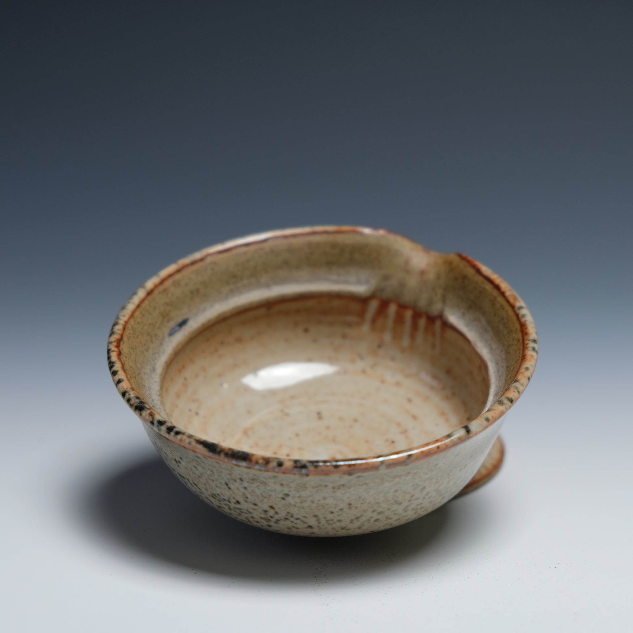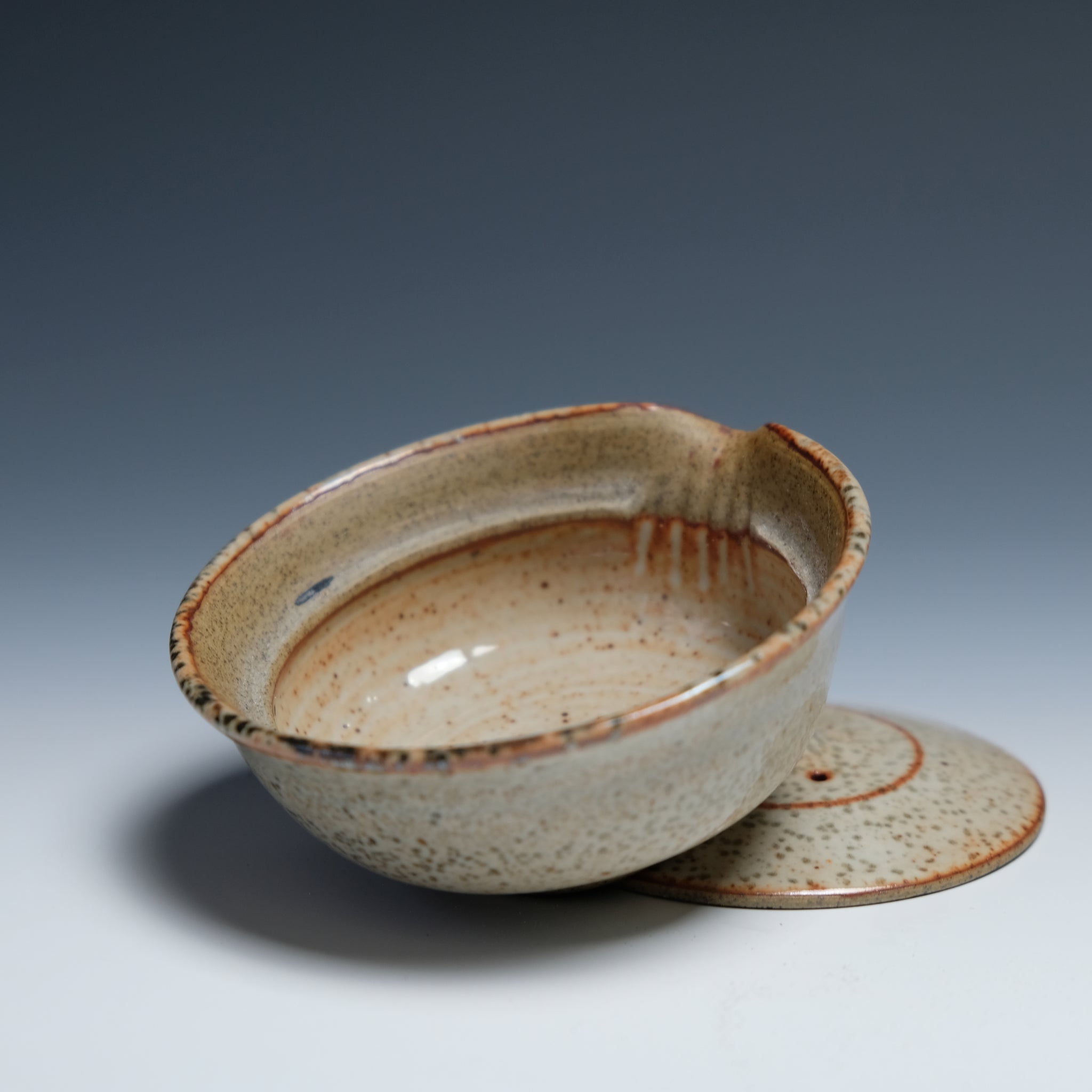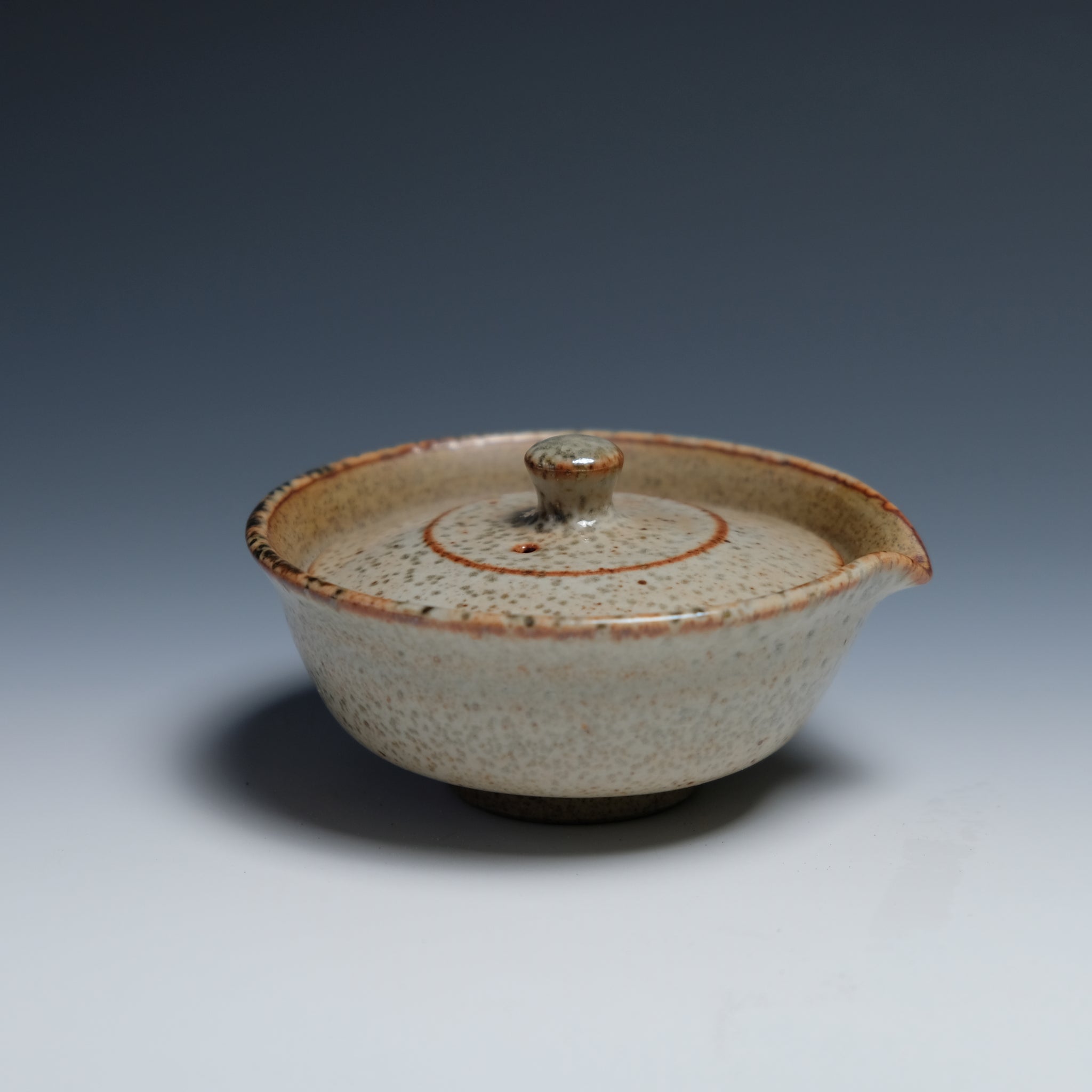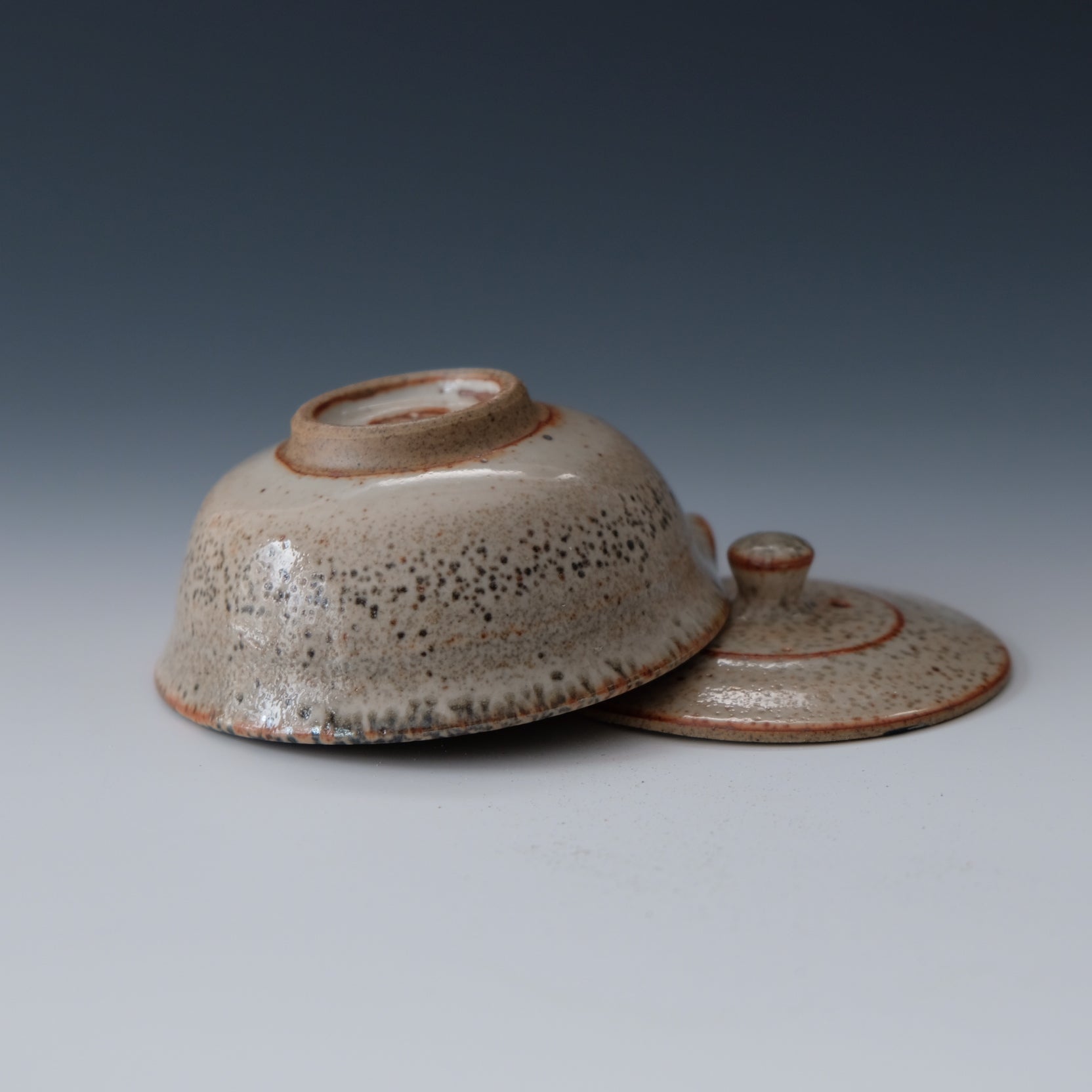 This shiboridashi was handmade by the artist Inge Nielsen and is shino glazed over stoneware and features some lovely carbontrapping on the body. The clay body is a mixture of porcelain and stoneware clay. It was fired in the studio's kiln to 1260 degrees.