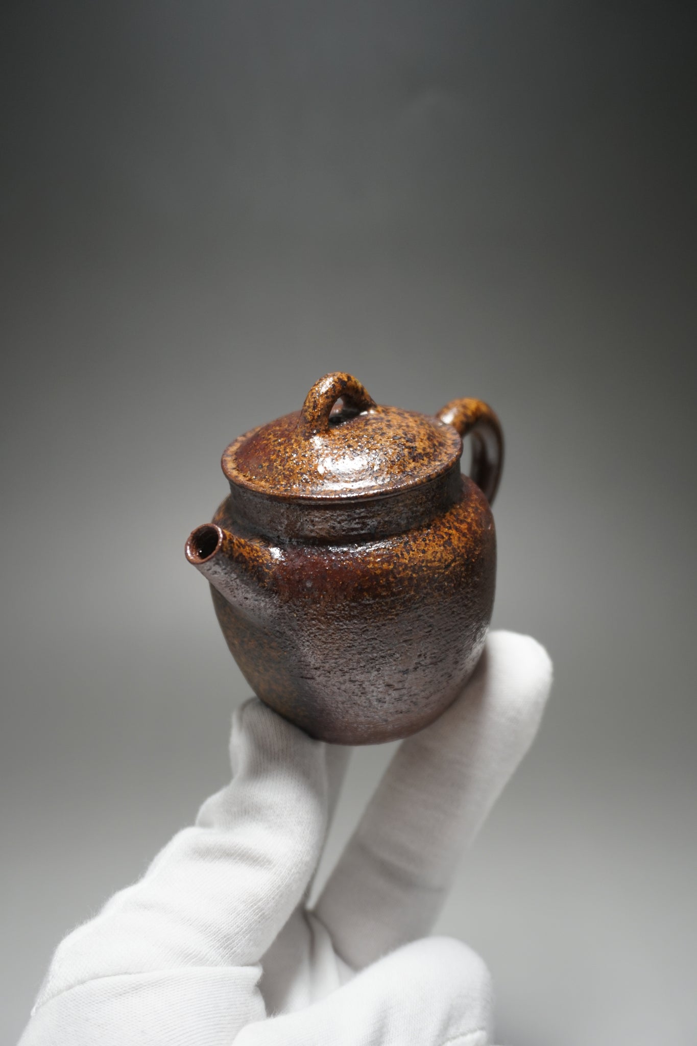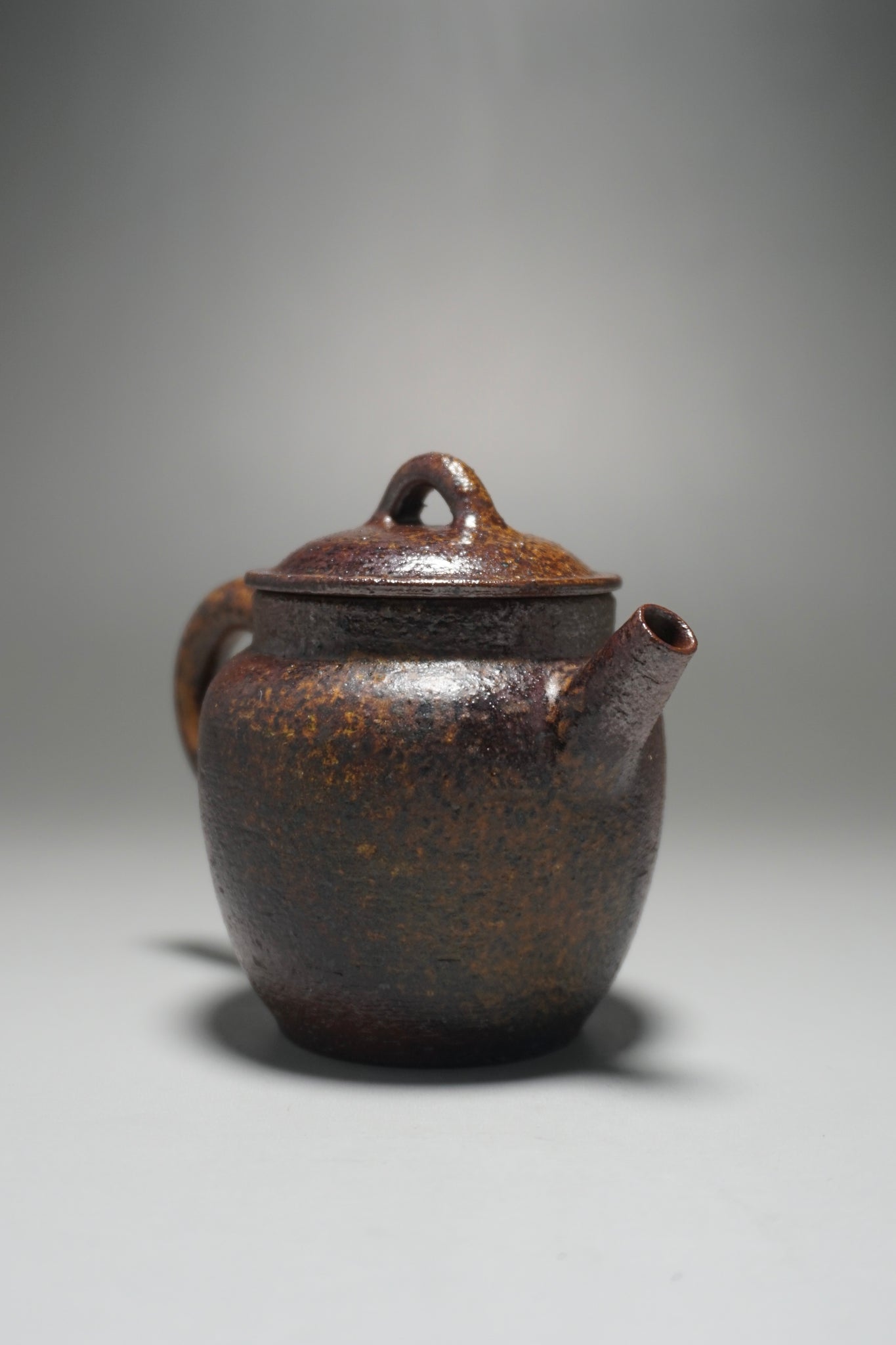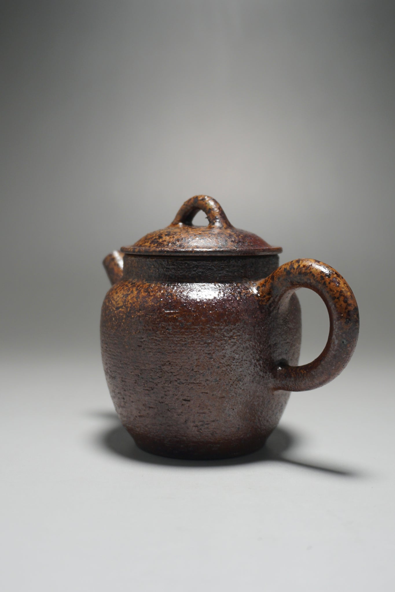 This wood fired teapot features a natural wood ash from being fired uncovered in a wood kiln, as a result areas of the teapot may appear rough or smooth with irregular glazing. Some areas, particularly the bottom of the pot, may appear rougher (see photos).