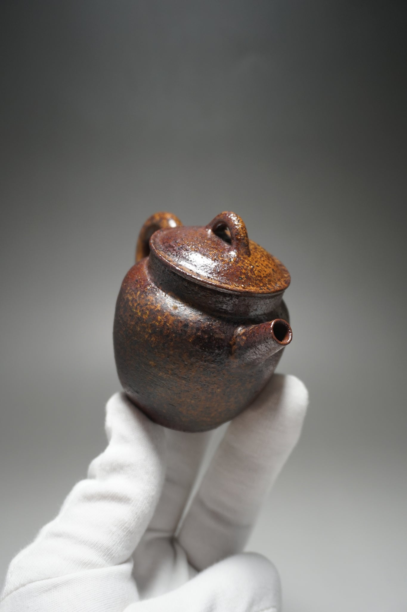 This teapot was fired in the traditional wood kiln of the studio using pine wood as fuel. Firing nixing teapots this way is riskier than in a modern kiln and not all pieces survive the process. The teapot spent around two weeks in the kiln. The different colours and patterns on the surface of the clay are a result of the natural wood ash glaze formed by some of the pine ash when it touches the surface of the clay. The glaze is partial and only on the outside surface, leaving the nixing clay to retain its porous nature.