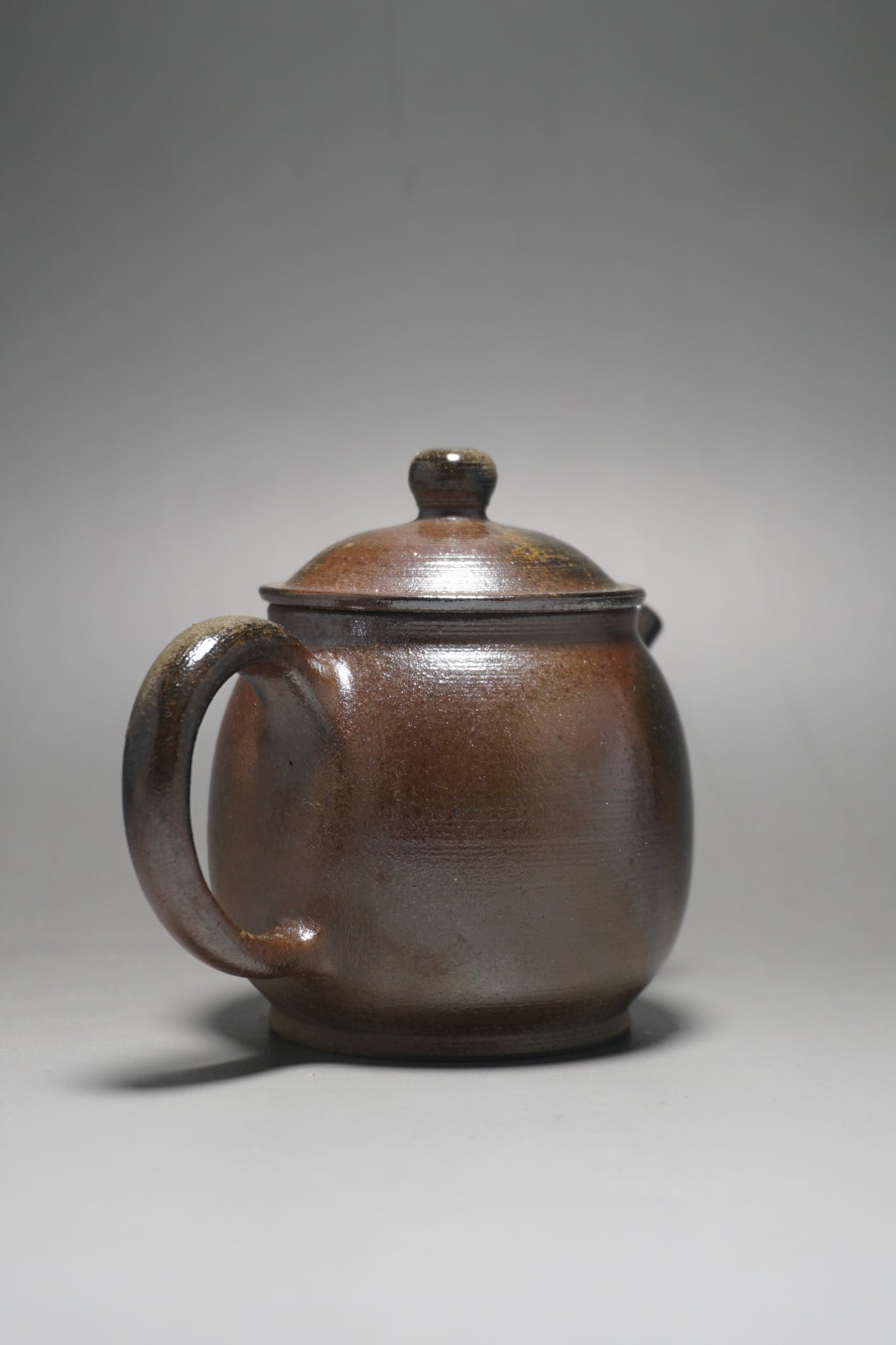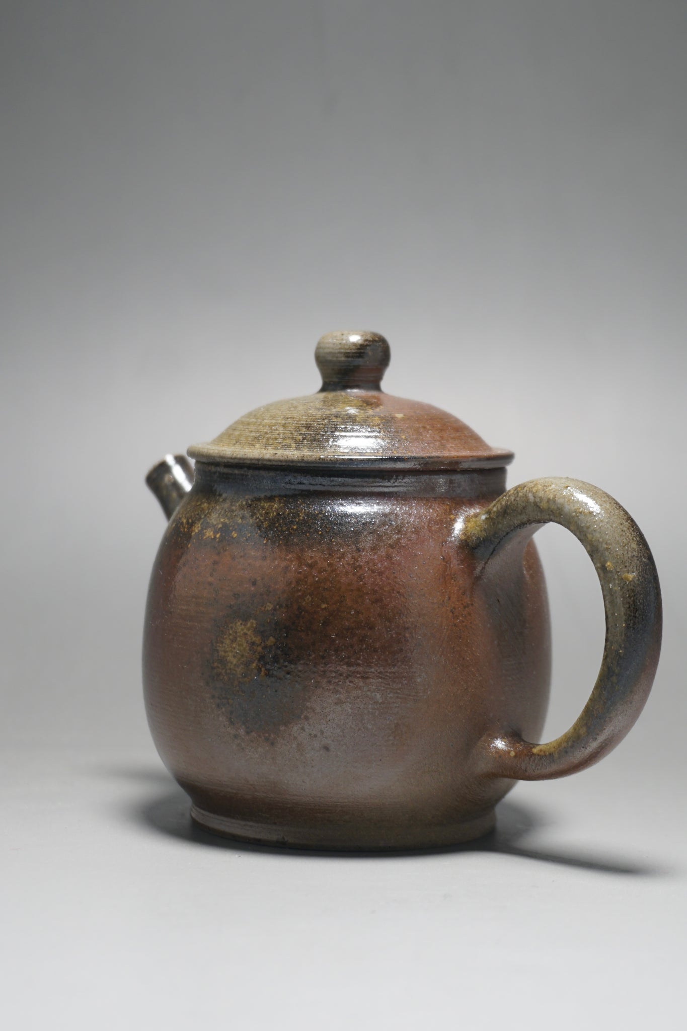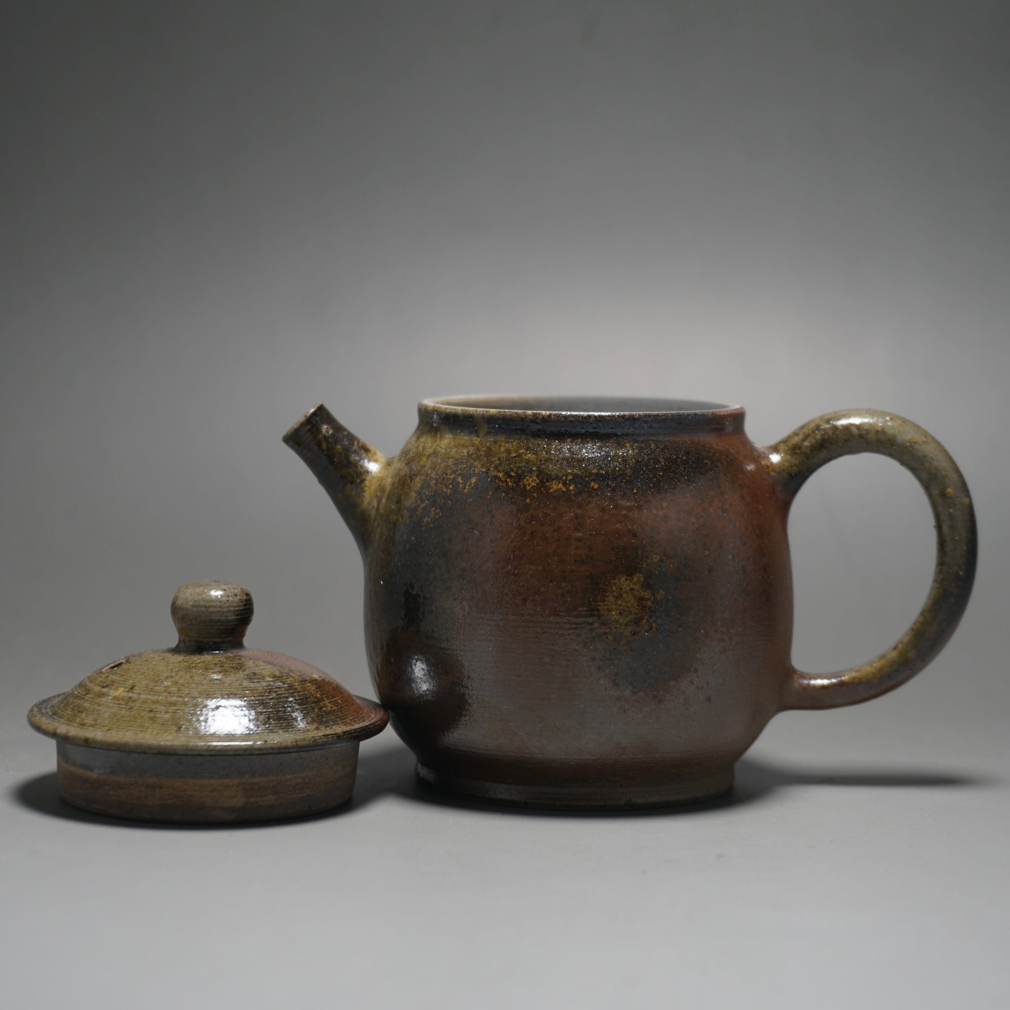This wood fired teapot features a natural wood ash from being fired uncovered in a wood kiln, as a result areas of the teapot may appear rough or smooth with irregular glazing. Some areas, particularly the bottom of the pot, may appear rougher (see photos).