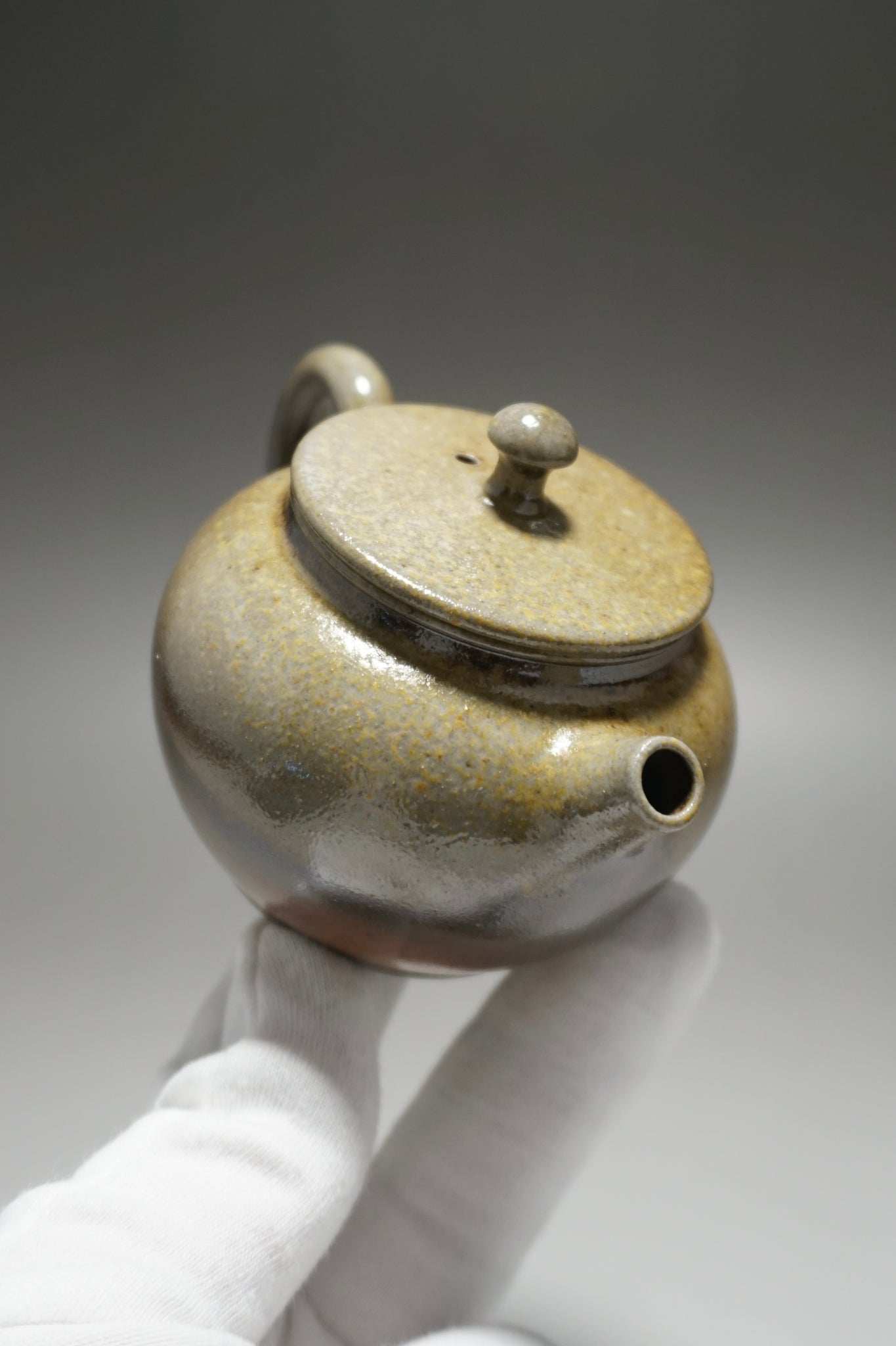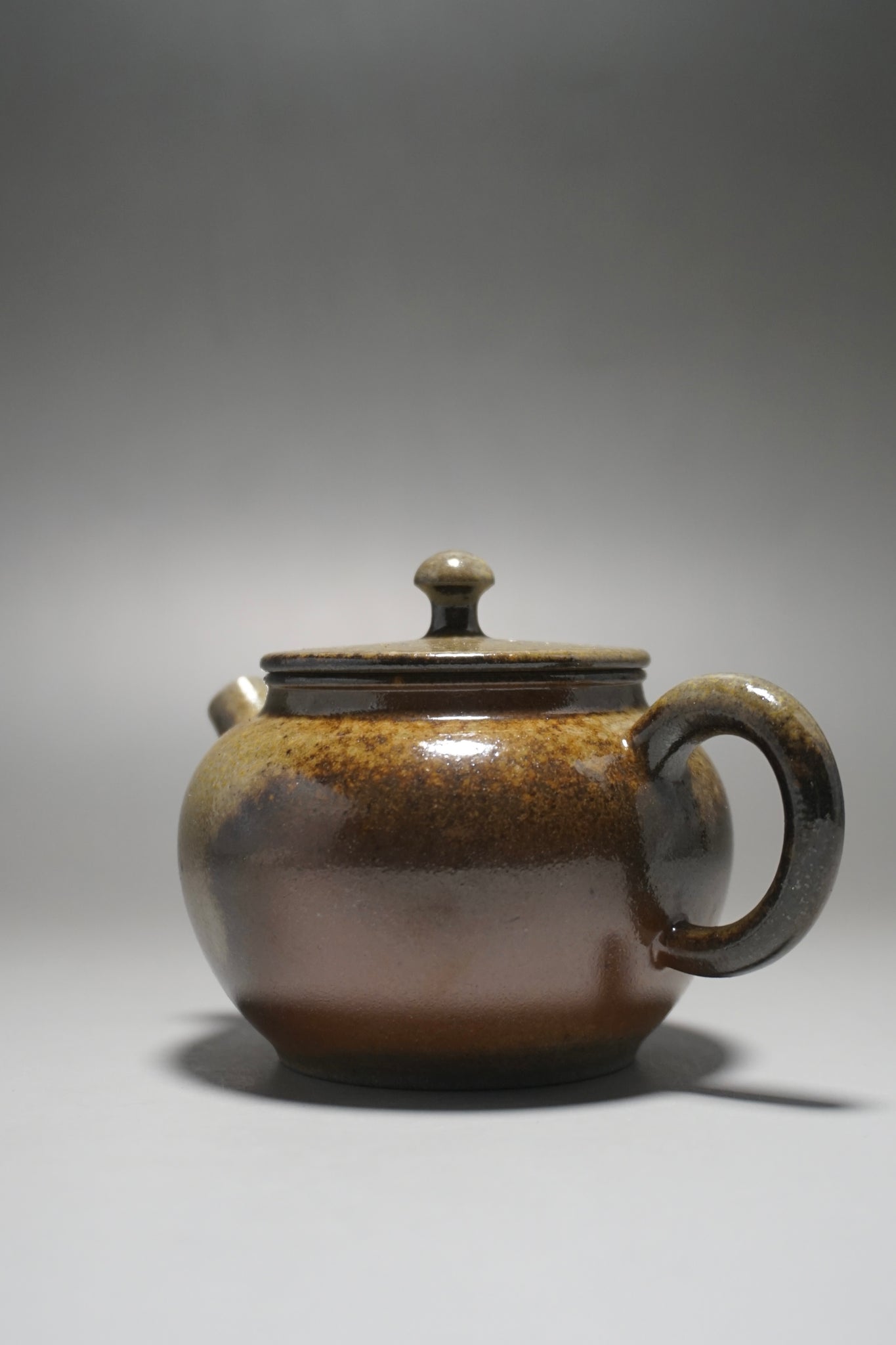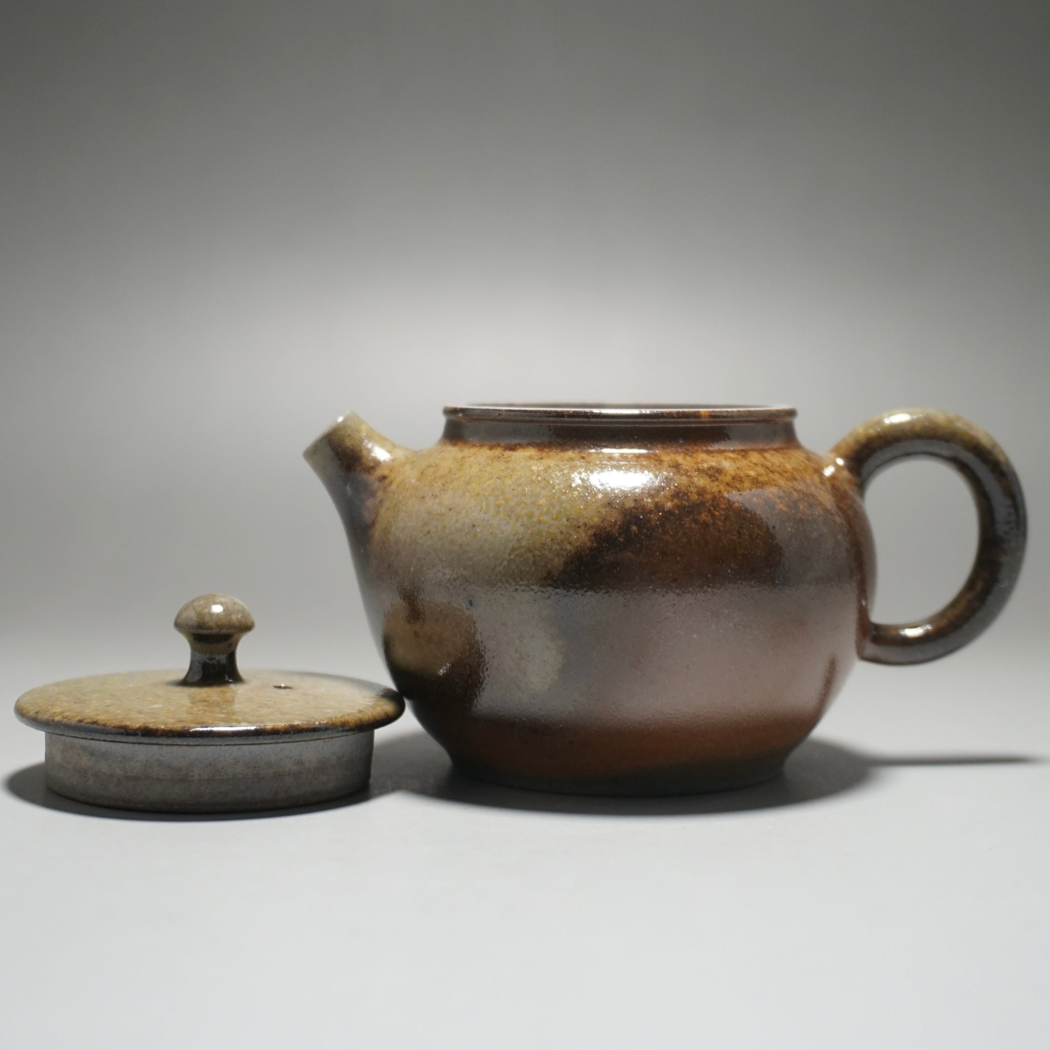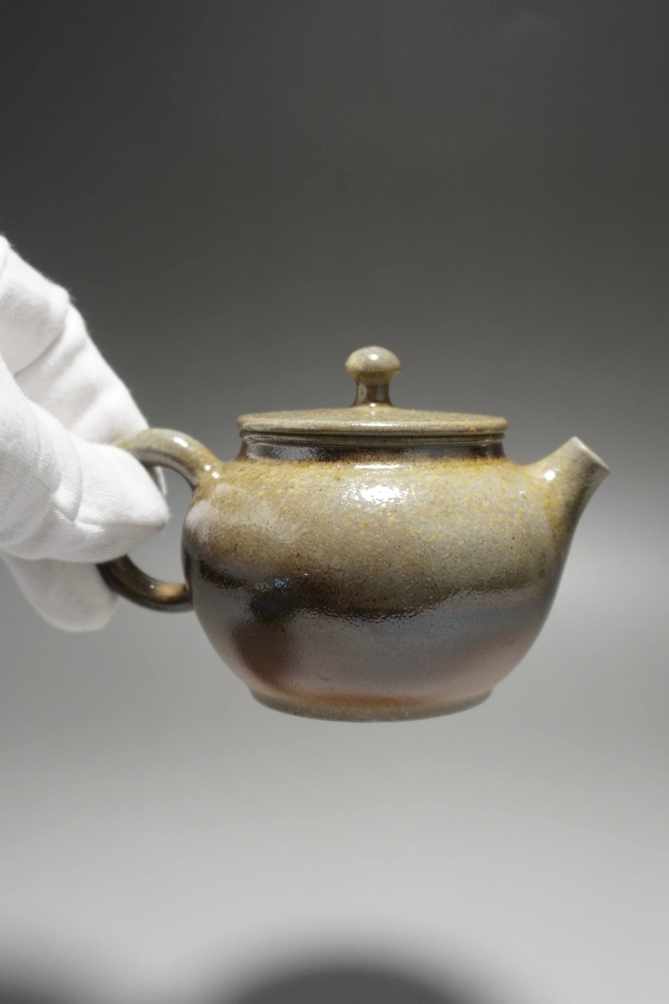 This wood fired teapot features a natural wood ash from being fired uncovered in a wood kiln, as a result areas of the teapot may appear rough or smooth with irregular glazing. Some areas, particularly the bottom of the pot, may appear rougher (see photos).