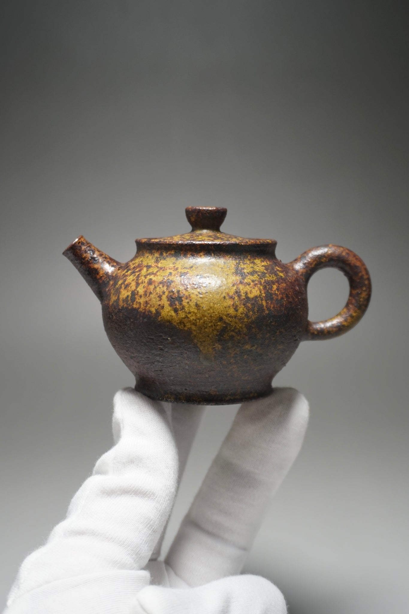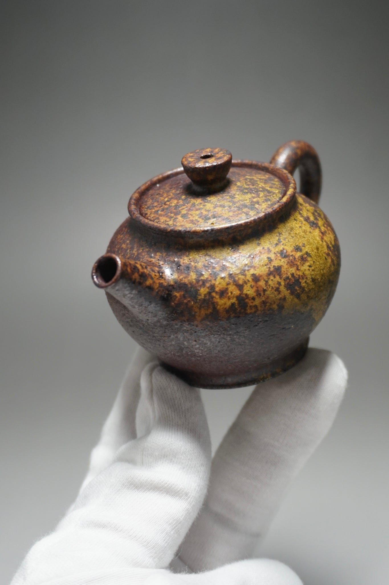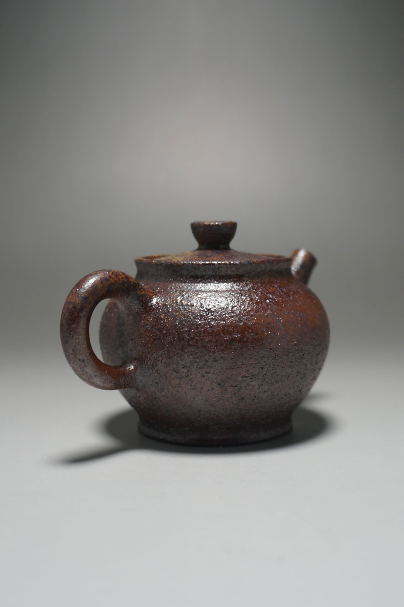 This wood fired teapot features a natural wood ash from being fired uncovered in a wood kiln, as a result areas of the teapot may appear rough or smooth with irregular glazing. Some areas, particularly the bottom of the pot, may appear rougher (see photos).