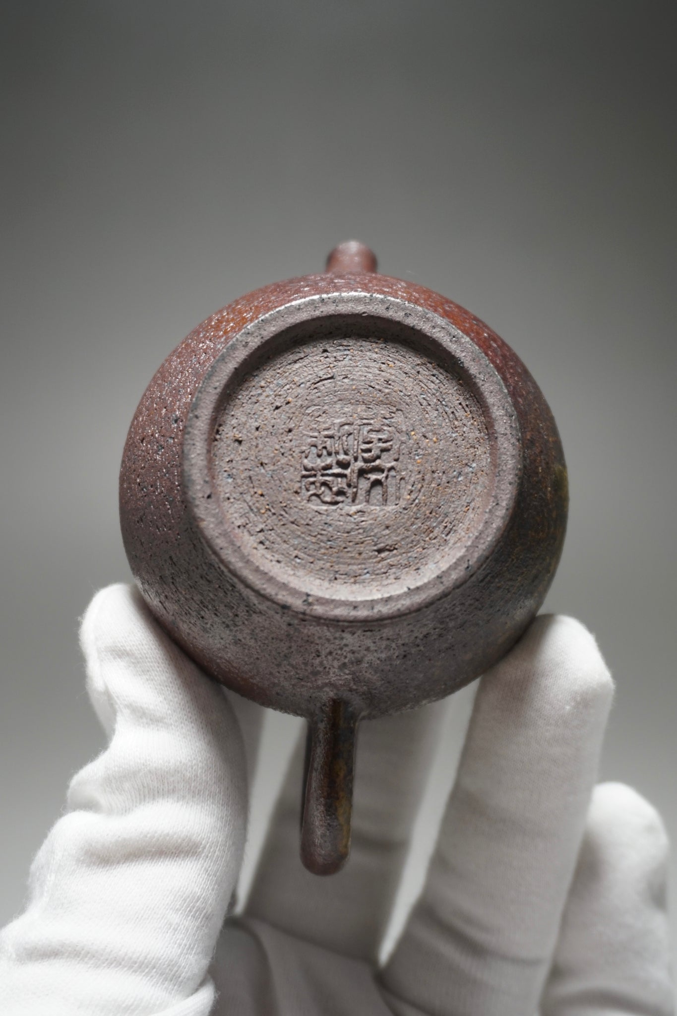 This teapot was fired in the traditional wood kiln of the studio using pine wood as fuel. Firing nixing teapots this way is riskier than in a modern kiln and not all pieces survive the process. The teapot spent around two weeks in the kiln. The different colours and patterns on the surface of the clay are a result of the natural wood ash glaze formed by some of the pine ash when it touches the surface of the clay. The glaze is partial and only on the outside surface, leaving the nixing clay to retain its porous nature.