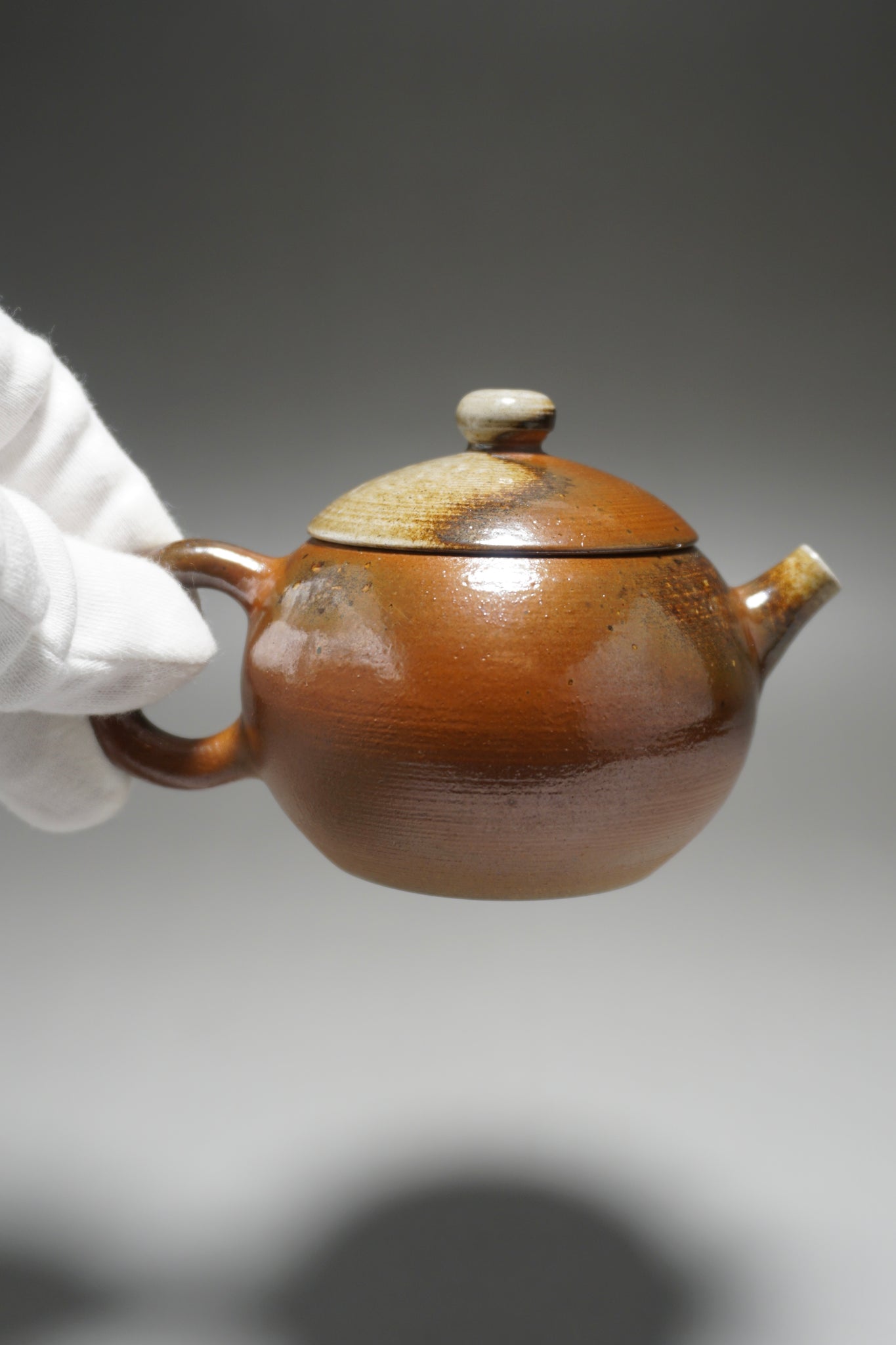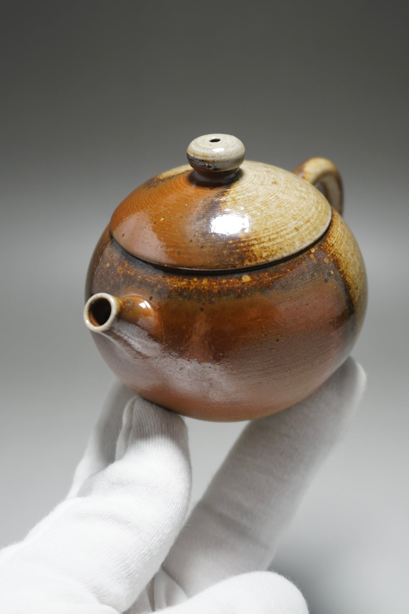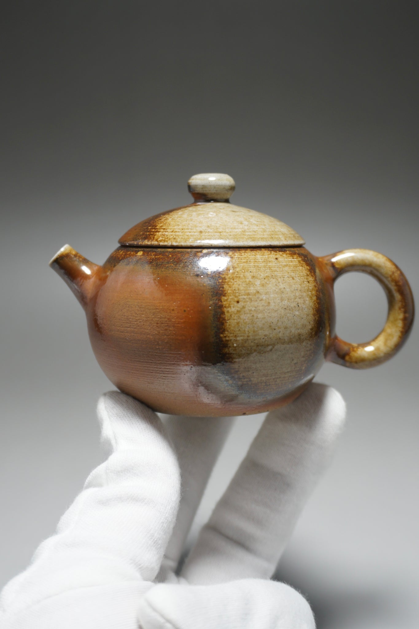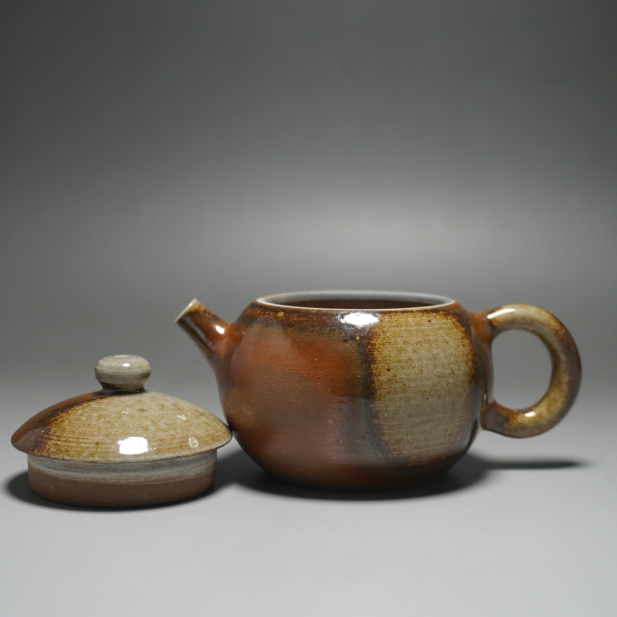 This wood fired teapot features a natural wood ash from being fired uncovered in a wood kiln, as a result areas of the teapot may appear rough or smooth with irregular glazing. Some areas, particularly the bottom of the pot, may appear rougher (see photos).