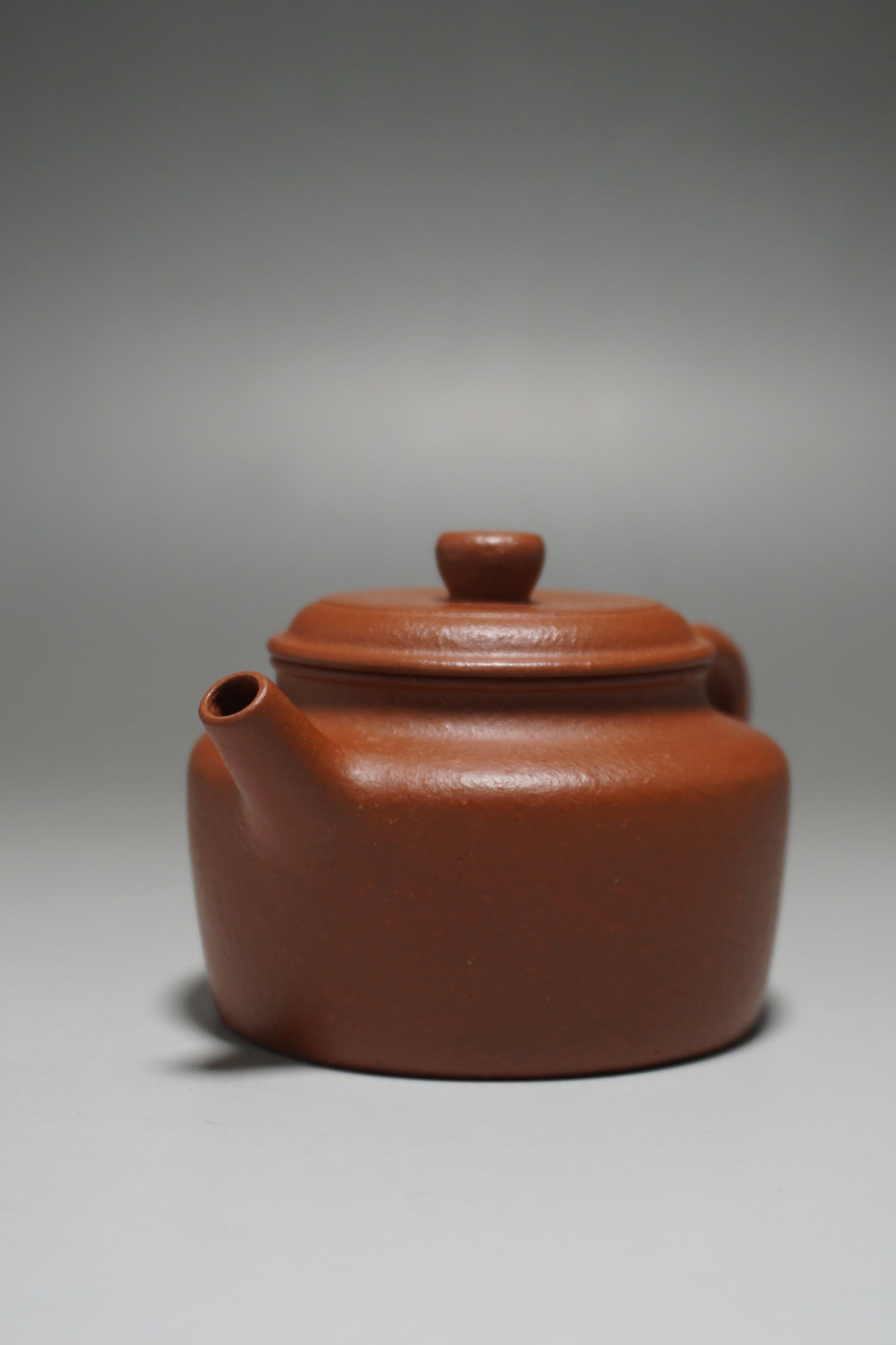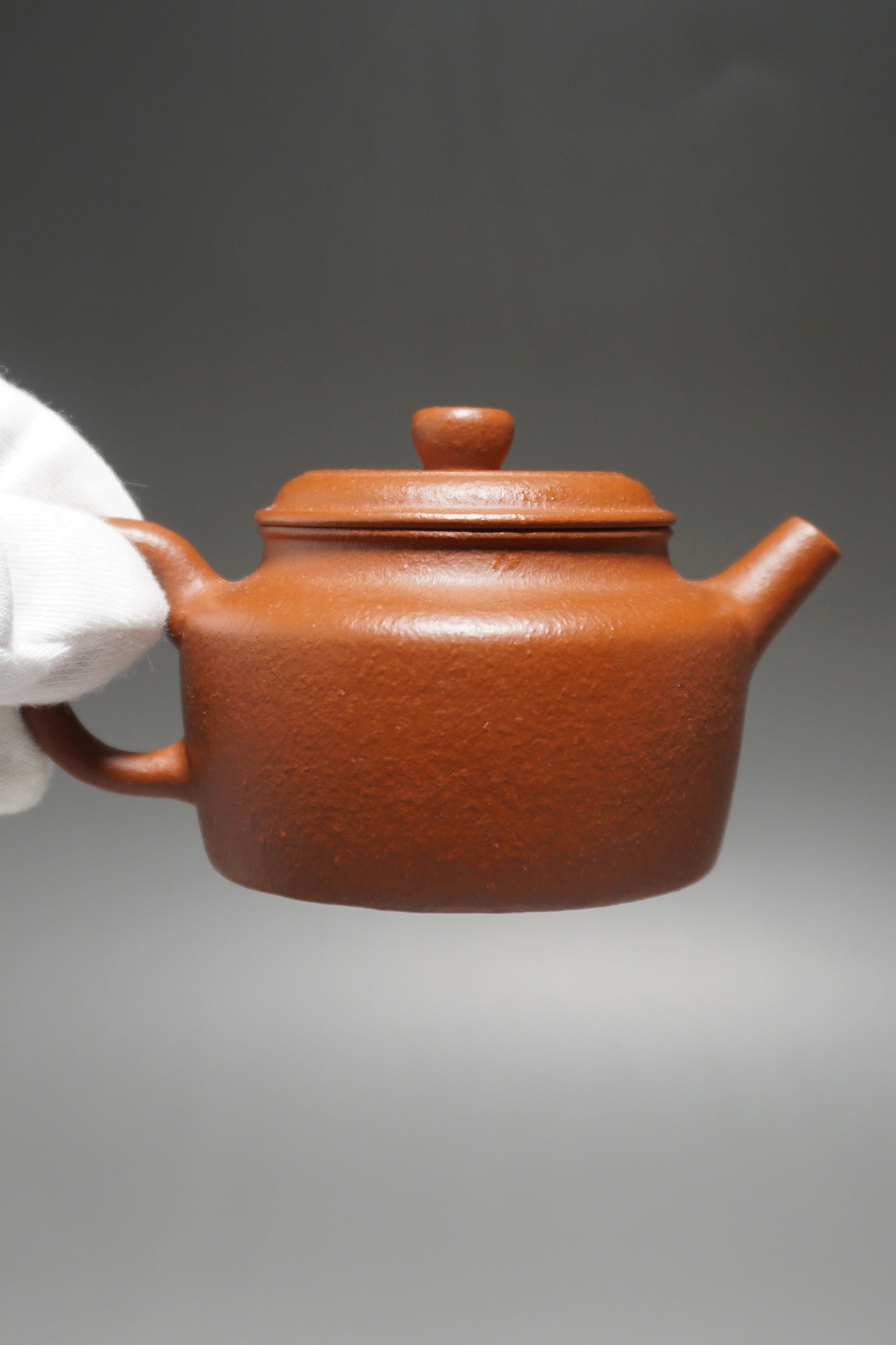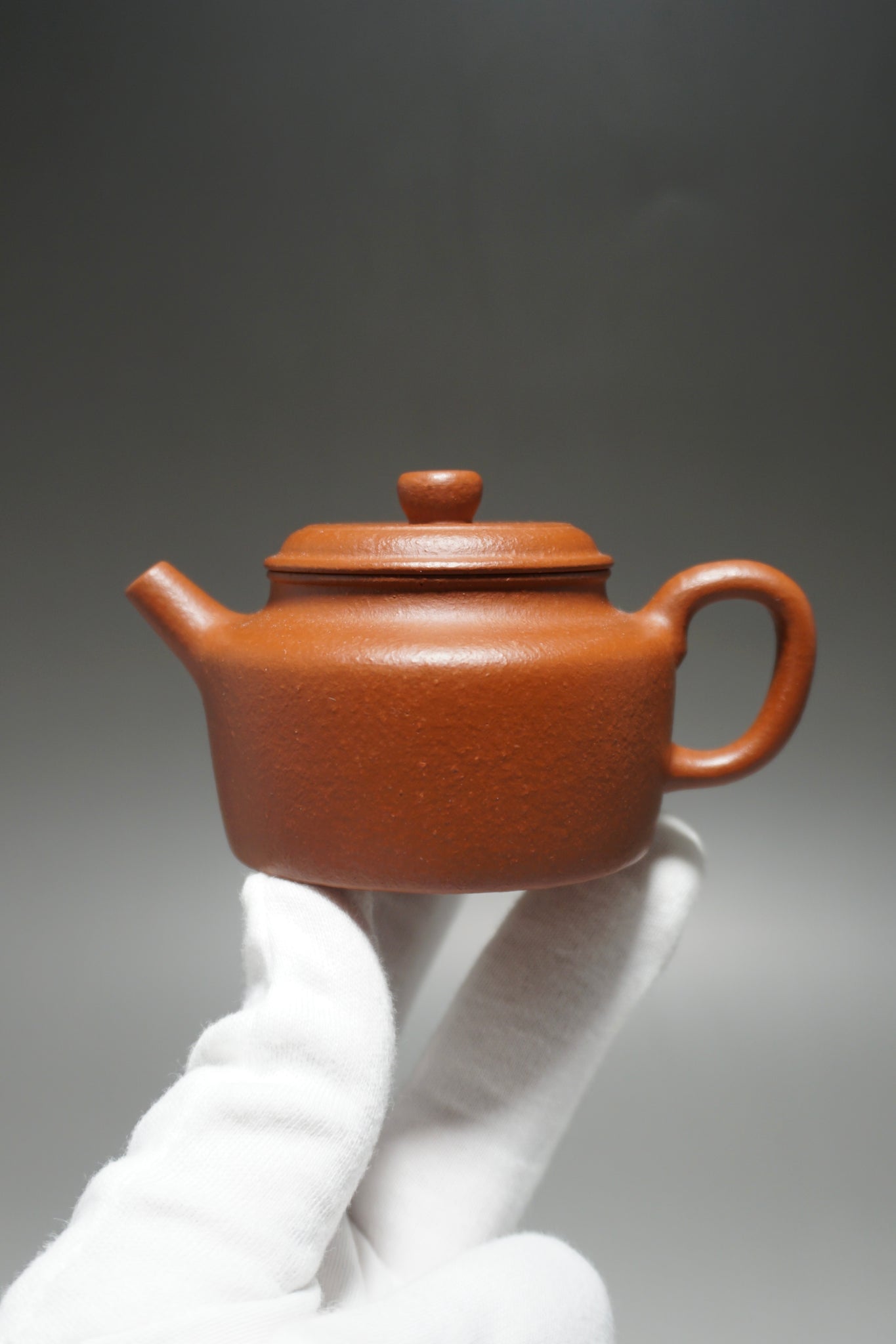 This is an yixing teapot made from a rare type of zhuni clay known as Zhuni Dahongpao. The ratio of dahongpao ore to regular zhuni ore is said to be 1:100, or 1kg of zhuni dahongpao ore for every 100kg of zhuni ore. Dahongpao zhuni has a greater amount of Fe2O3 iron oxide than regular zhuni giving it a deeper red-orange hue. It also contains a lower percentage of Al2O3 aluminum oxide than regular zhuni, making it more difficult to fire without breaking. The range of temperature for firing dahongpao zhuni successfully is very narrow. It also has a higher shrink rate than regular zhuni, sometimes shrinking as much as 40%.