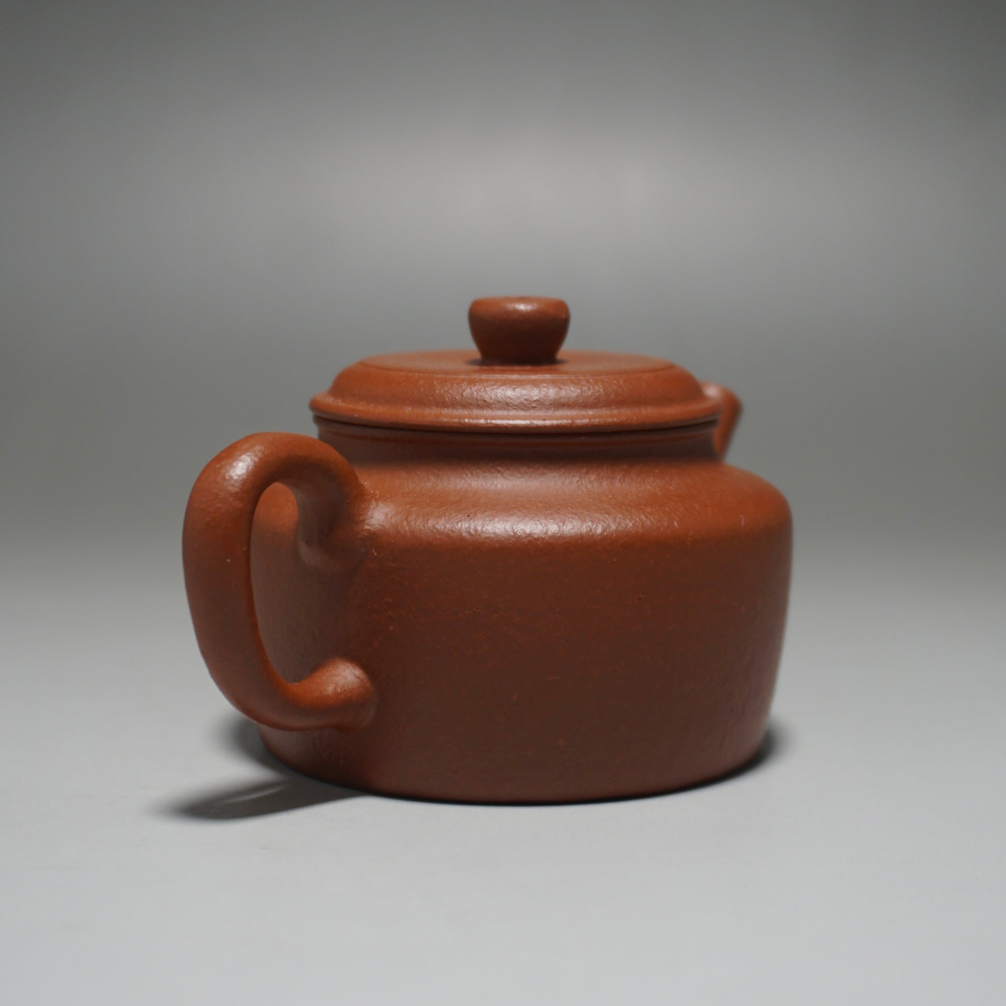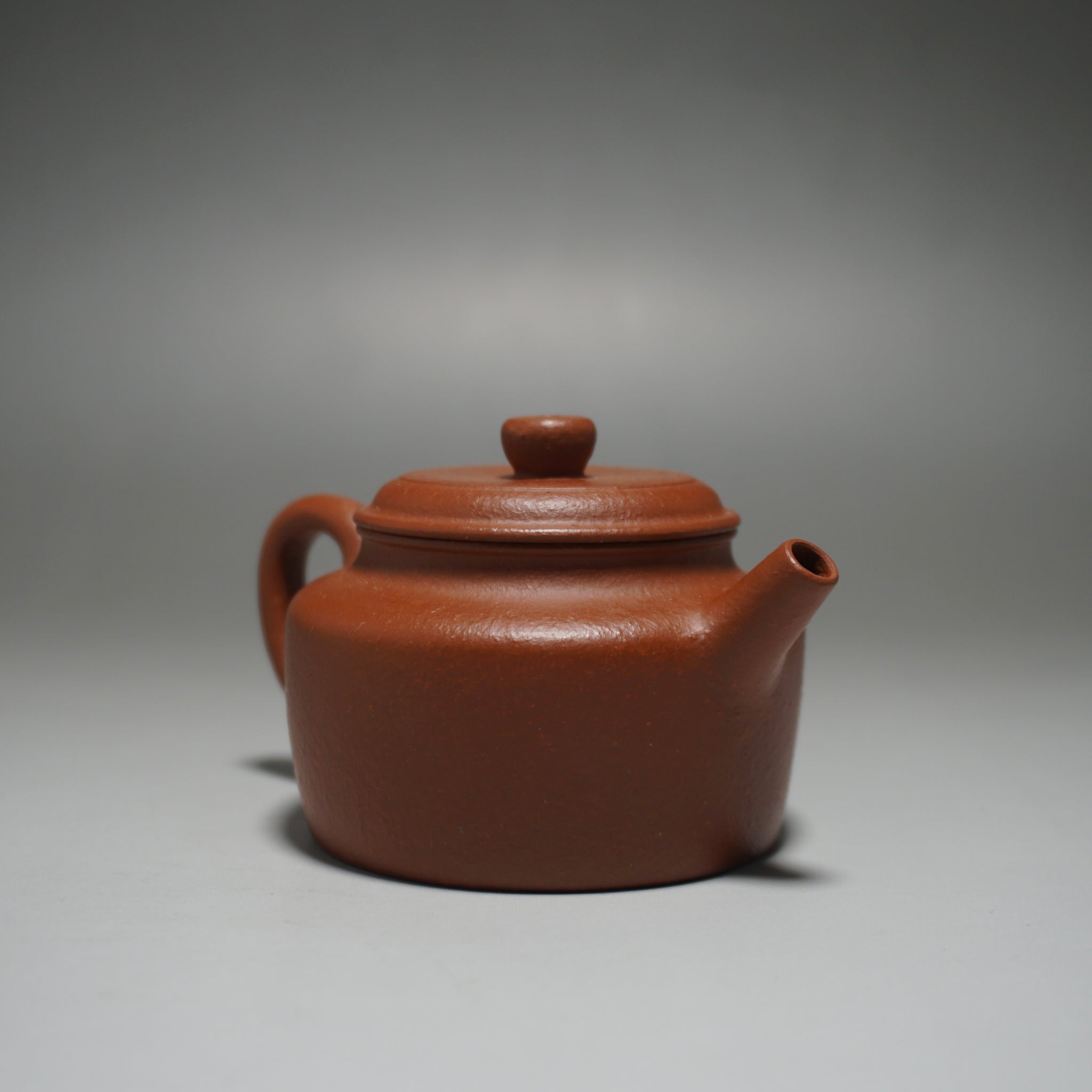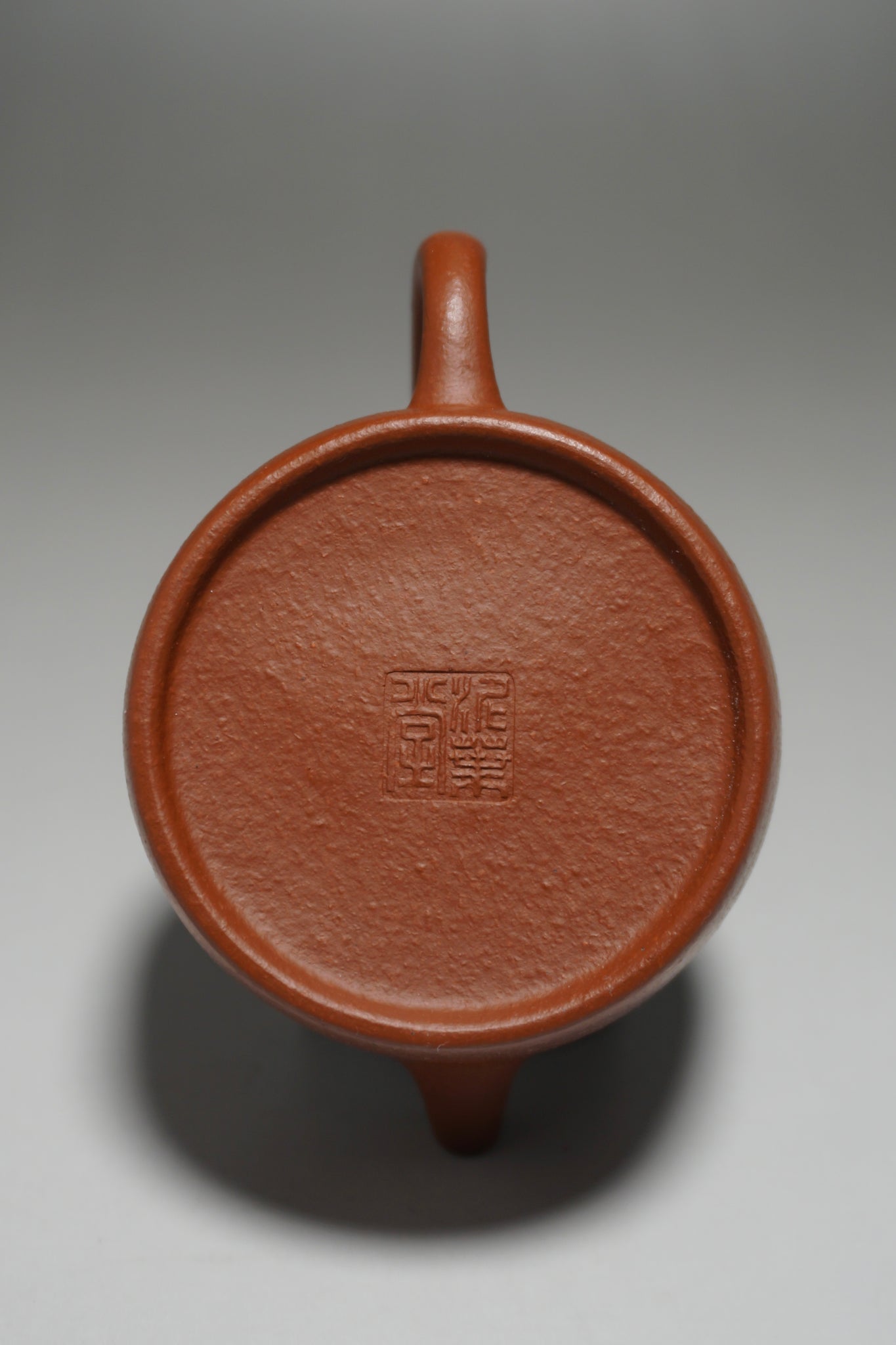 This is an yixing teapot made from a rare type of zhuni clay known as Zhuni Dahongpao. The ratio of dahongpao ore to regular zhuni ore is said to be 1:100, or 1kg of zhuni dahongpao ore for every 100kg of zhuni ore. Dahongpao zhuni has a greater amount of Fe2O3 iron oxide than regular zhuni giving it a deeper red-orange hue. It also contains a lower percentage of Al2O3 aluminum oxide than regular zhuni, making it more difficult to fire without breaking. The range of temperature for firing dahongpao zhuni successfully is very narrow. It also has a higher shrink rate than regular zhuni, sometimes shrinking as much as 40%.