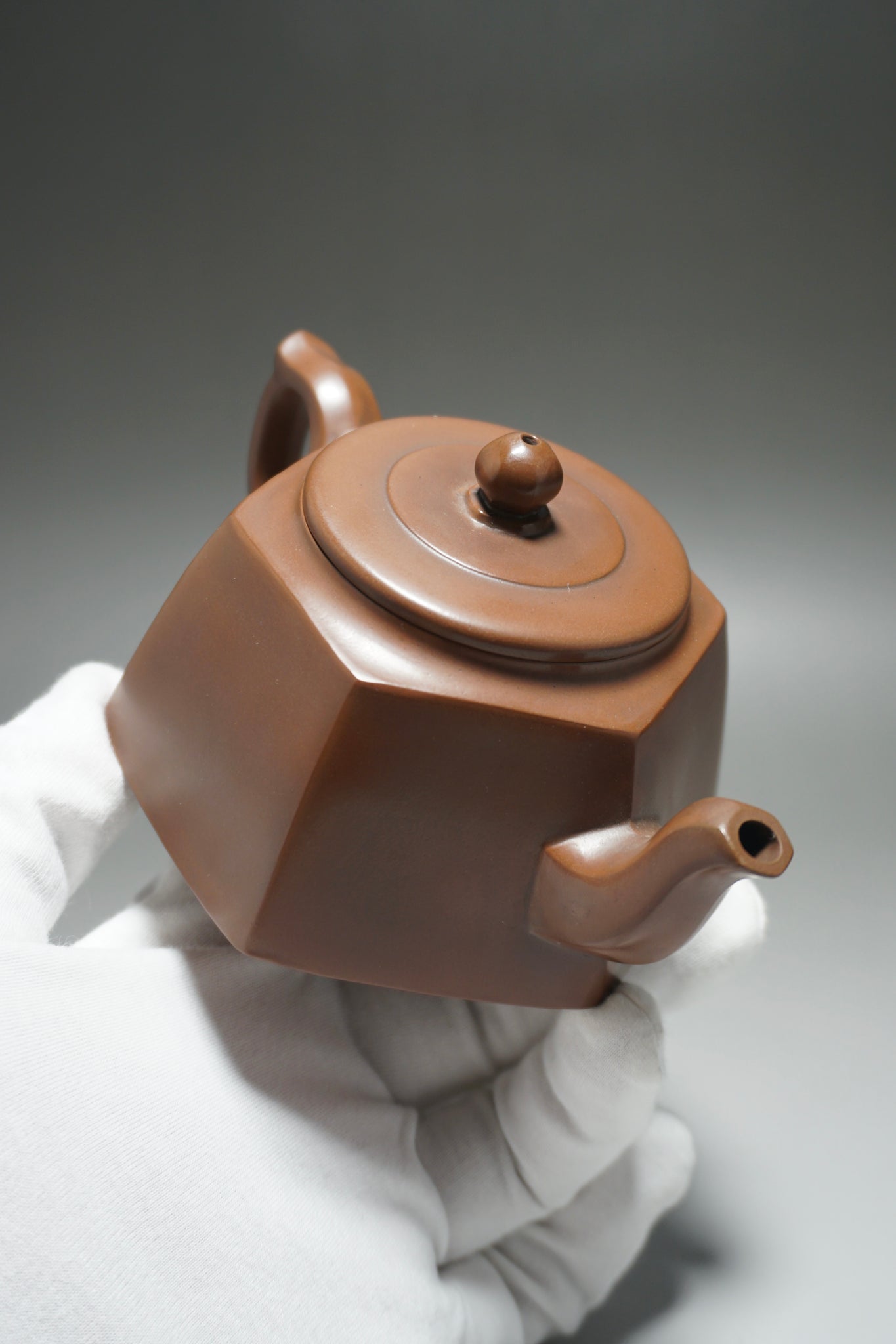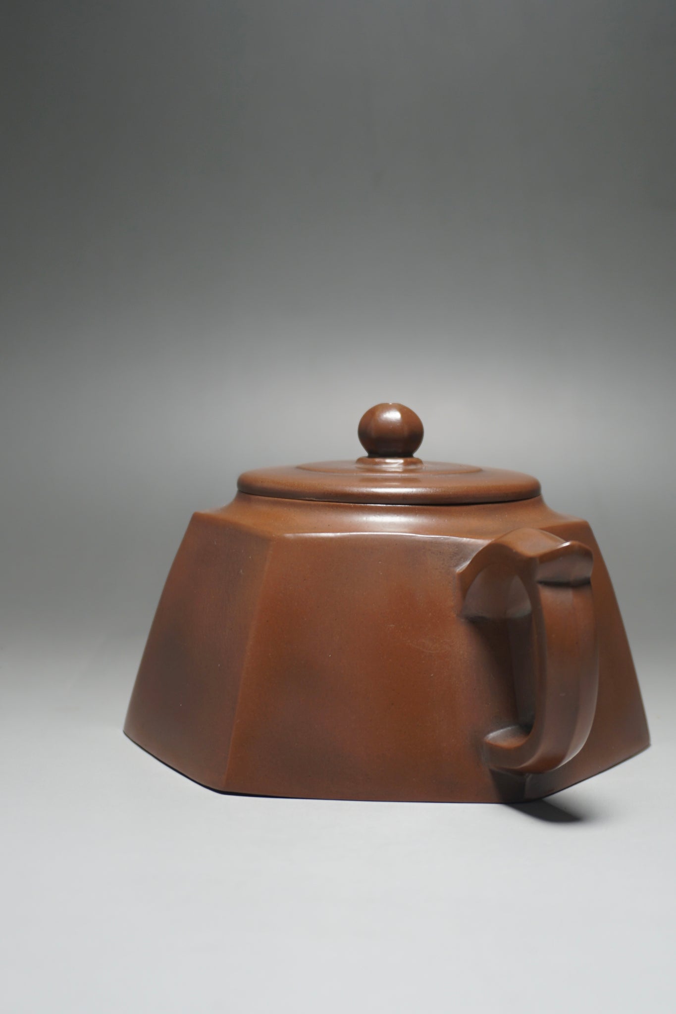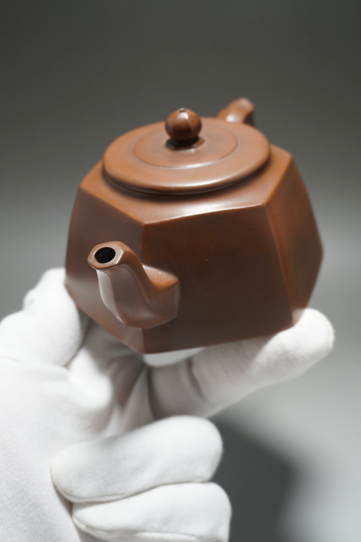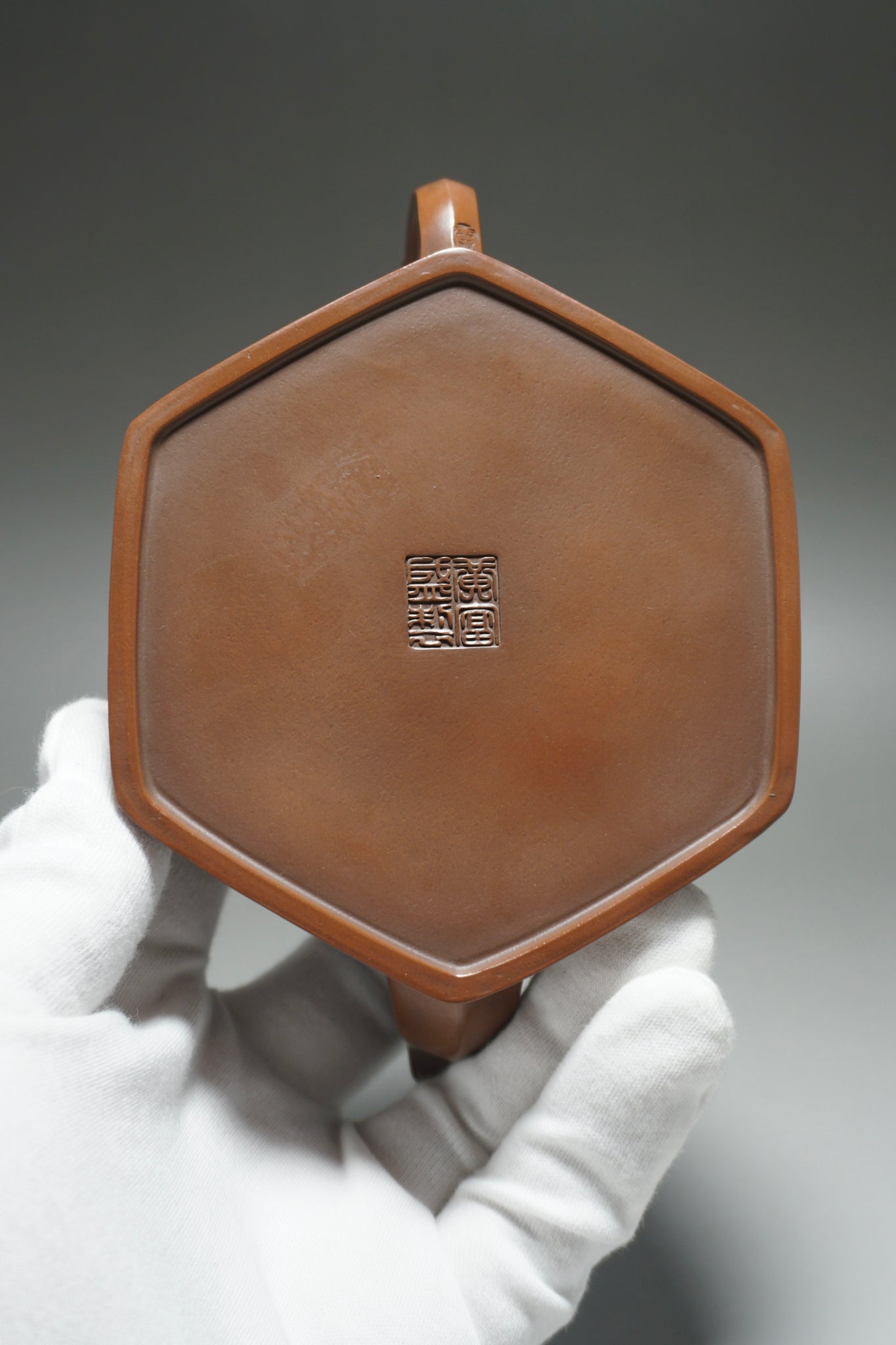 While most nixing teapots are hand wheeled, this teapot was made in the same manner as fully handmade Yixing Teapots due to the hexagon shape of the pot. Slabs were shaped and connected by hand. This shape takes great skill to execute properly.