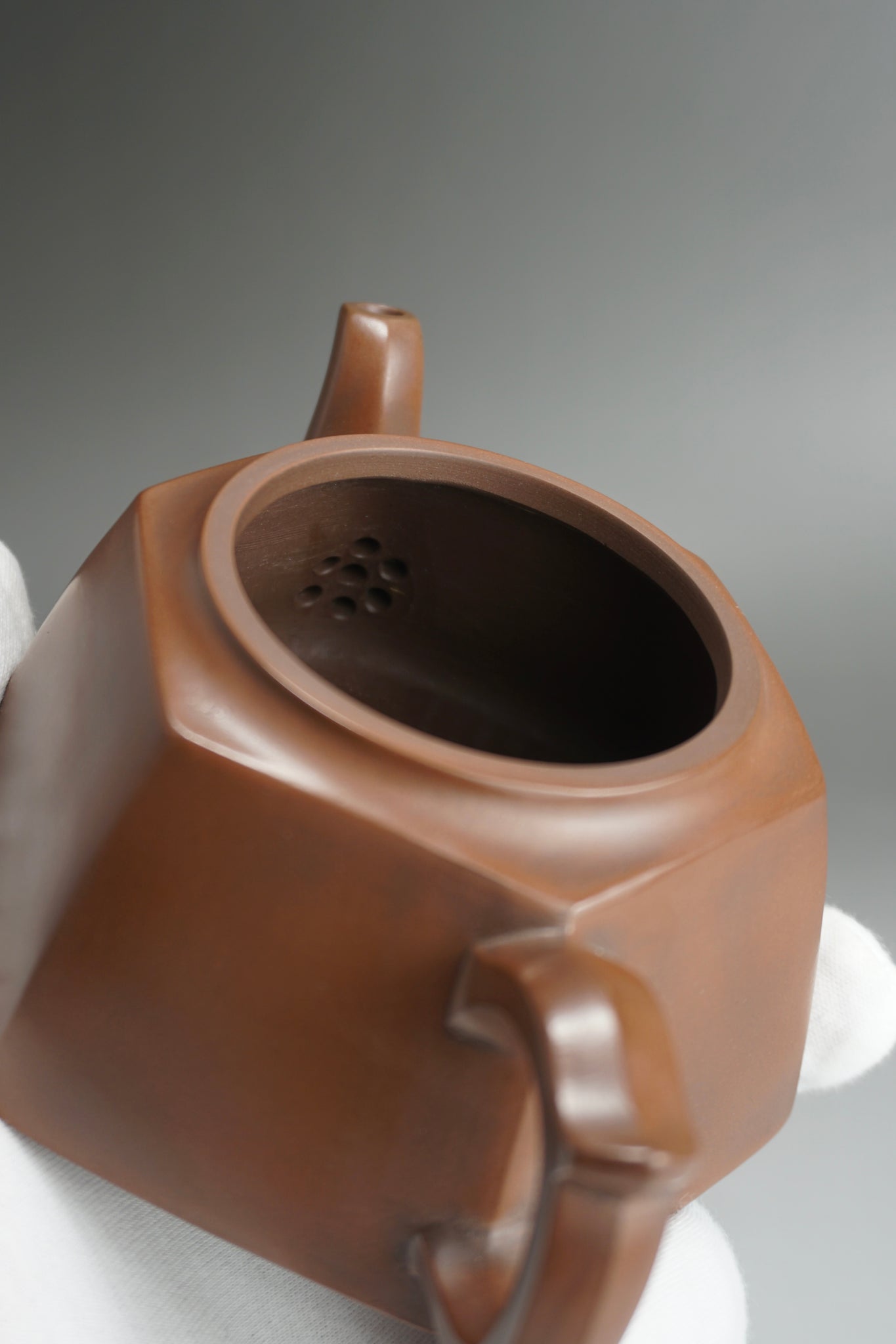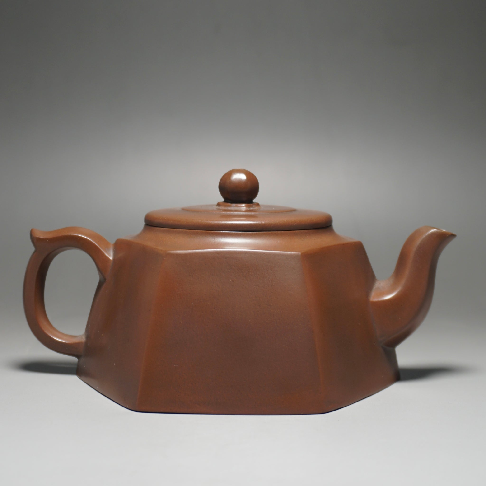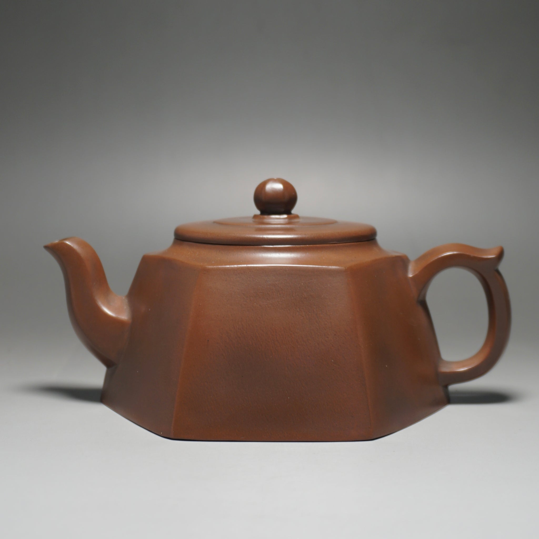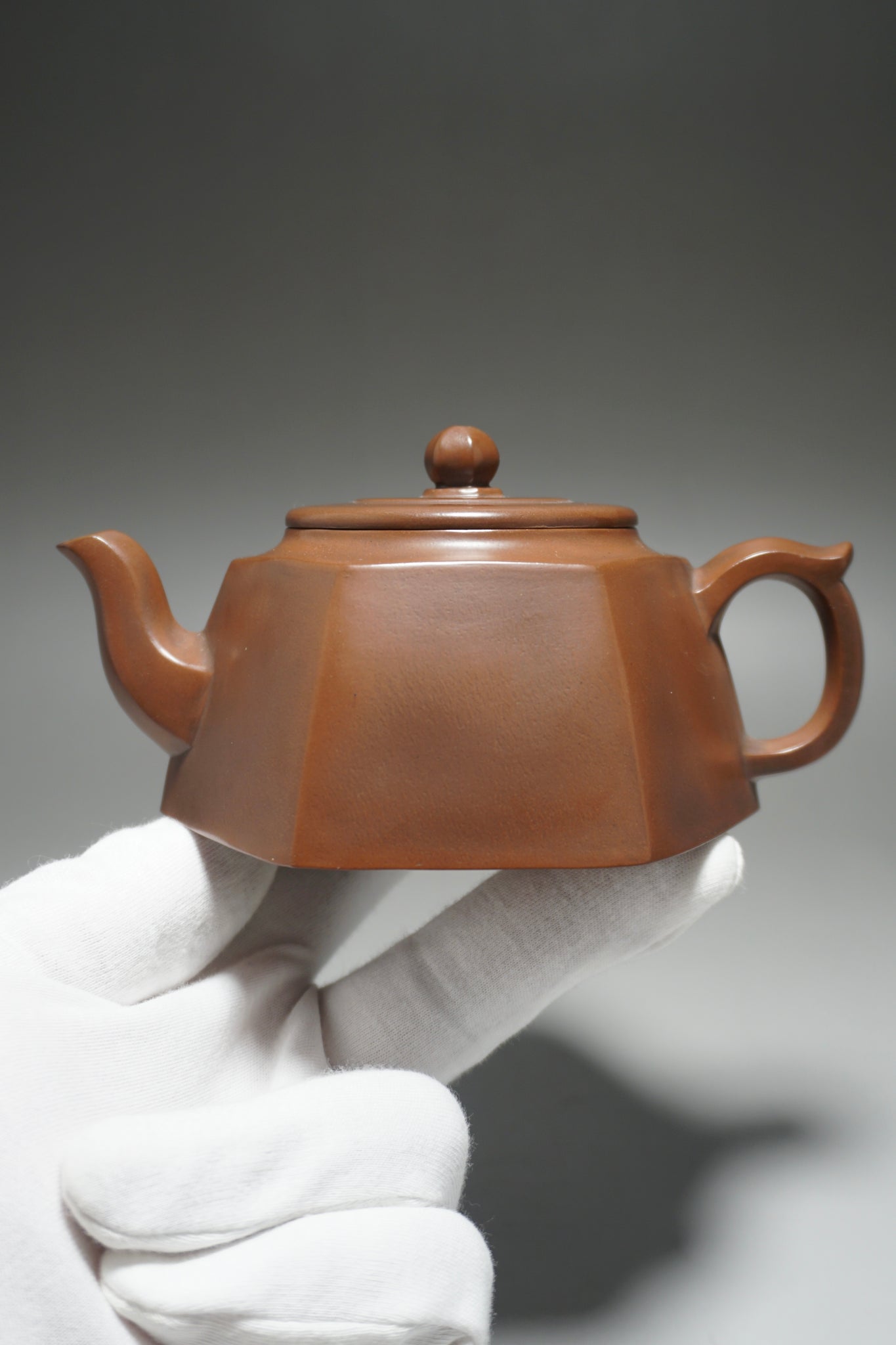 While most nixing teapots are hand wheeled, this teapot was made in the same manner as fully handmade Yixing Teapots due to the hexagon shape of the pot. Slabs were shaped and connected by hand. This shape takes great skill to execute properly.