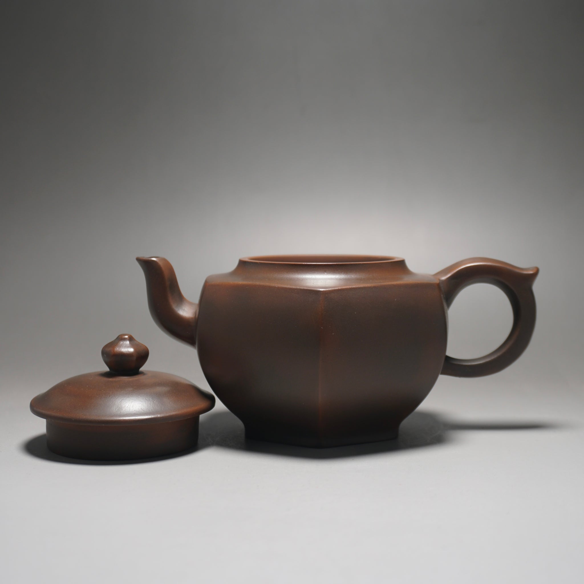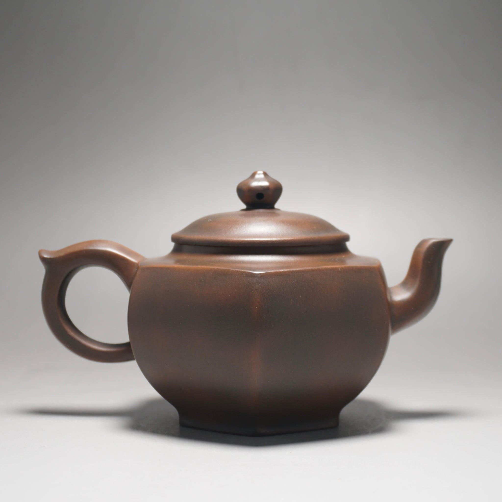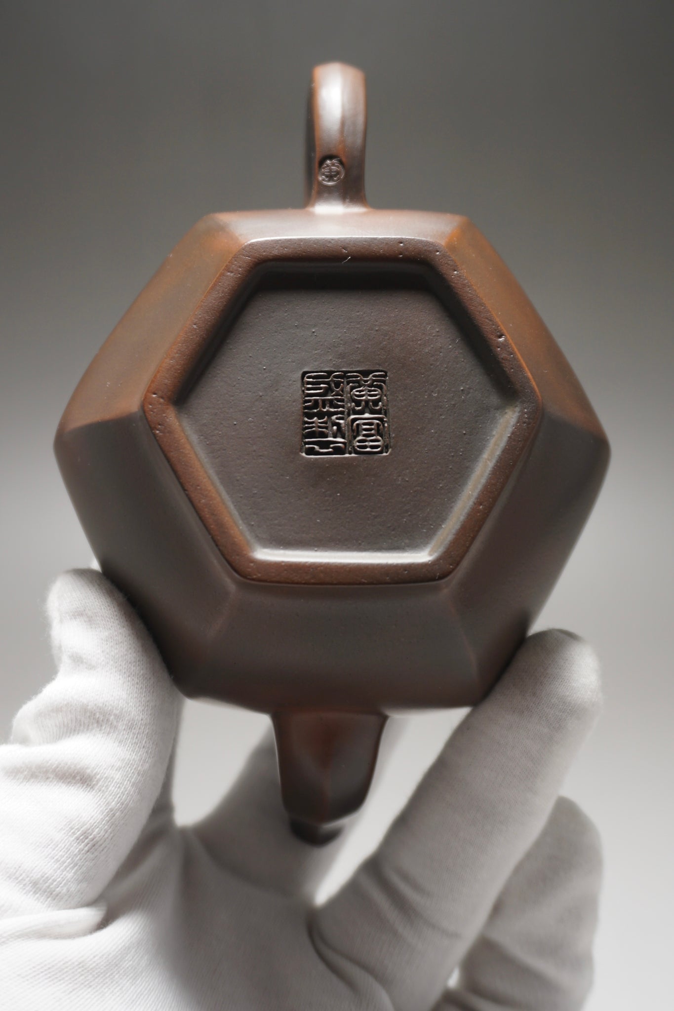 While most nixing teapots are hand wheeled, this teapot was made in the same manner as fully handmade Yixing Teapots due to the hexagon shape of the pot. Slabs were shaped and connected by hand. This shape takes great skill to execute properly.