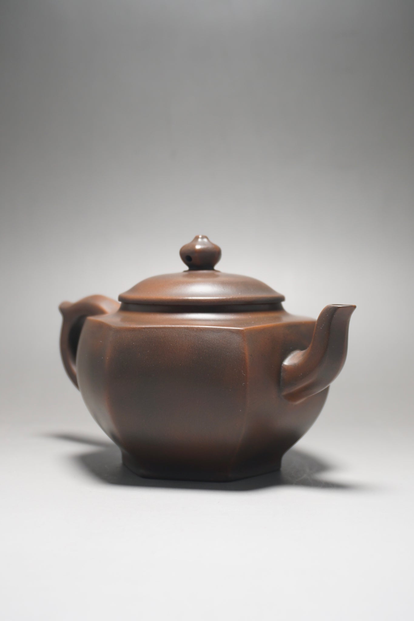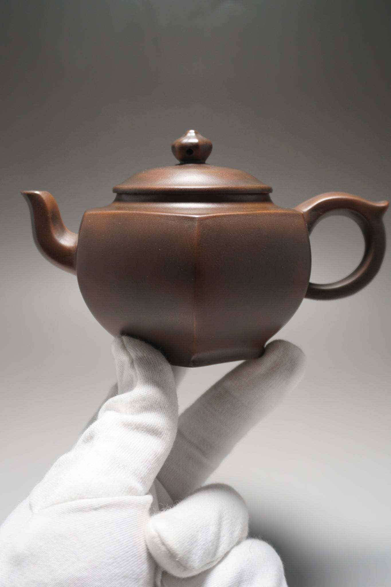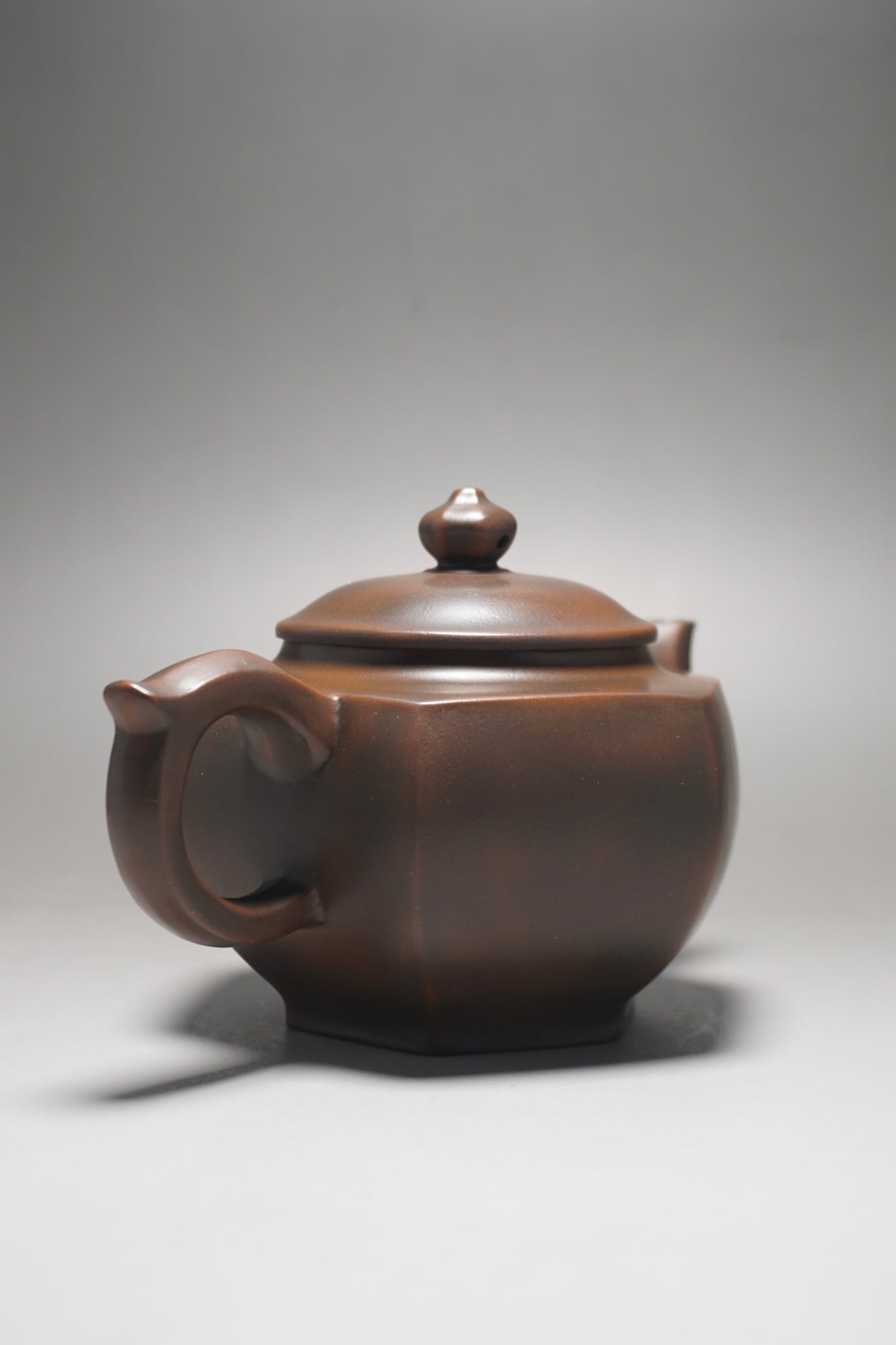 While most nixing teapots are hand wheeled, this teapot was made in the same manner as fully handmade Yixing Teapots due to the hexagon shape of the pot. Slabs were shaped and connected by hand. This shape takes great skill to execute properly.