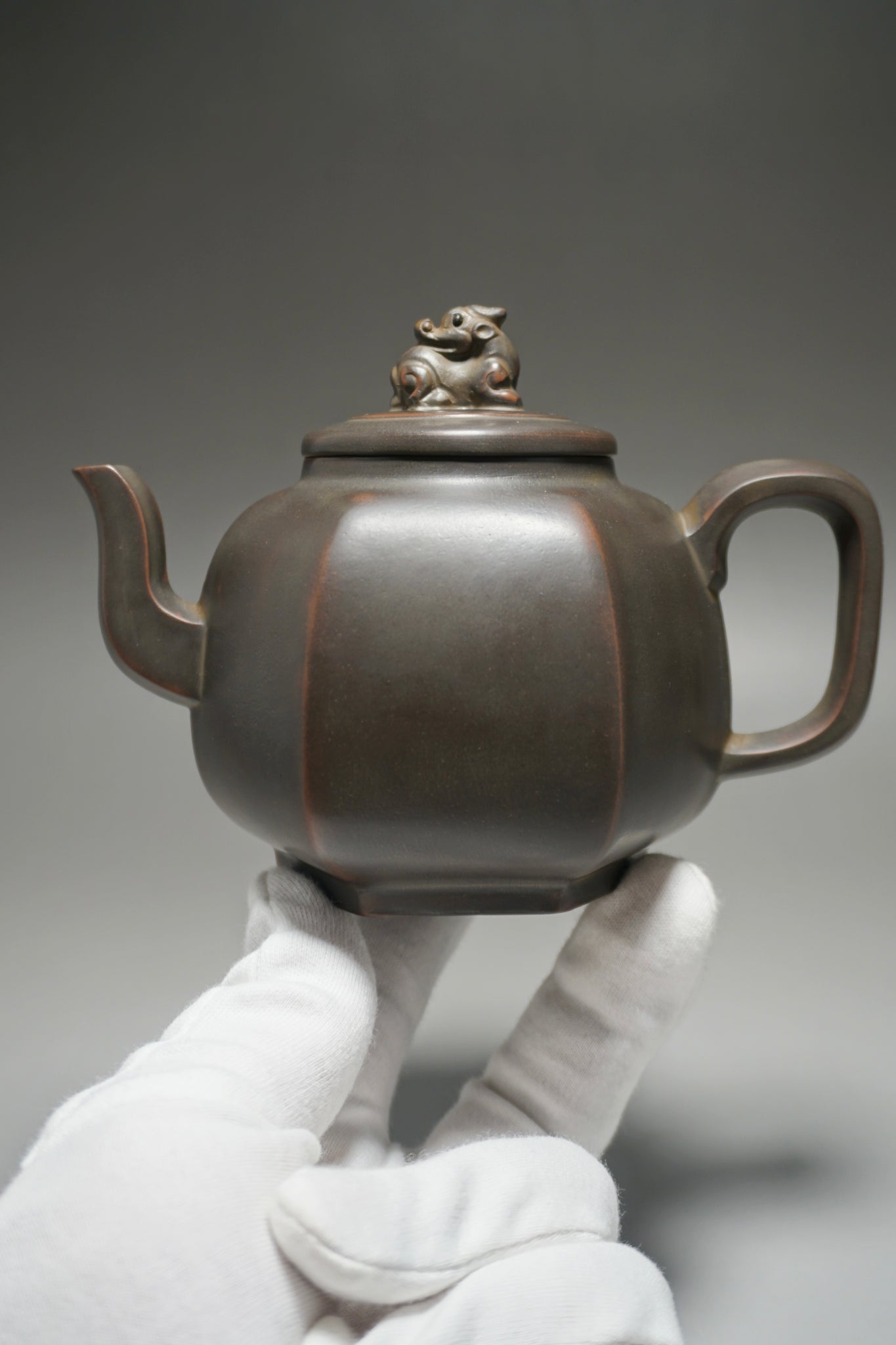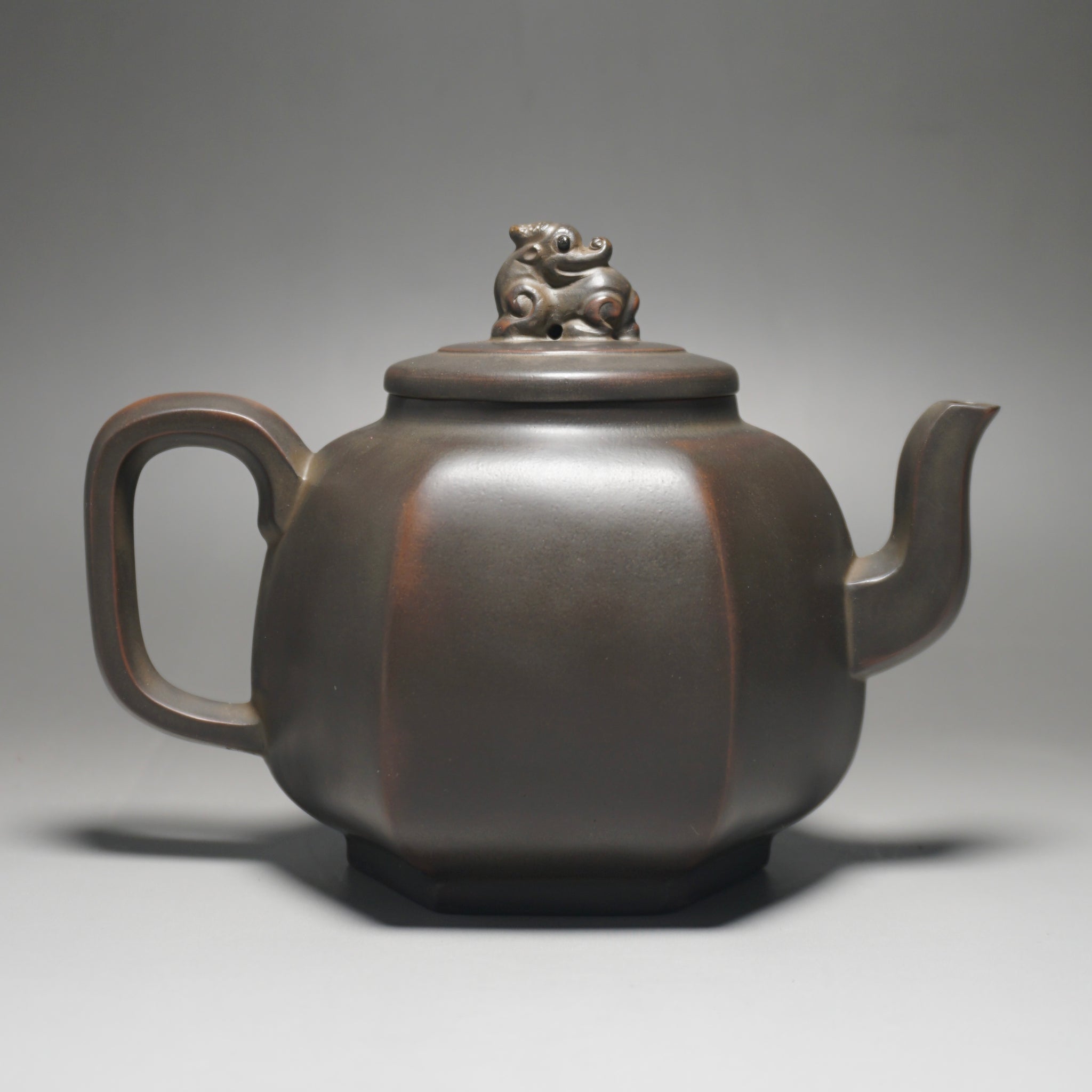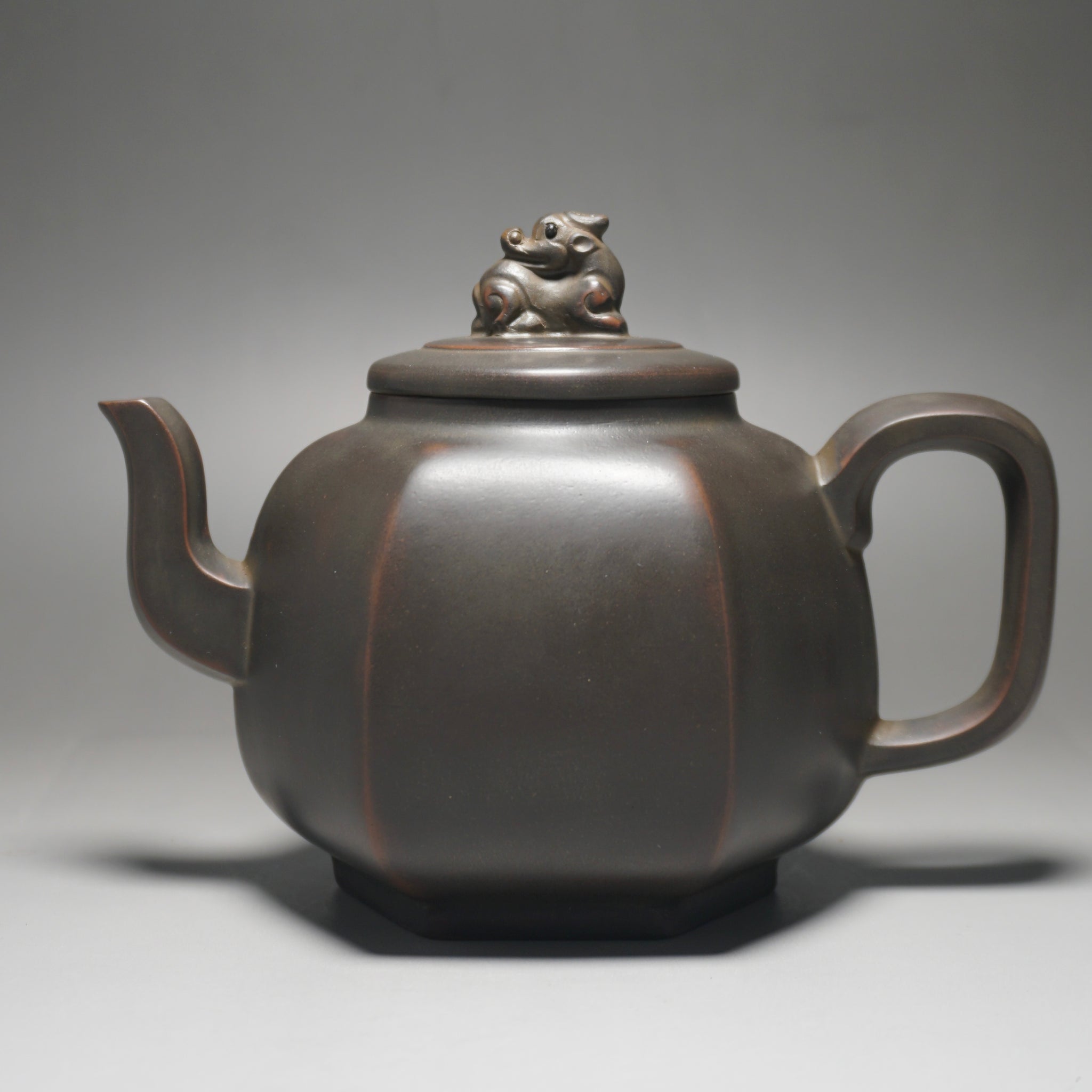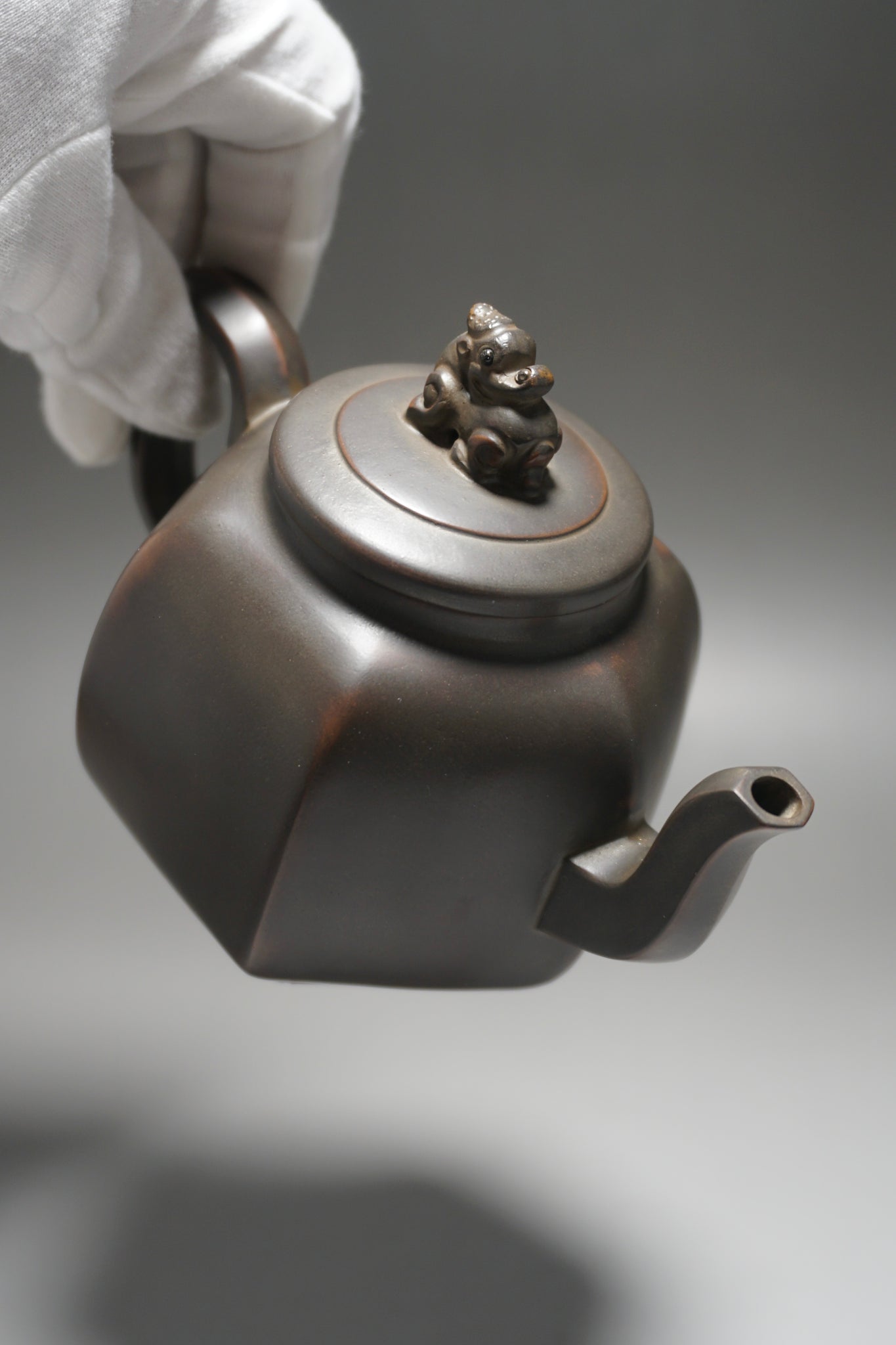 While most nixing teapots are hand wheeled, this teapot was made in the same manner as fully handmade Yixing Teapots due to the hexagon shape of the pot. Slabs were shaped and connected by hand. This shape takes great skill to execute properly. This teapot also features a Pixiu, the mythical creature, at the top of the lid.