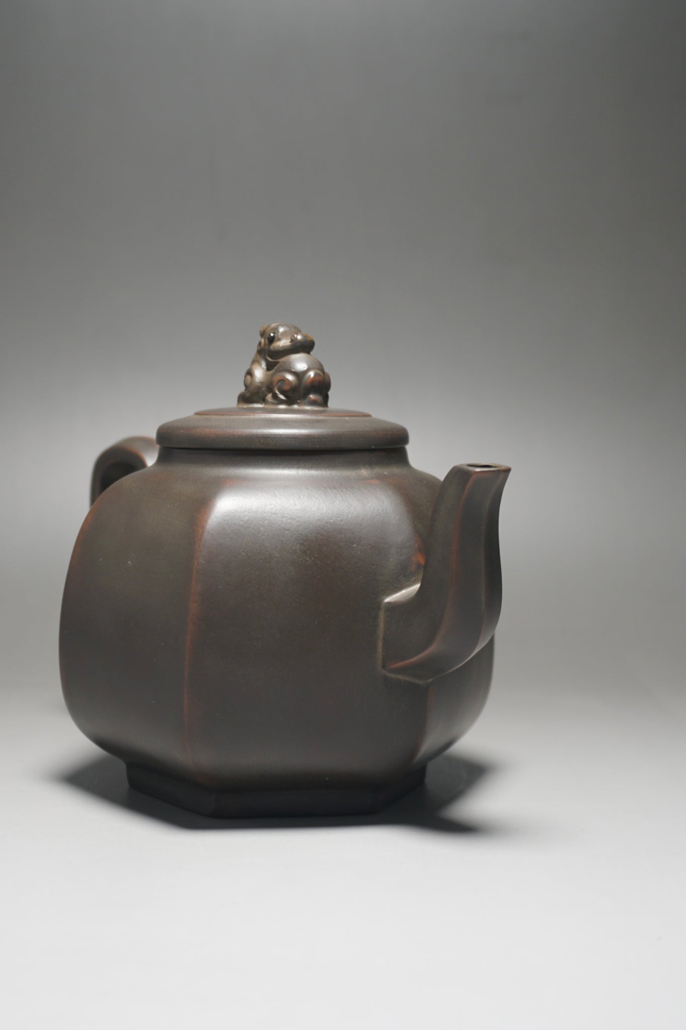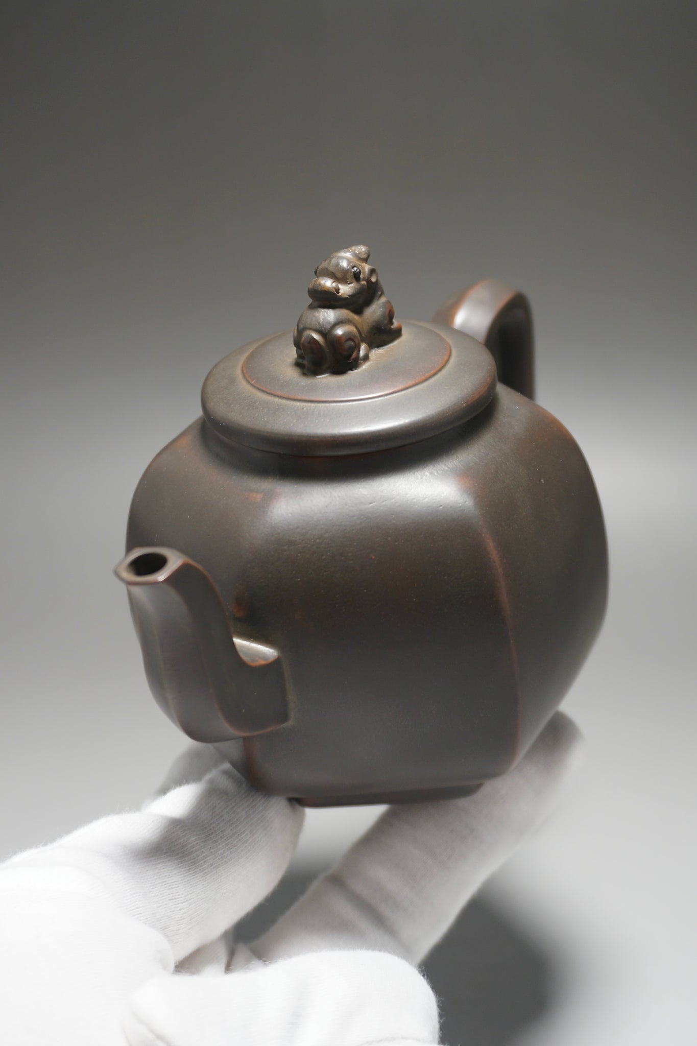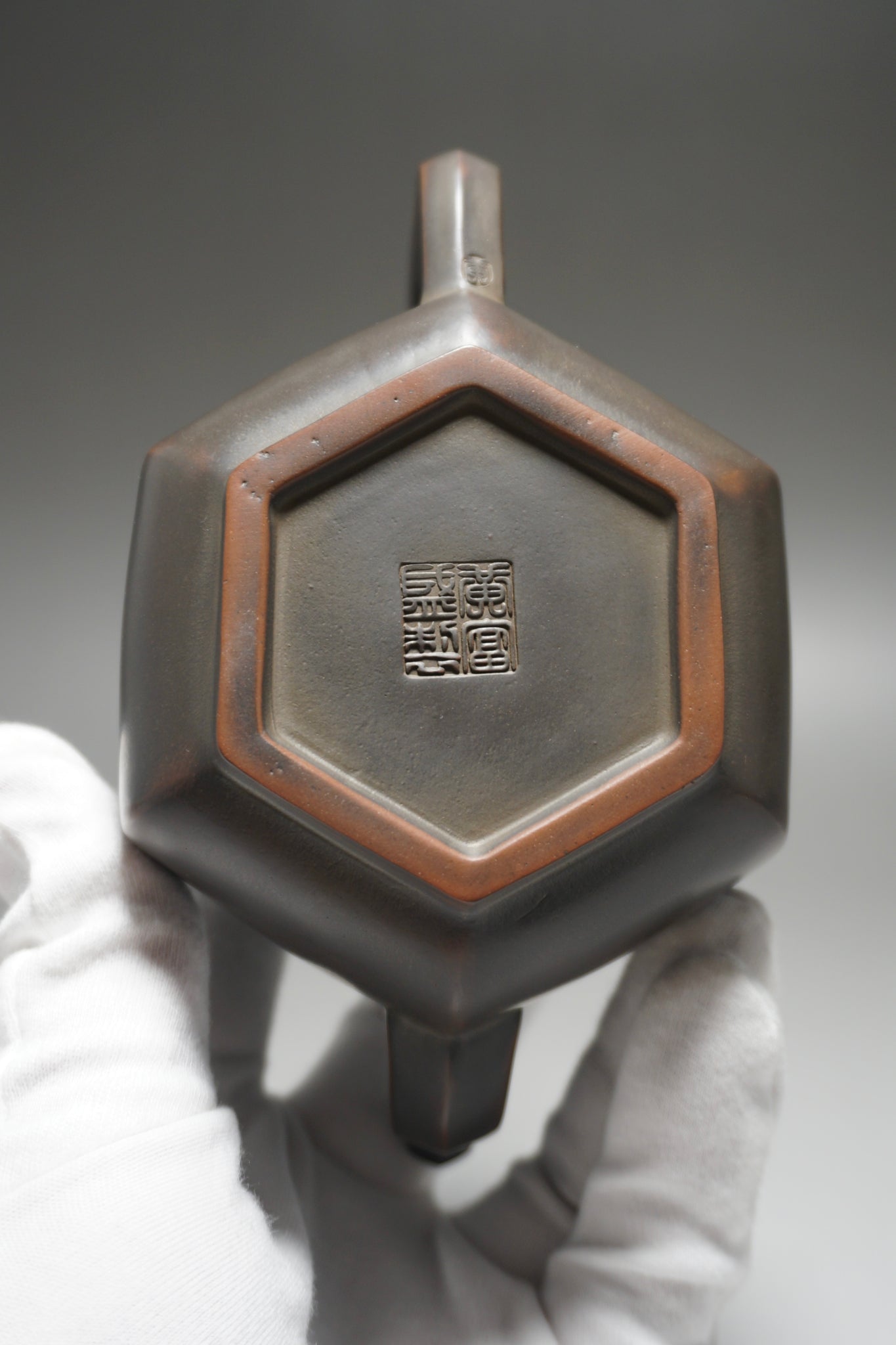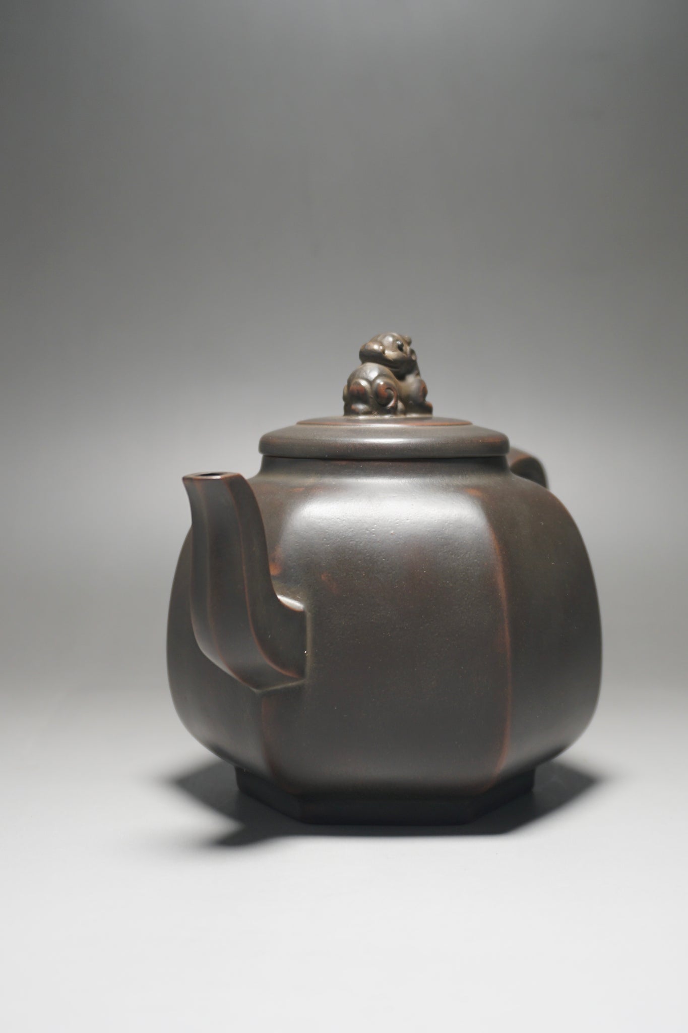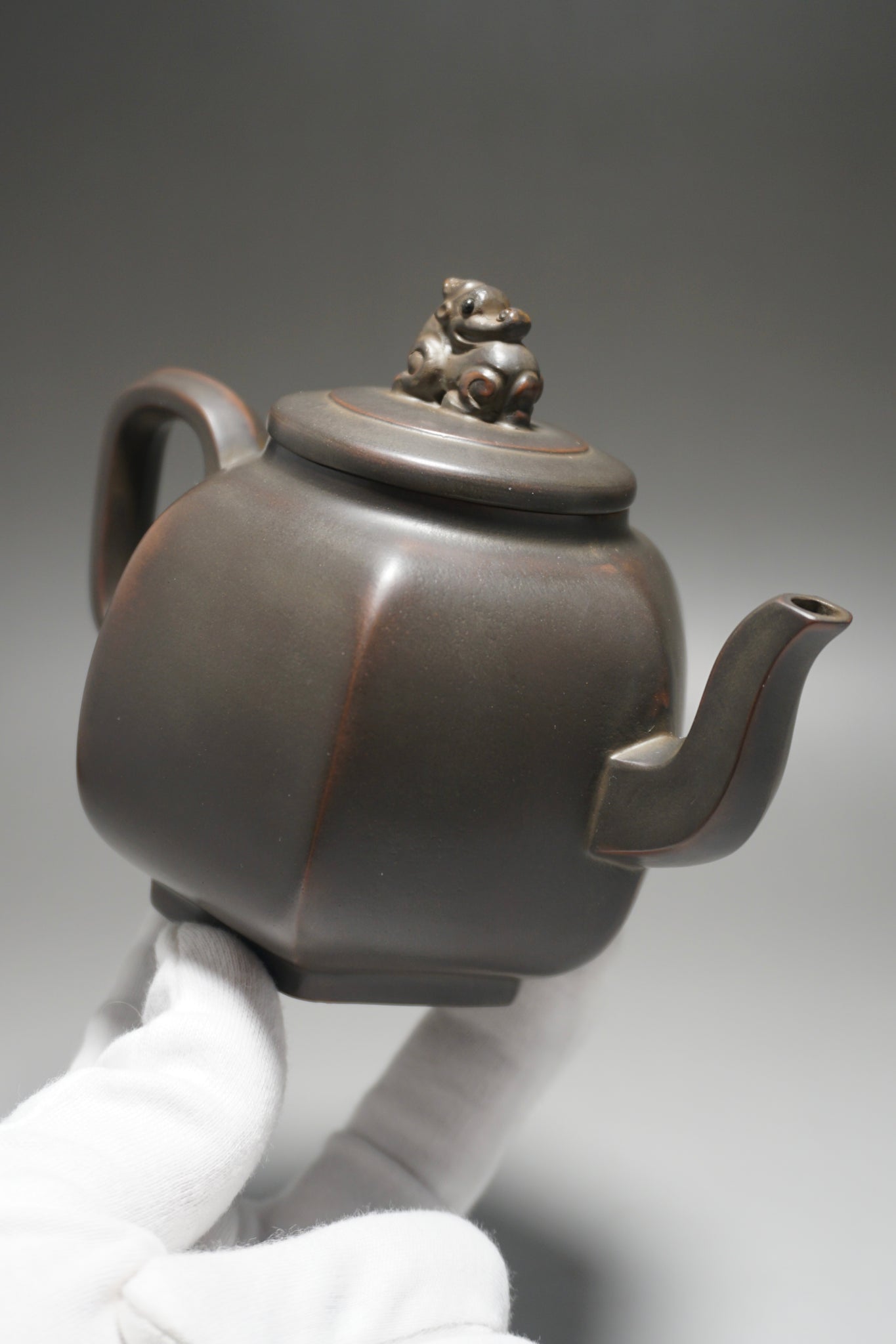 While most nixing teapots are hand wheeled, this teapot was made in the same manner as fully handmade Yixing Teapots due to the hexagon shape of the pot. Slabs were shaped and connected by hand. This shape takes great skill to execute properly. This teapot also features a Pixiu, the mythical creature, at the top of the lid.