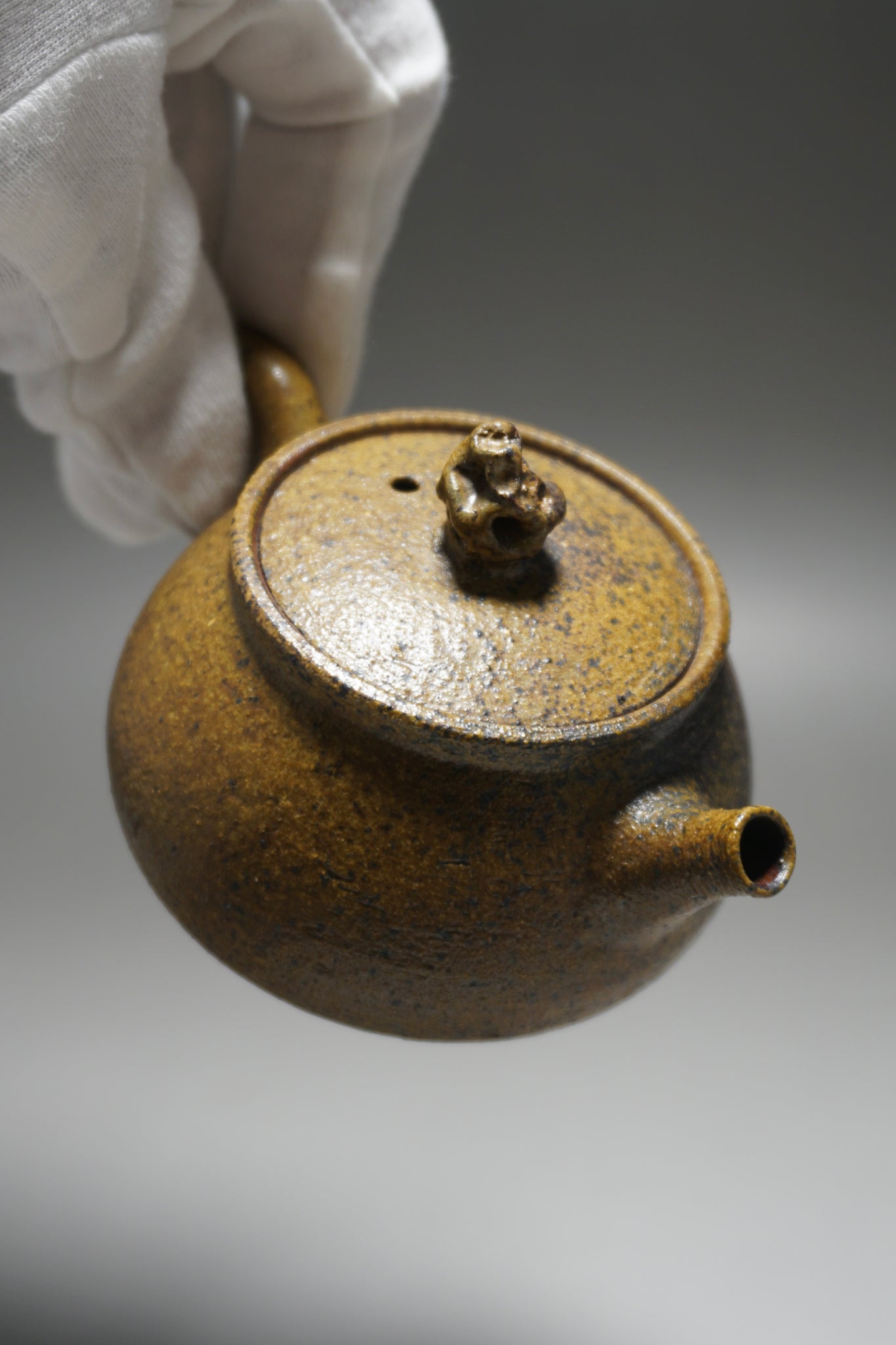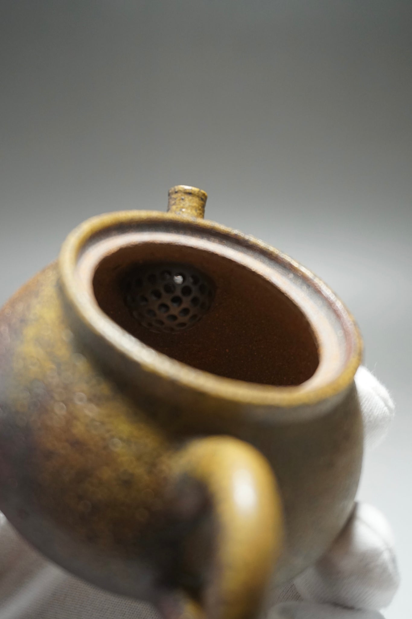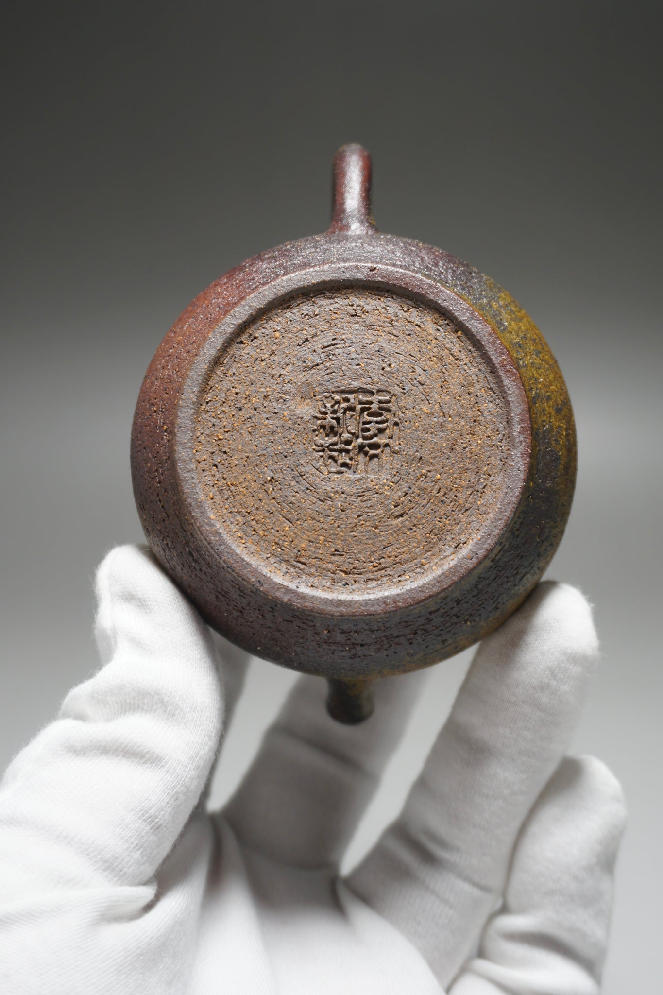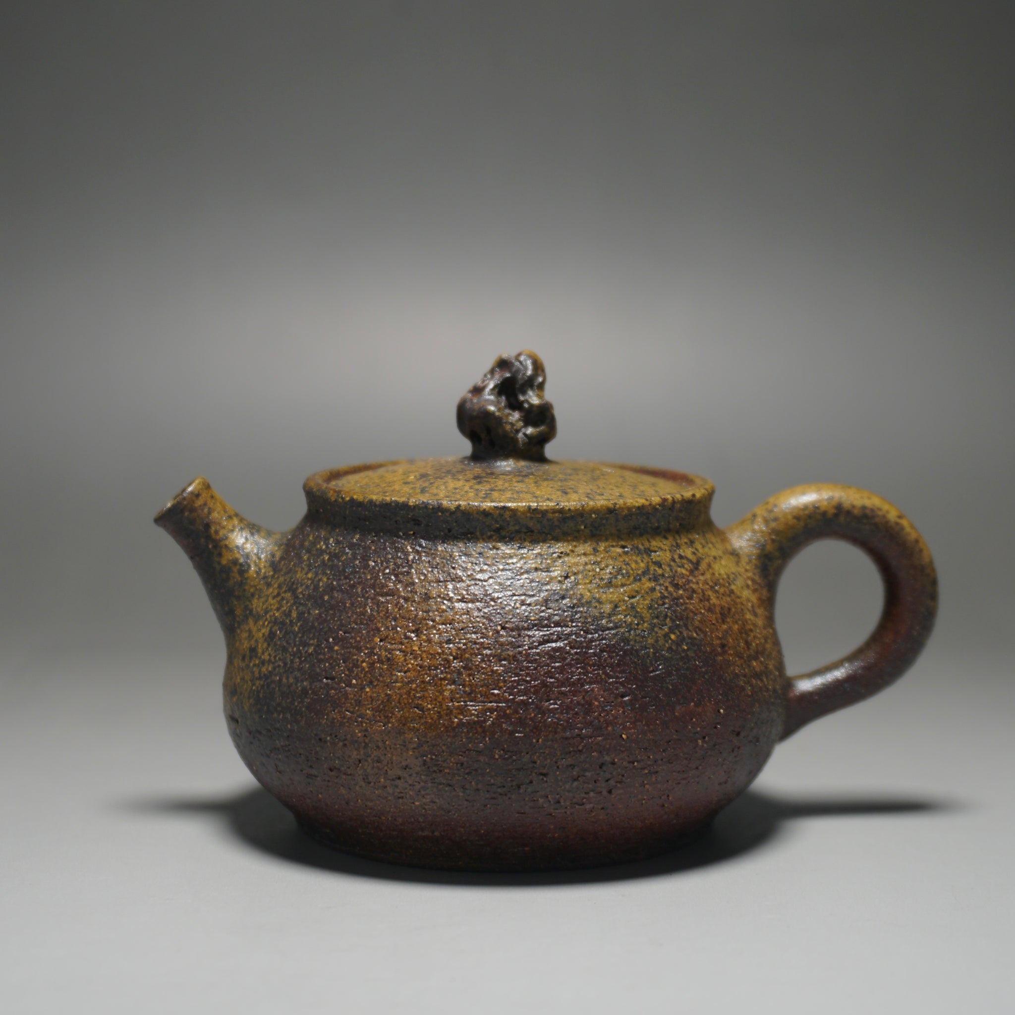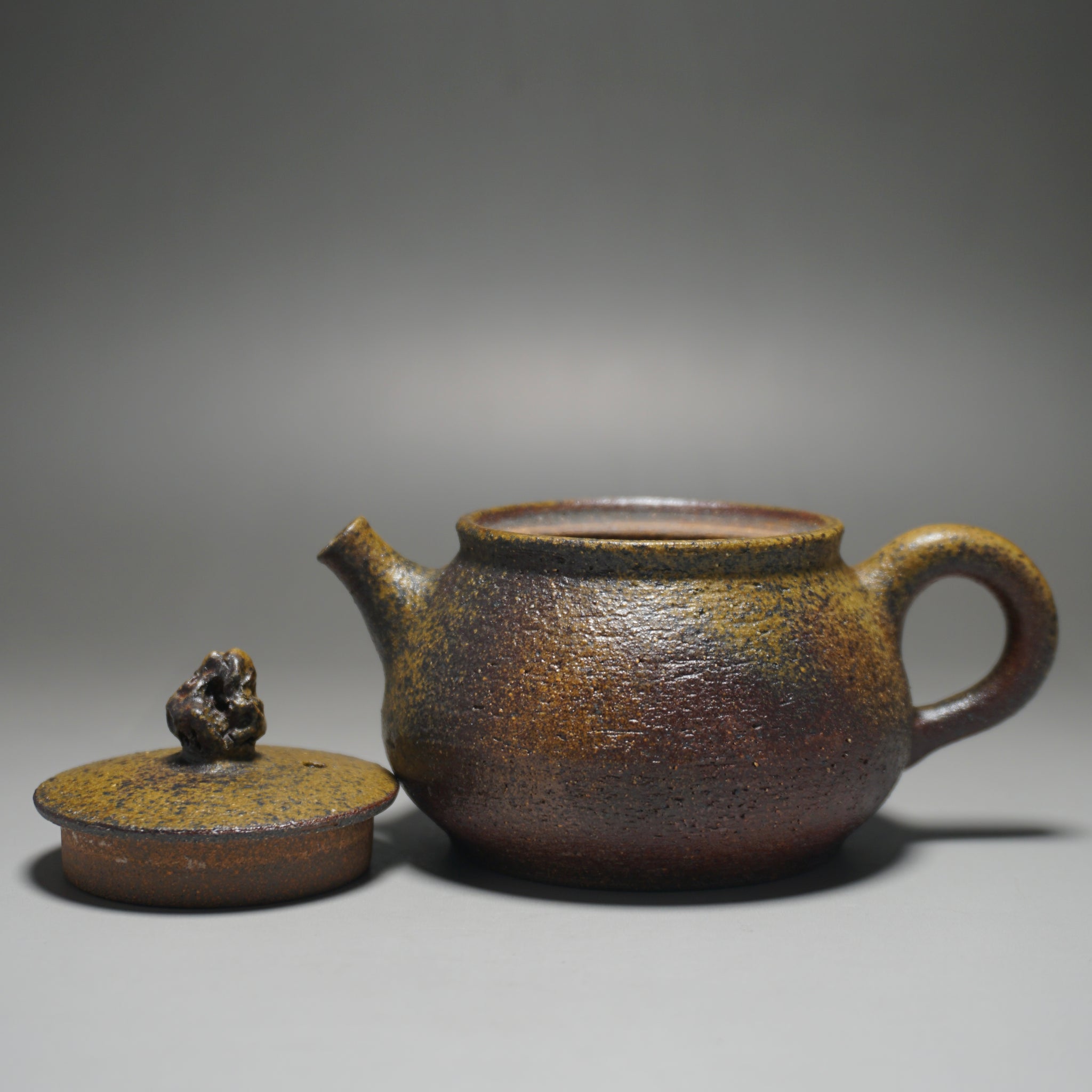 This teapot was fired in the traditional wood kiln of the studio using pine wood as fuel. Firing nixing teapots this way is riskier than in a modern kiln and not all pieces survive the process. The teapot spent around two weeks in the kiln. The different colours and patterns on the surface of the clay are a result of the natural wood ash glaze formed by some of the pine ash when it touches the surface of the clay. The glaze is partial and only on the outside surface, leaving the nixing clay to retain its porous nature.