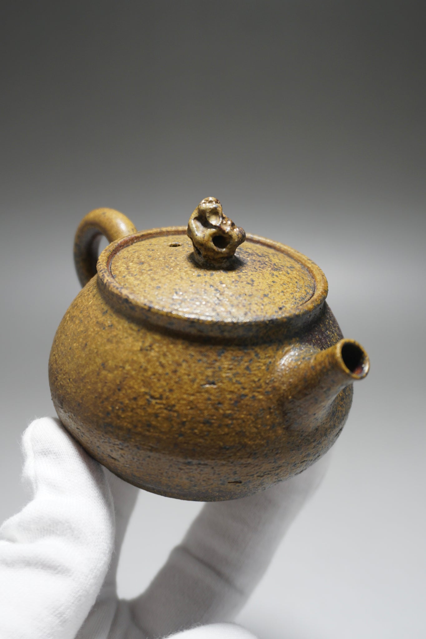 This wood fired teapot features a natural wood ash from being fired uncovered in a wood kiln, as a result areas of the teapot may appear rough or smooth with irregular glazing. Some areas, particularly the bottom of the pot, may appear rougher (see photos).