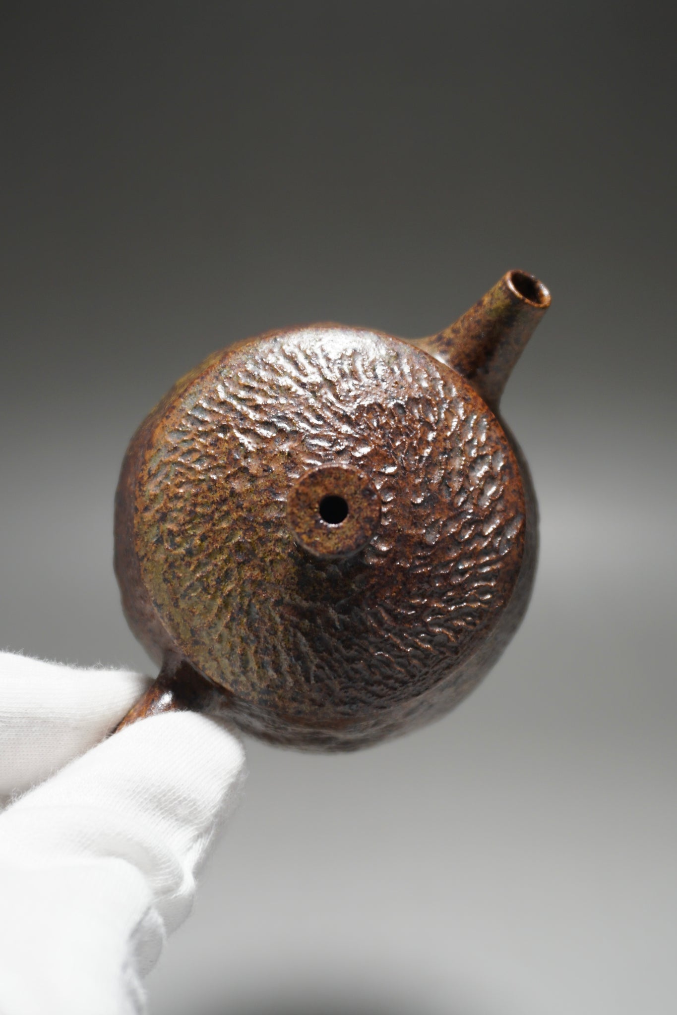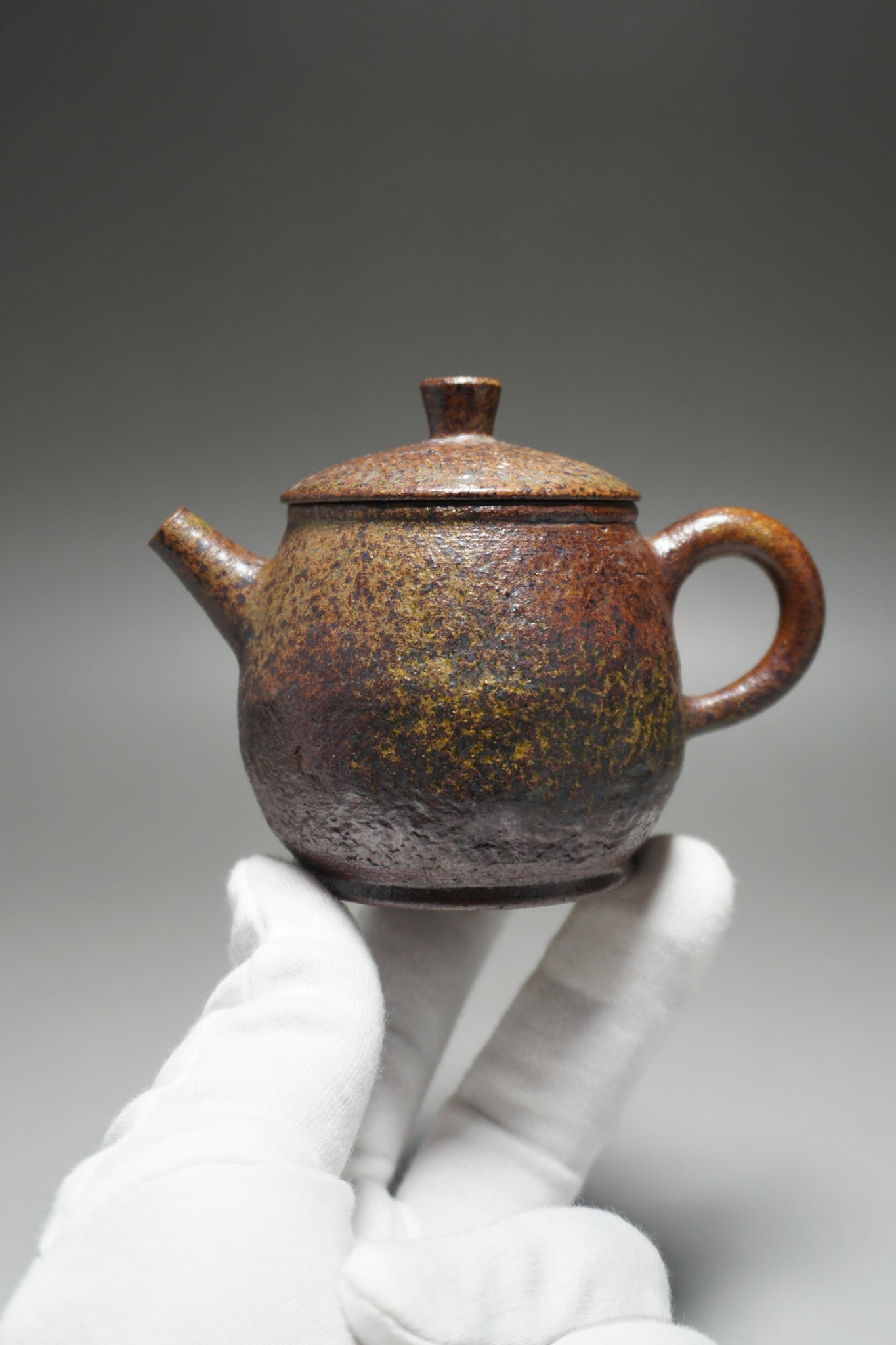 This teapot was fired in the traditional wood kiln of the studio using pine wood as fuel. Firing nixing teapots this way is riskier than in a modern kiln and not all pieces survive the process. The teapot spent around two weeks in the kiln. The different colours and patterns on the surface of the clay are a result of the natural wood ash glaze formed by some of the pine ash when it touches the surface of the clay. The glaze is partial and only on the outside surface, leaving the nixing clay to retain its porous nature.