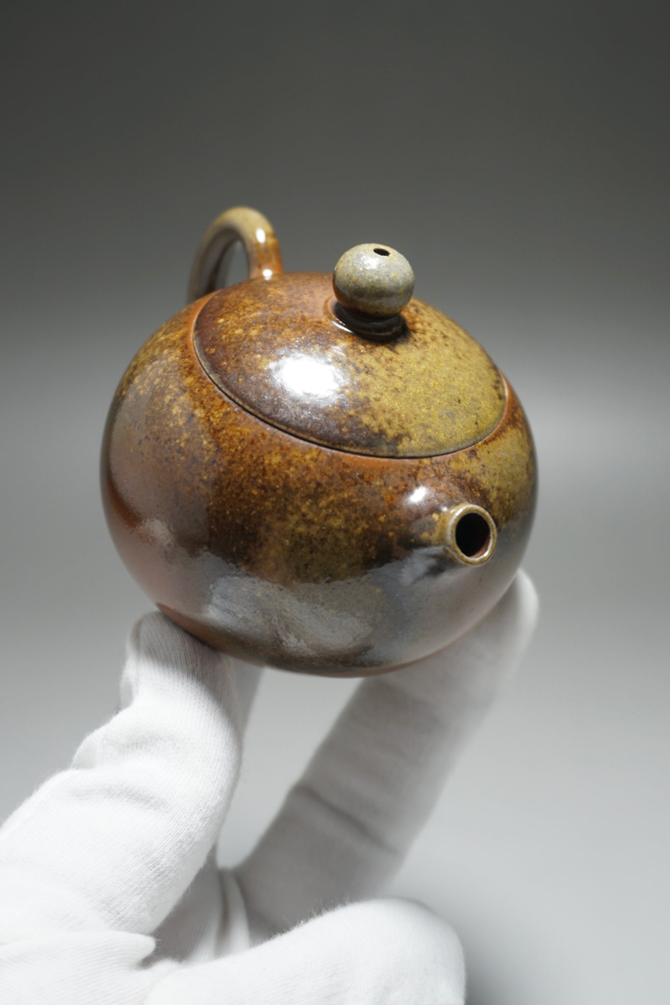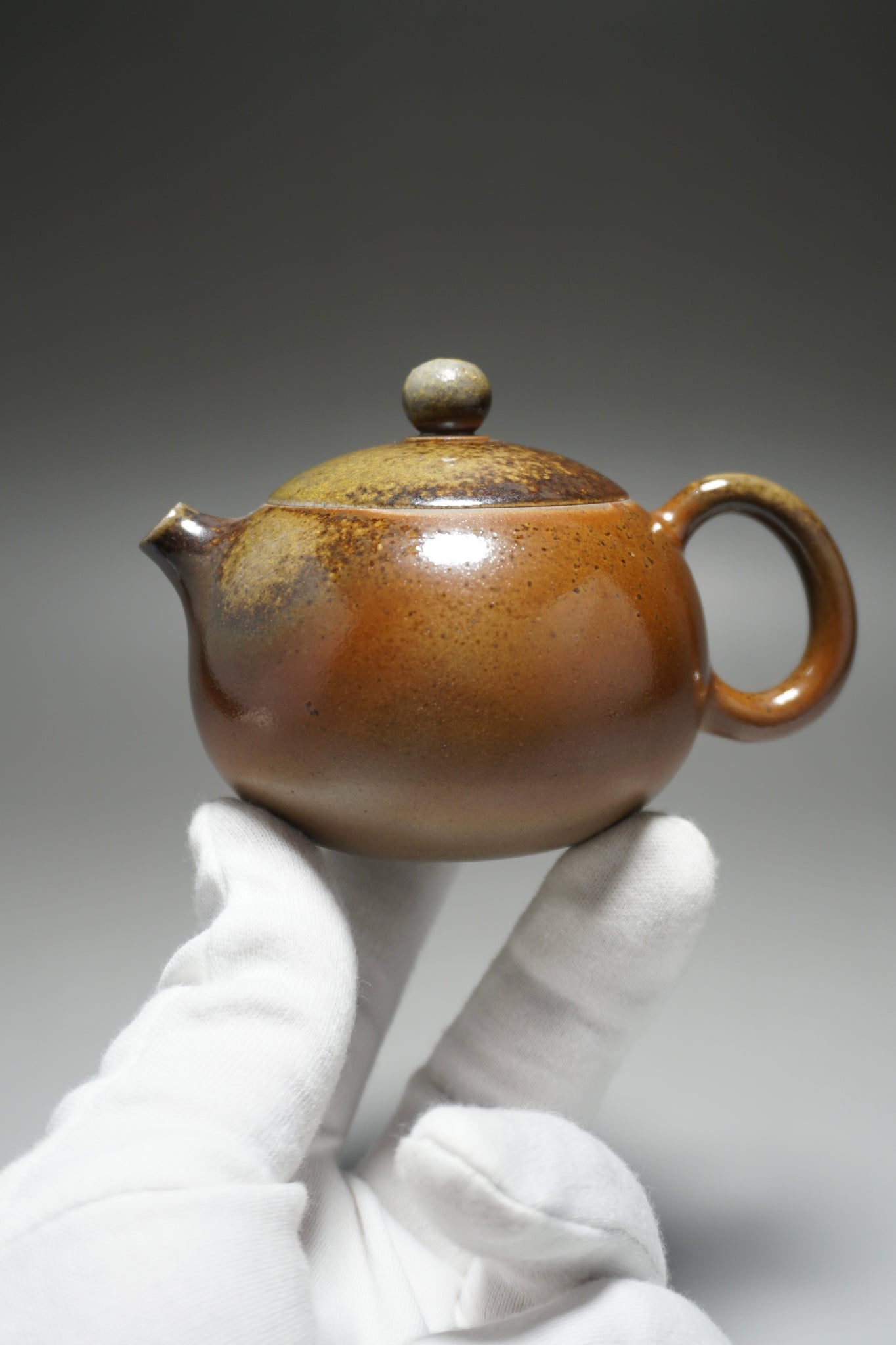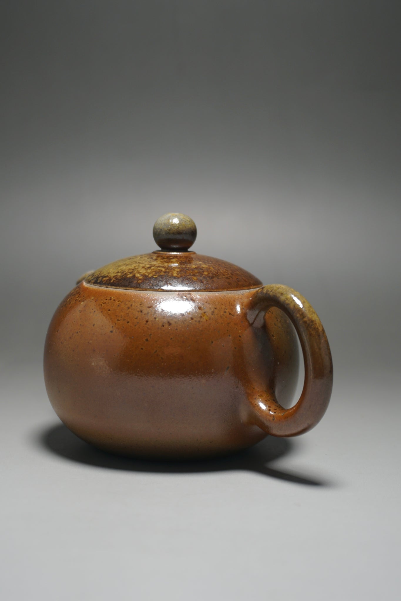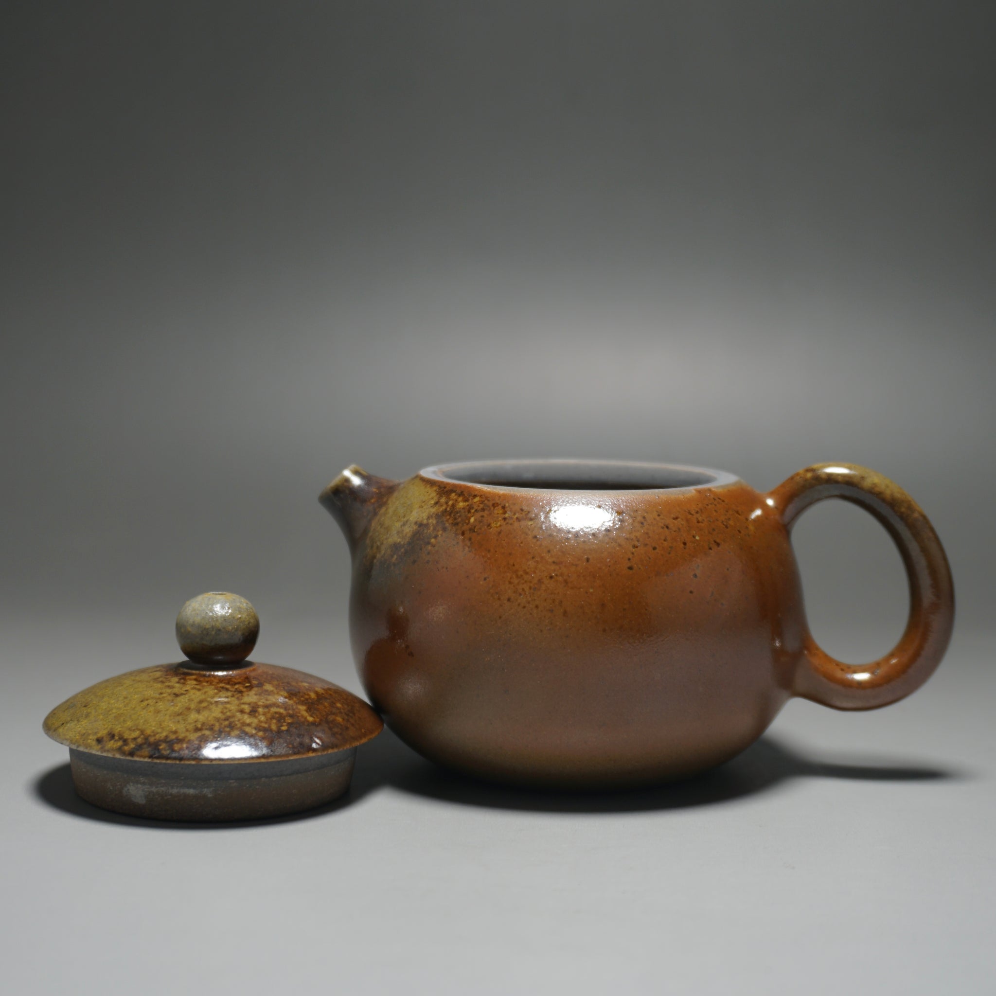 This wood fired teapot features a natural wood ash from being fired uncovered in a wood kiln, as a result areas of the teapot may appear rough or smooth with irregular glazing. Some areas, particularly the bottom of the pot, may appear rougher (see photos).