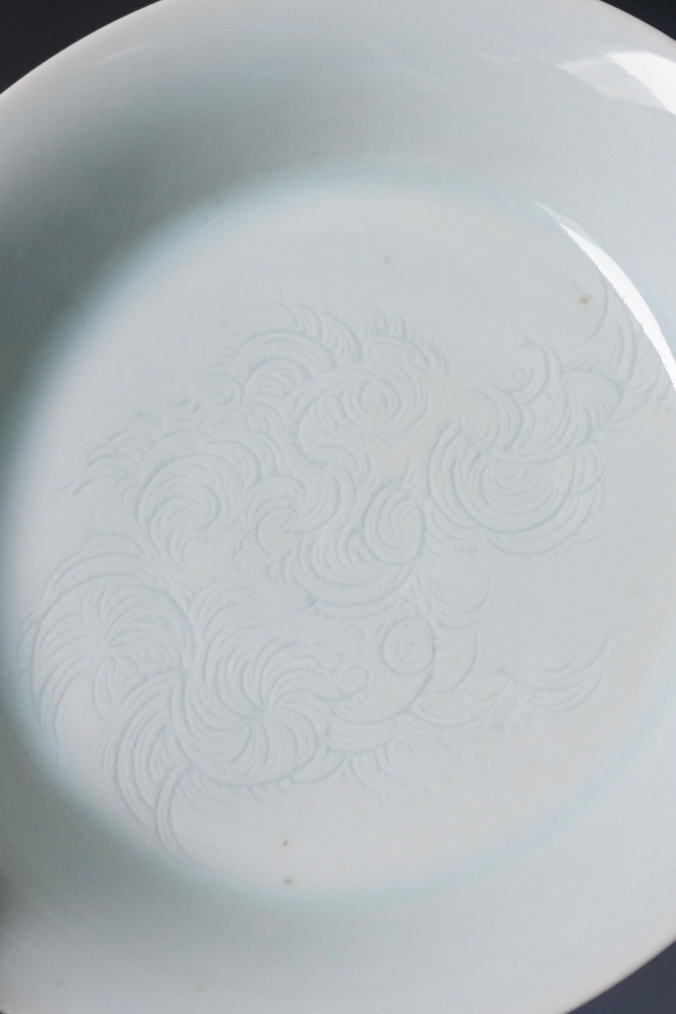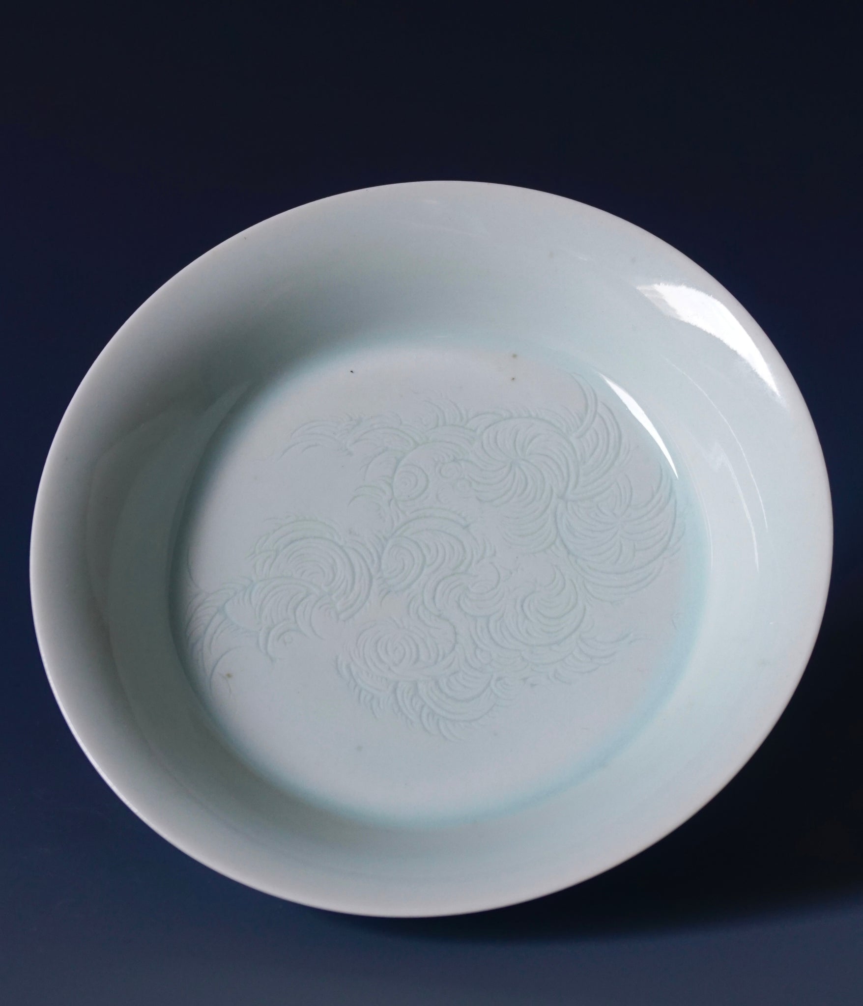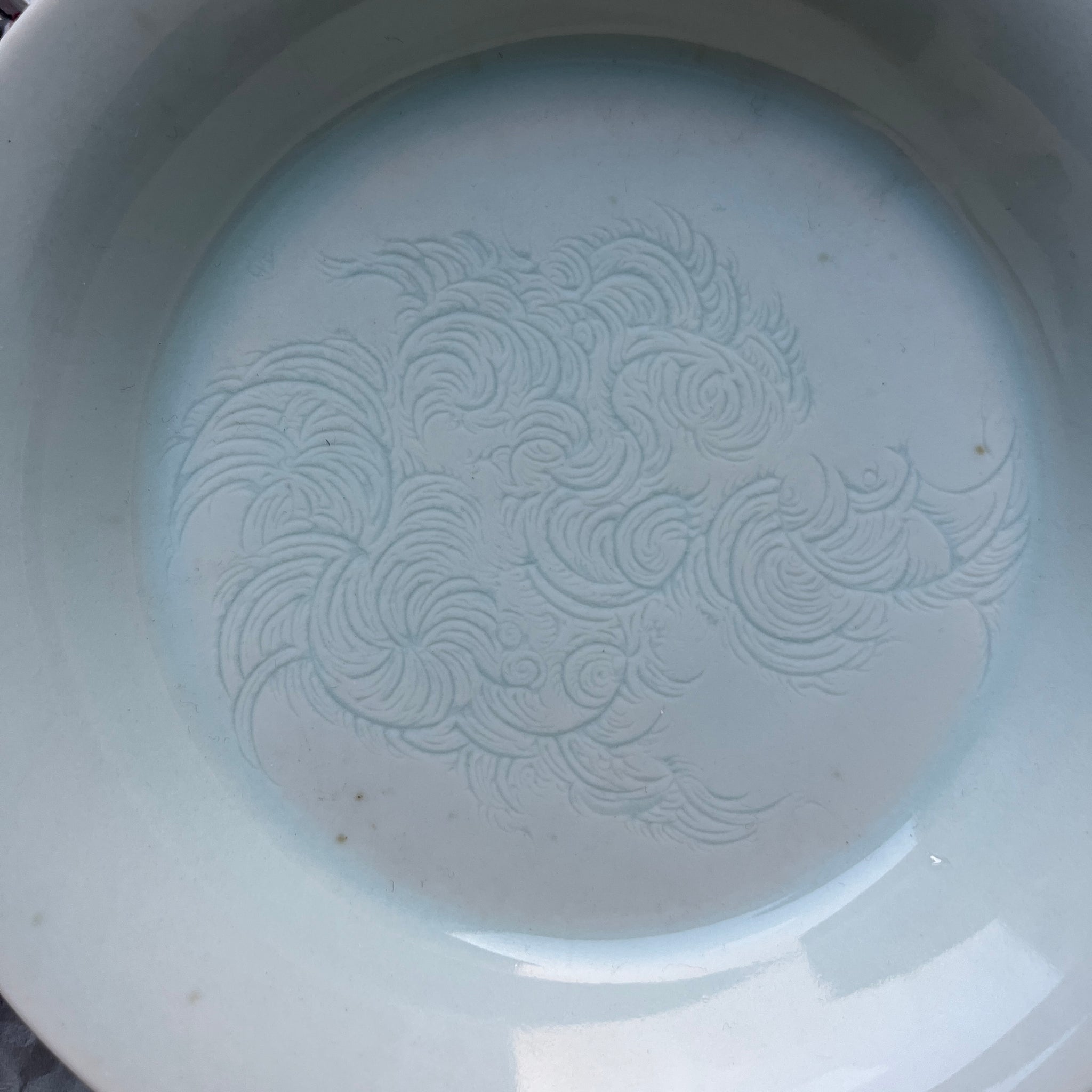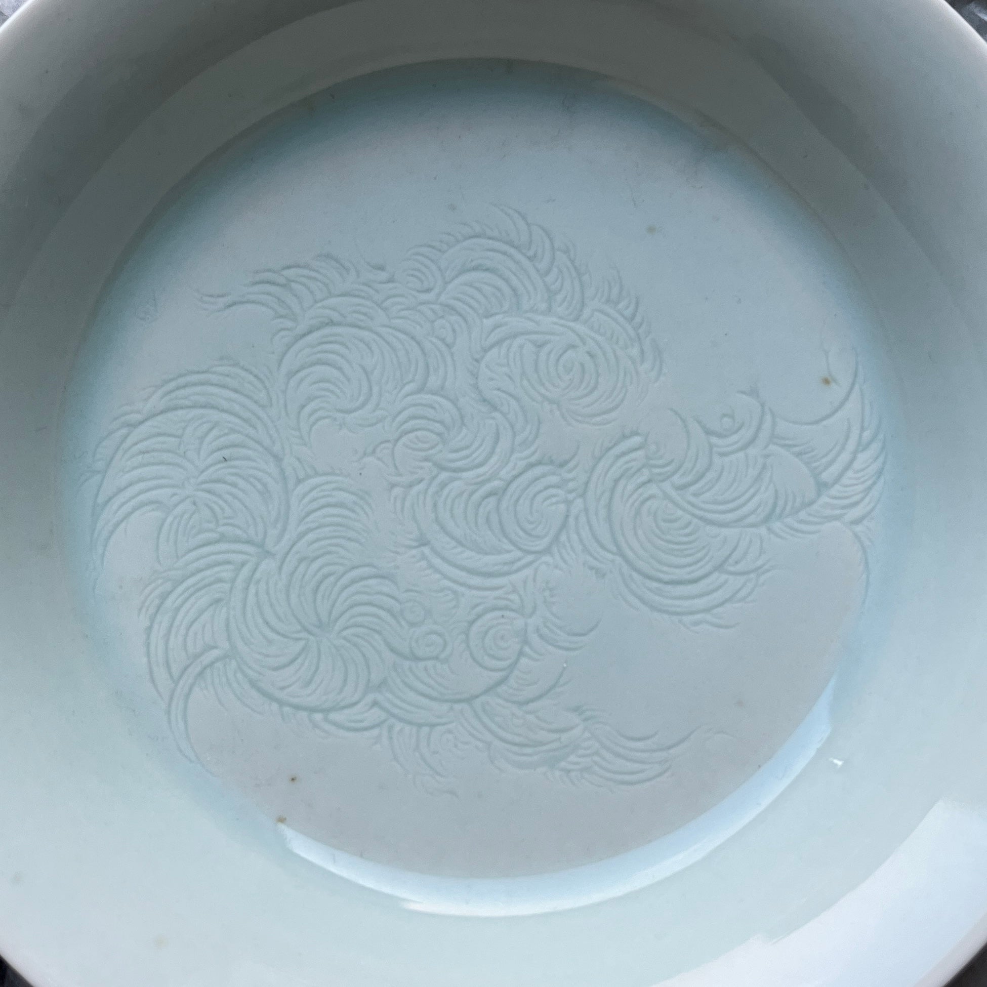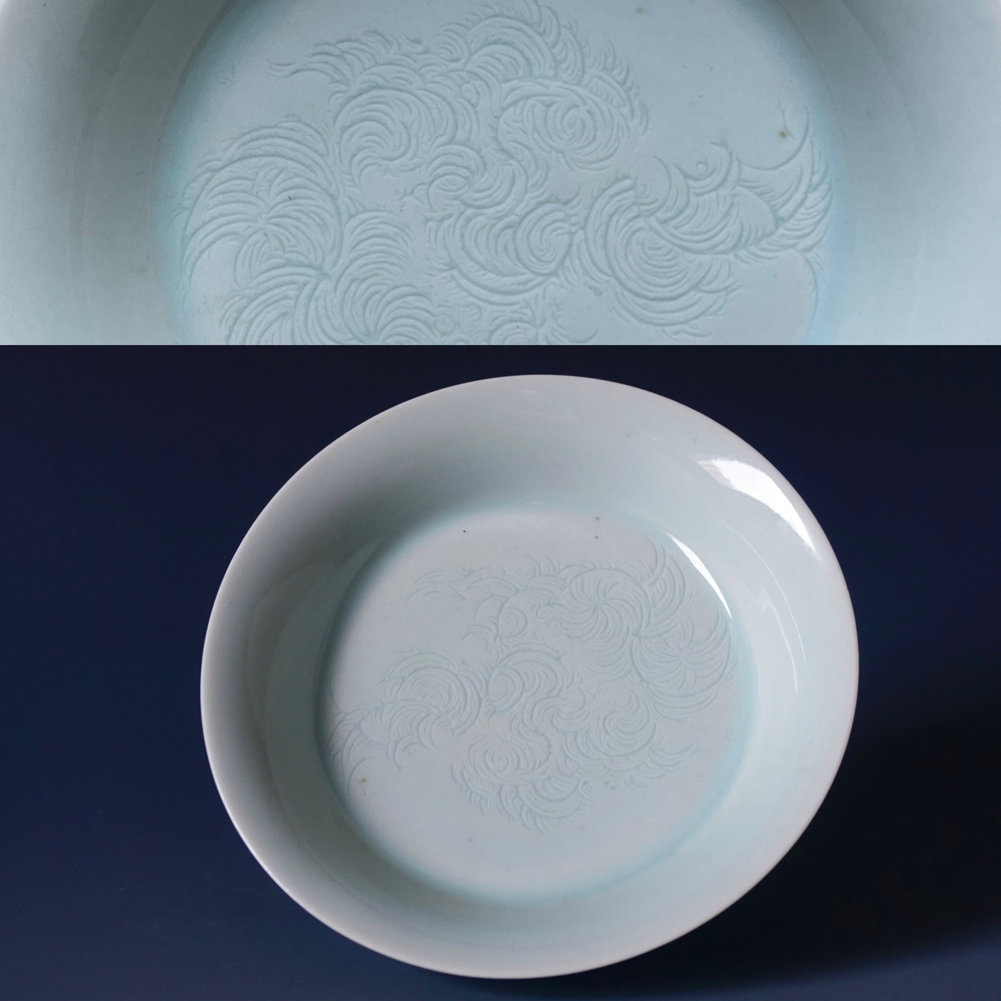 This blue-white porcelain is known as Yingqing 影青 "Shadow Jade" and also as Qingbaici 青白瓷 "jade white porcelain." It is known for its jade-like quality and the beautiful patterns carved under the glaze that are especially pronounced when lit from behind.