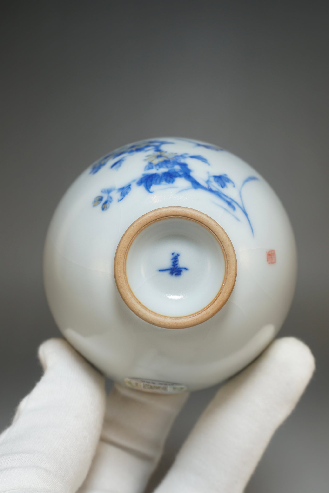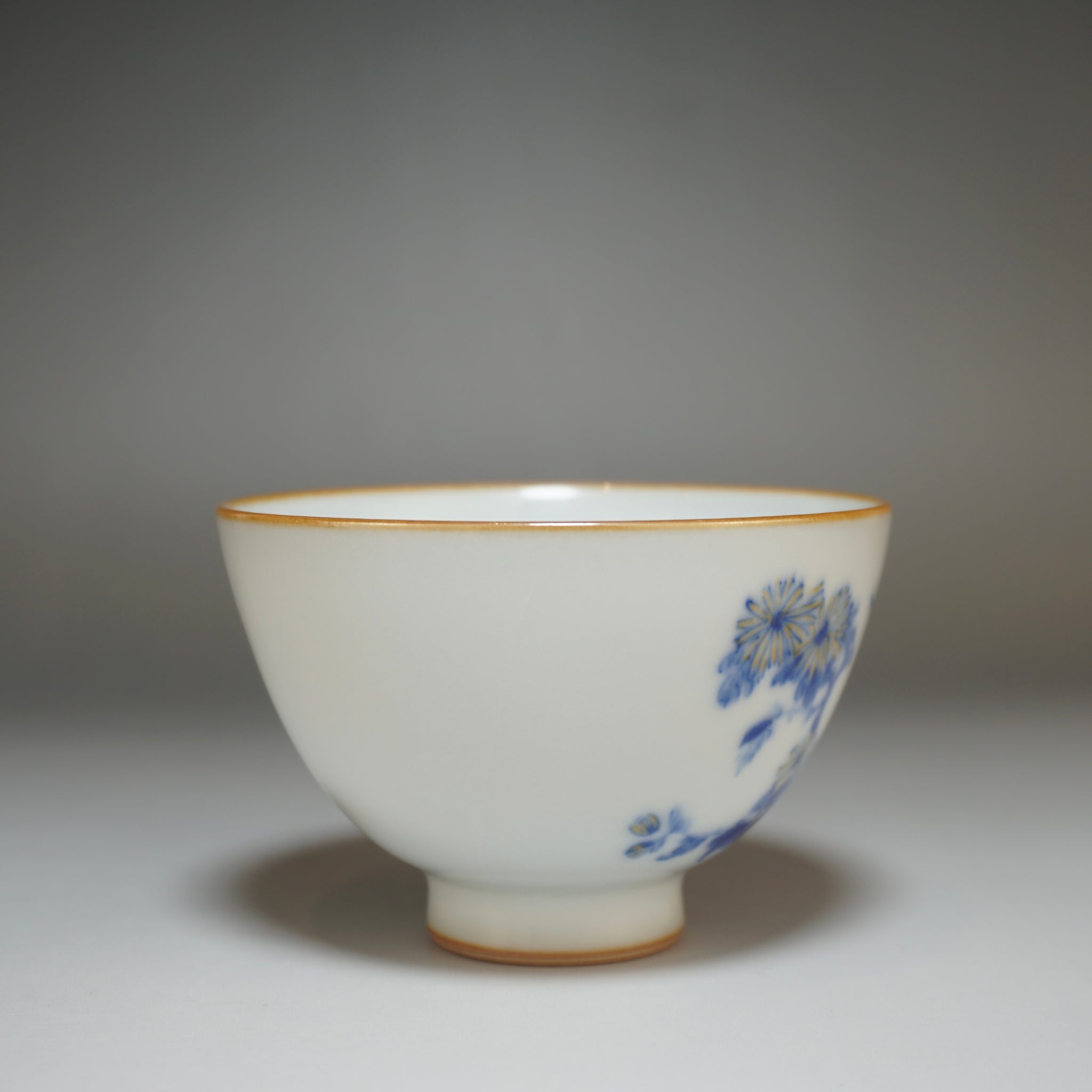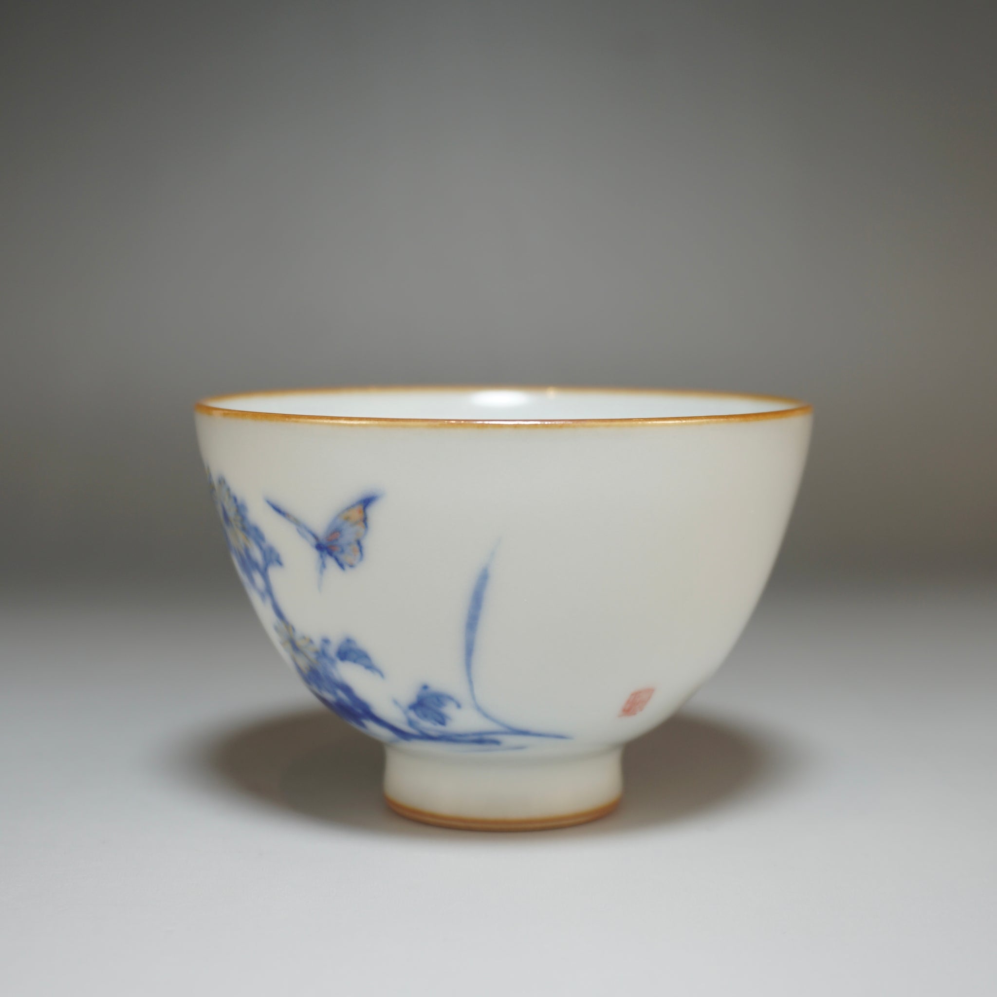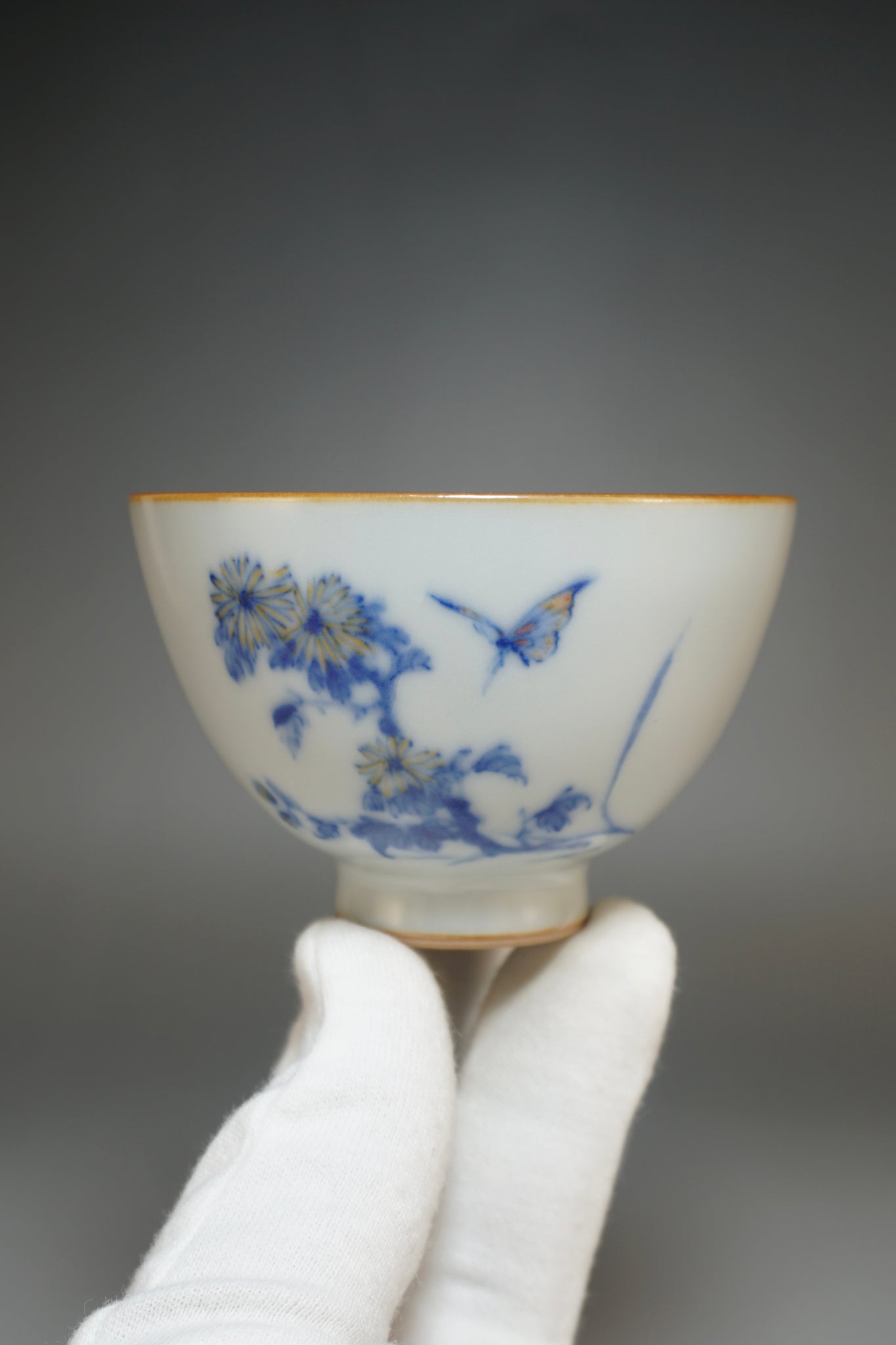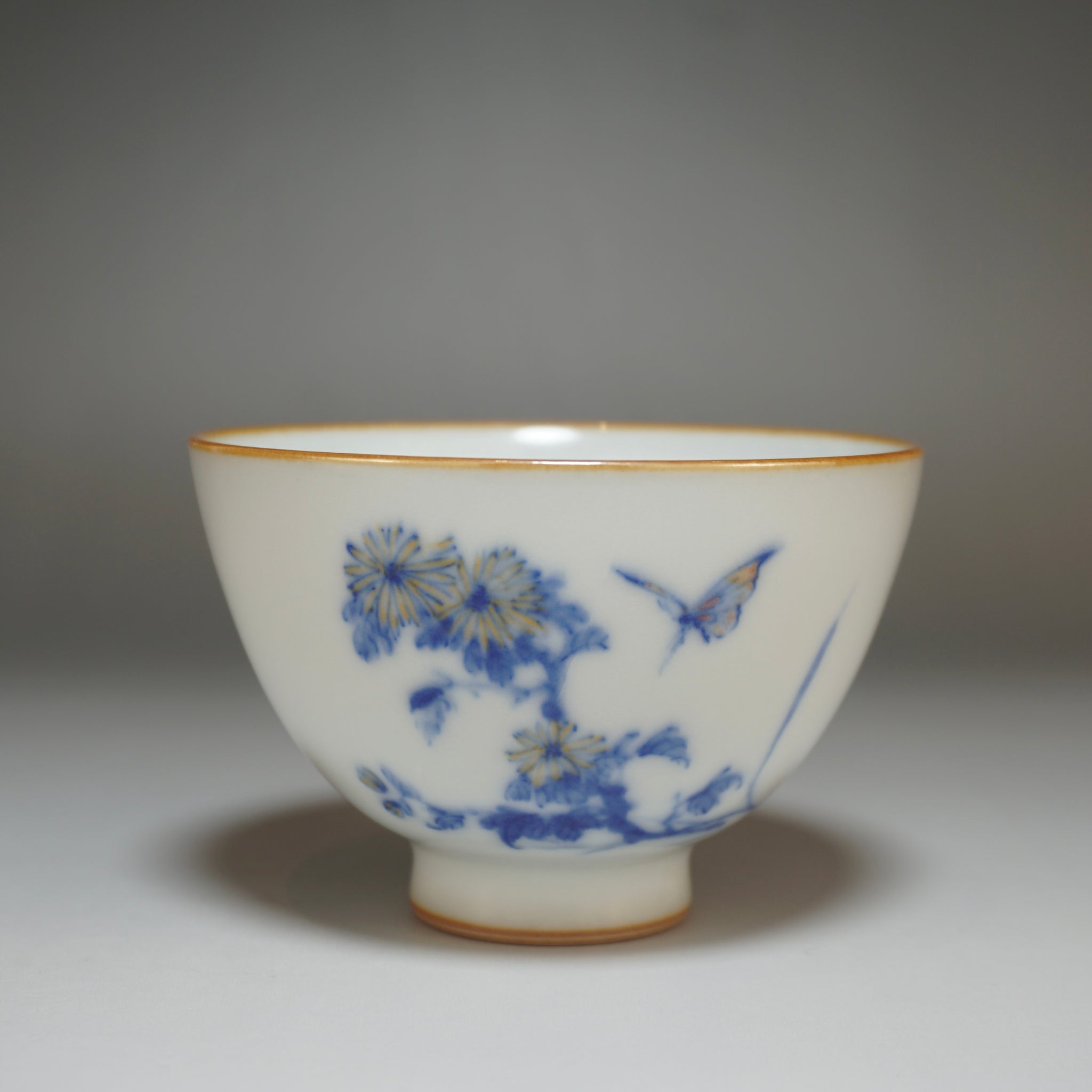120ml Qinghua Chrysanthemum and Butterfly Moon White Ruyao Teacup 月白菊花蝶杯
