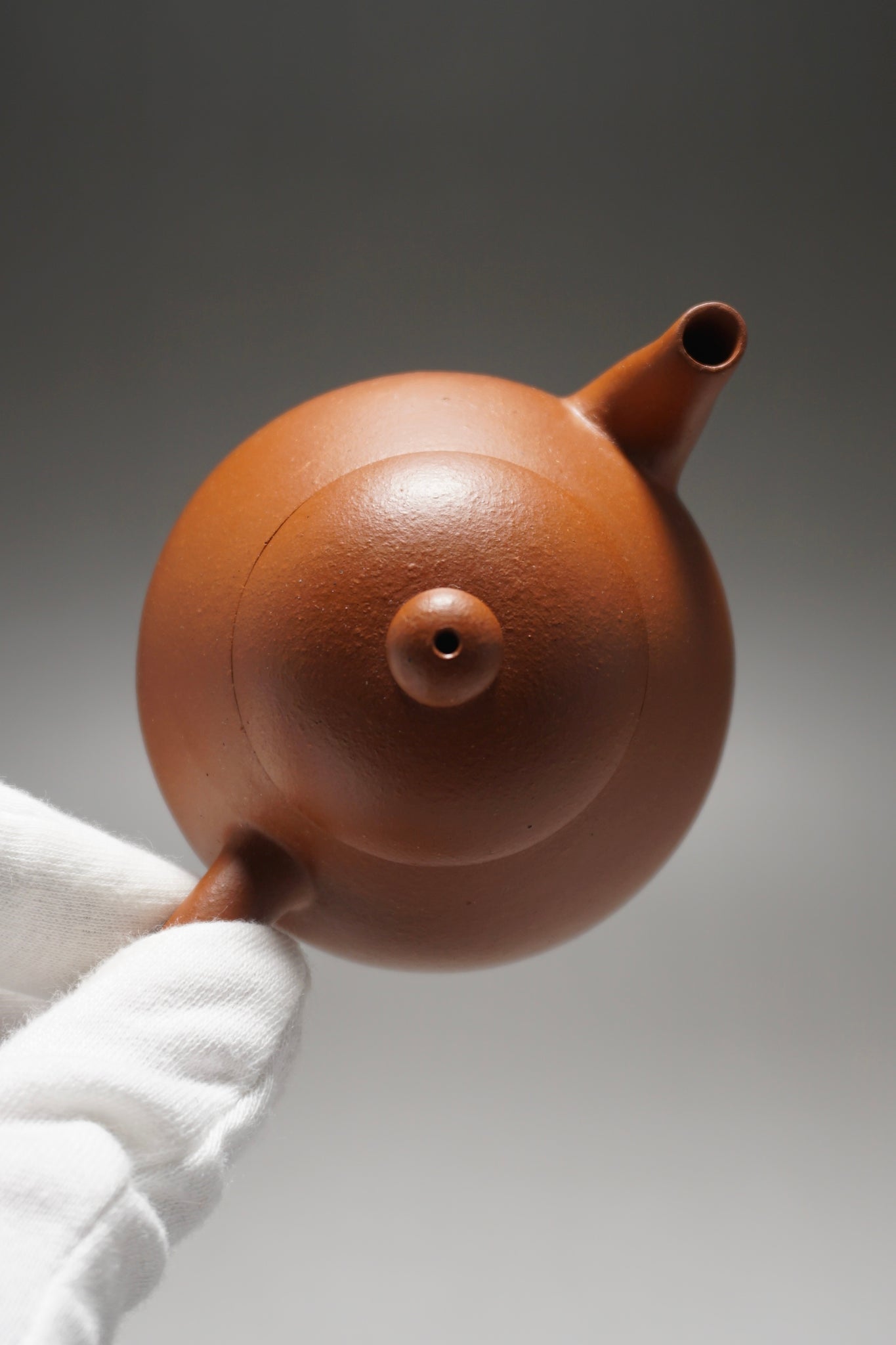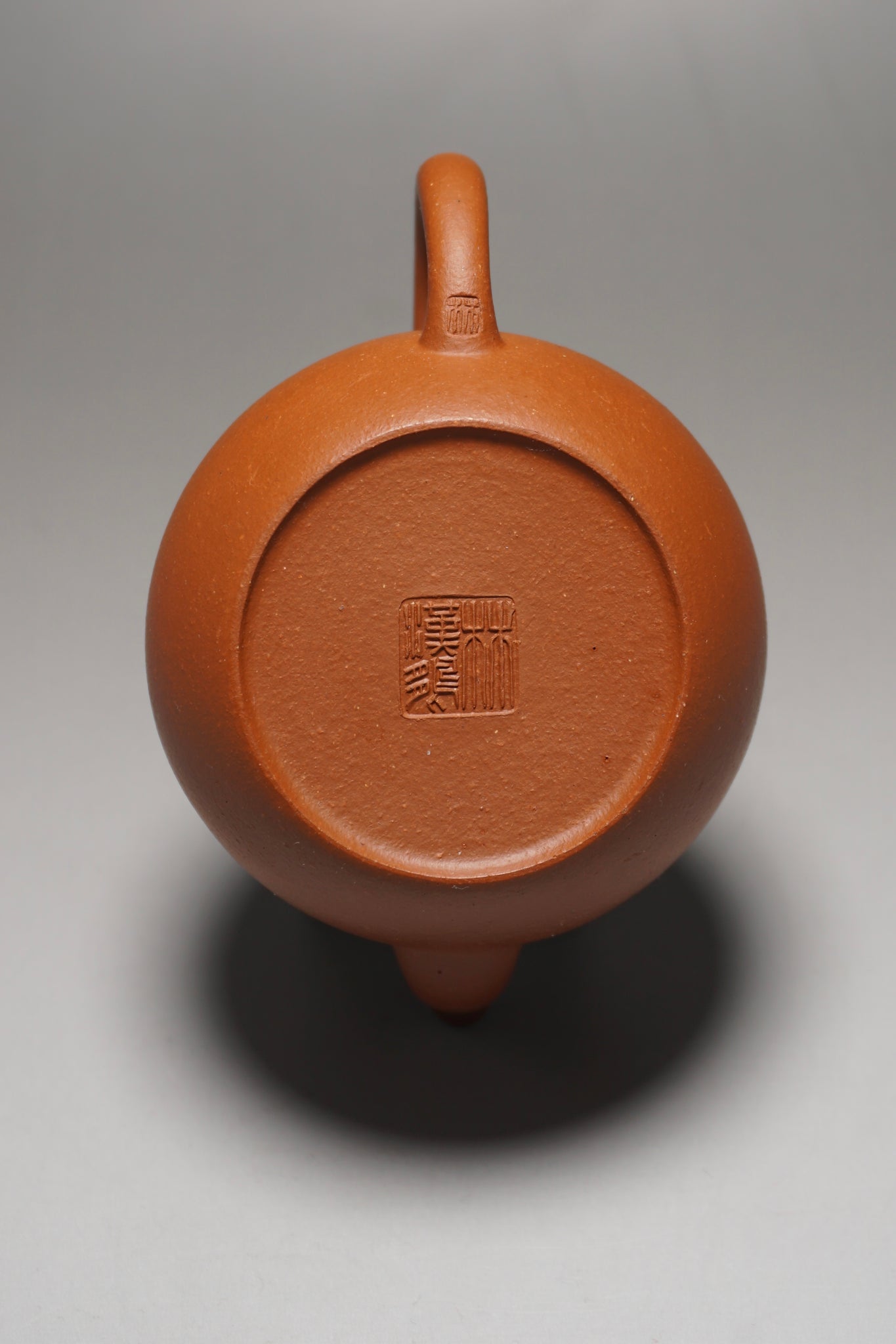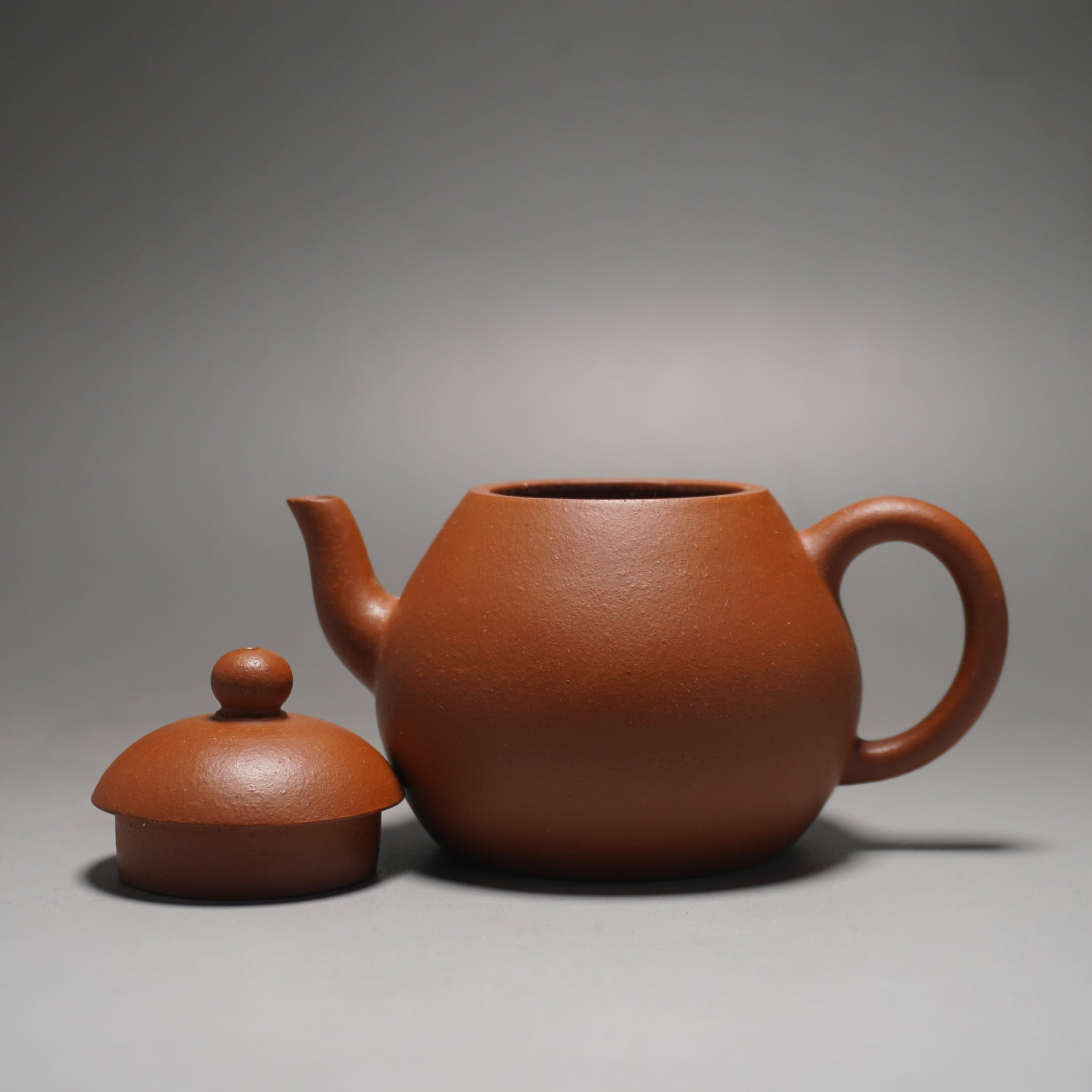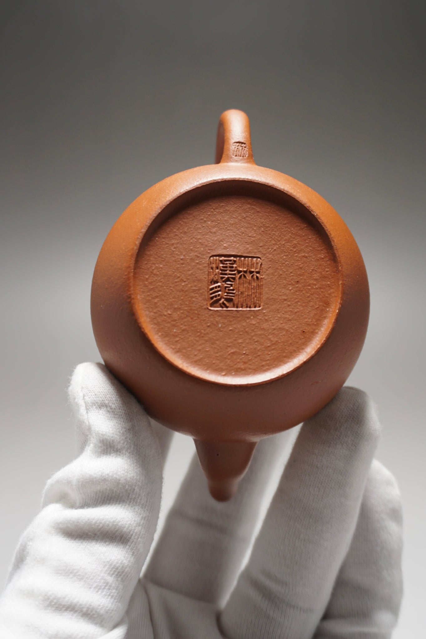 This is an yixing teapot made from the rarer red clay known as zhuni 朱泥. As you can see from the photos, zhuni clay has a slight bumpy appearance. The clay will develop a shine from use. Zhuni clay is prized for its ability to bring out the best flavours. It is also the most difficult clay to fire as it is more likely to break during the process.