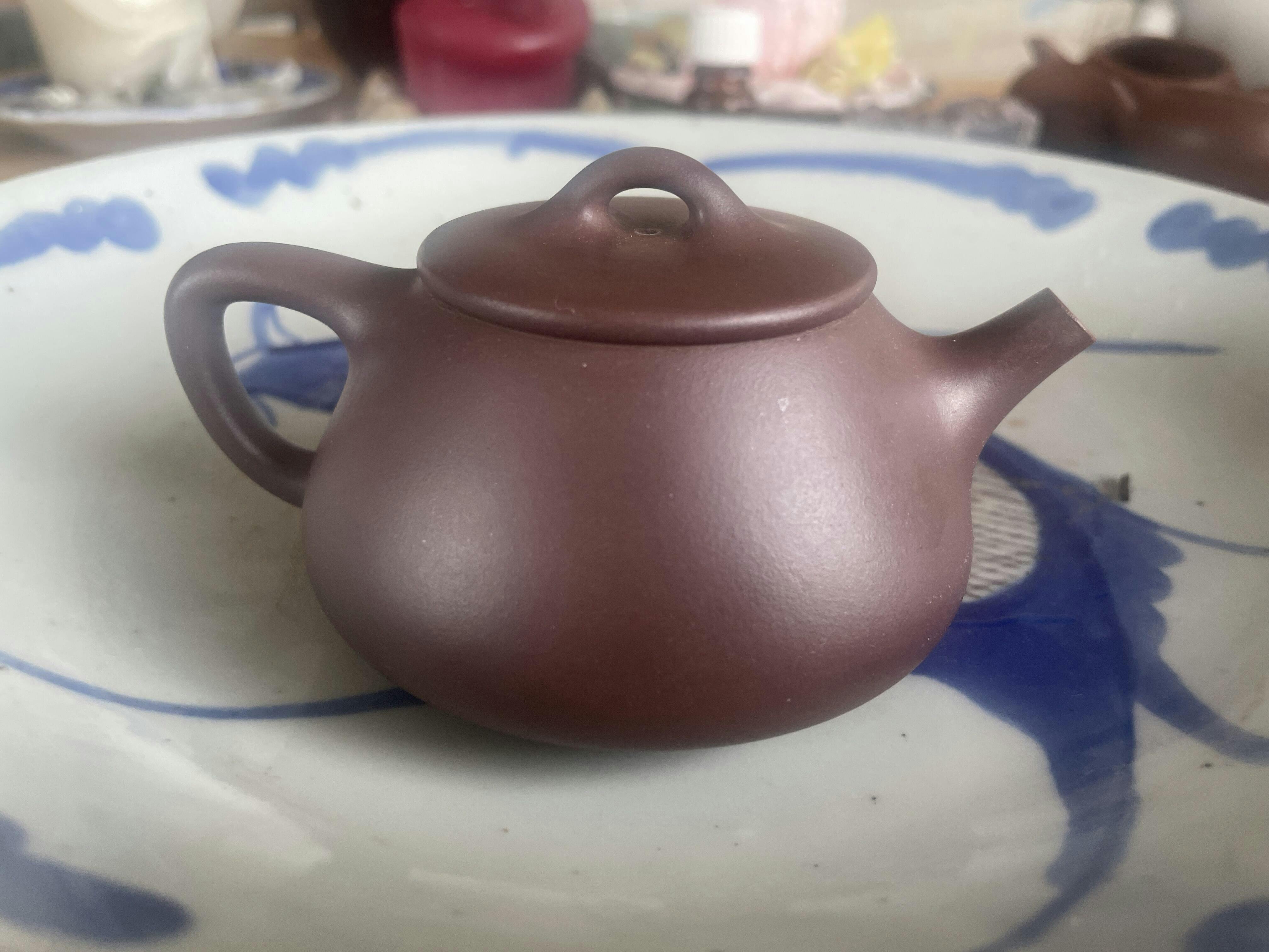 This is an Yixing teapot made from dicaoqing 底槽青 zisha, a dark brown-purple Yixing clay. This dicaoqing is original ore zisha from Huanglongshan. The clay has been aged for over 10 years. The ore itself was mined years before that, and left for years to weather before being processed. This clay is very versatile and is good for use with most kinds of tea.This clay is very versatile and is good for use with most kinds of tea.