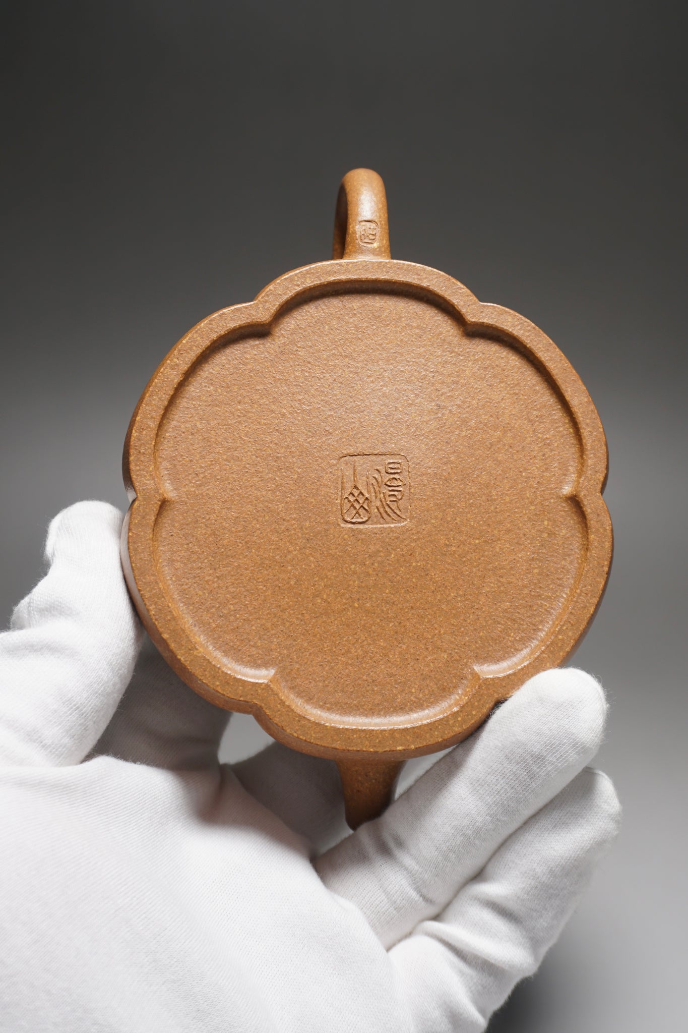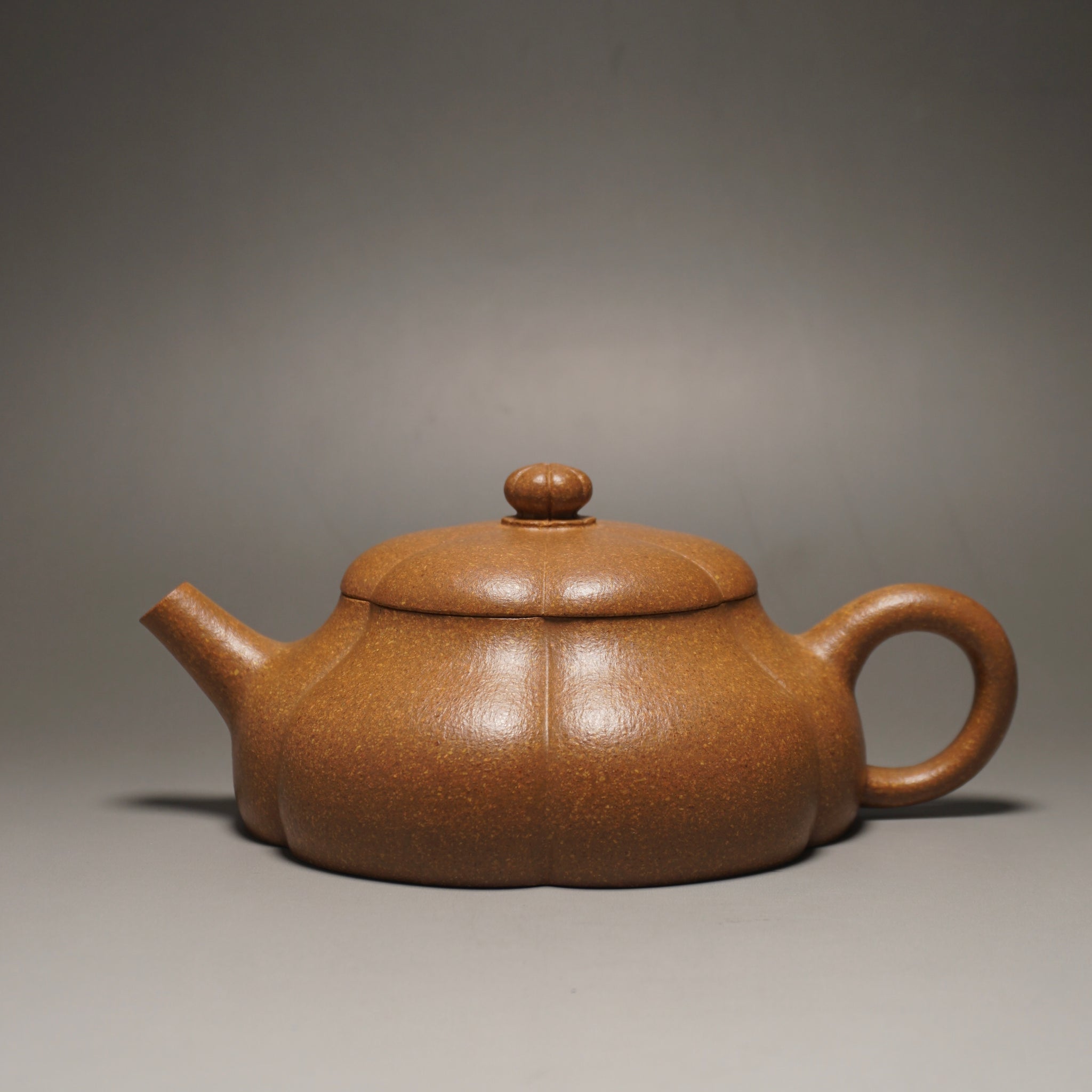This teapot shape is an exceptionally difficult shape to make as a fully handmade piece. This shape is known as 筋纹器 Jinwen. Generally speaking, there are three basic symmetrical shapes for the body of an Yixing Teapot: Round, square and jingwen. The jingwen teapot is the most difficult of the three and the difficulty in maintaining the symmetry of the shape increases with the number of sides or lobes. The greater the number of lobes, the greater the difficulty in constructing the teapot.