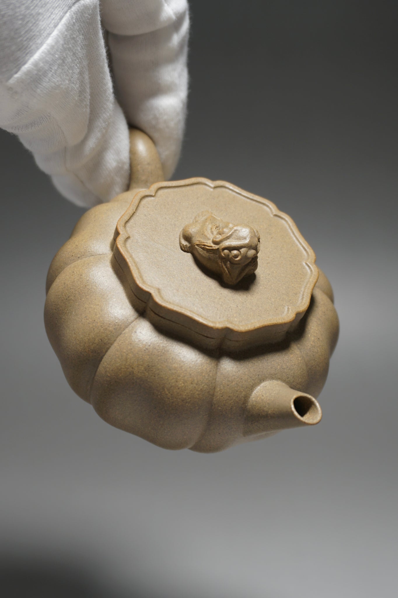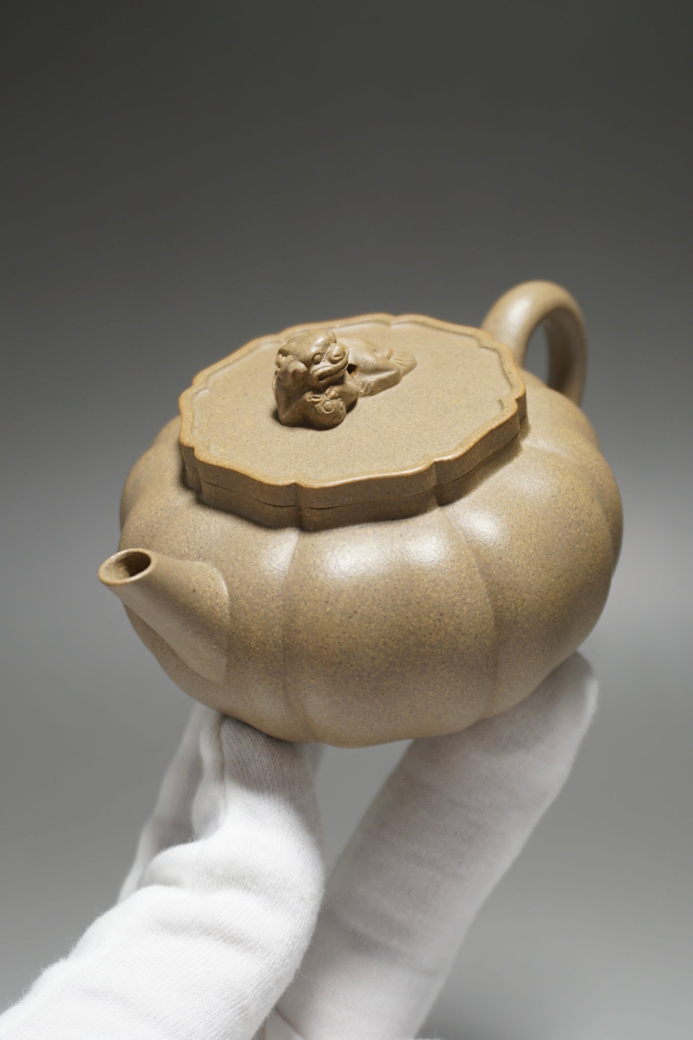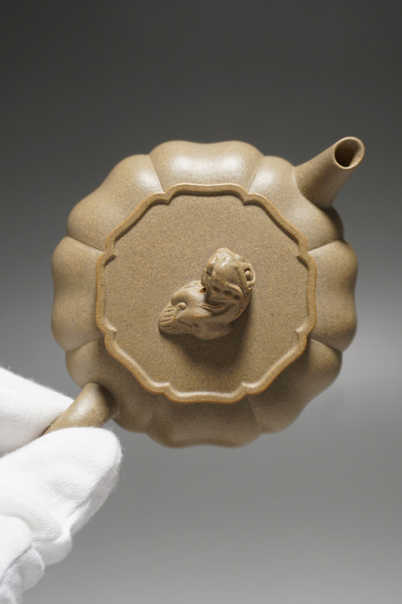This pot is known as fully handmade as unlike most Yixing teapots that are half handmade the sculptor does not use a molding tool to shape the body, but instead shapes everything, including the body, by hand. Fully handmade teapots require more labor and more skill to construct, especially in the case of more complex shapes. Each one is entirely unique.