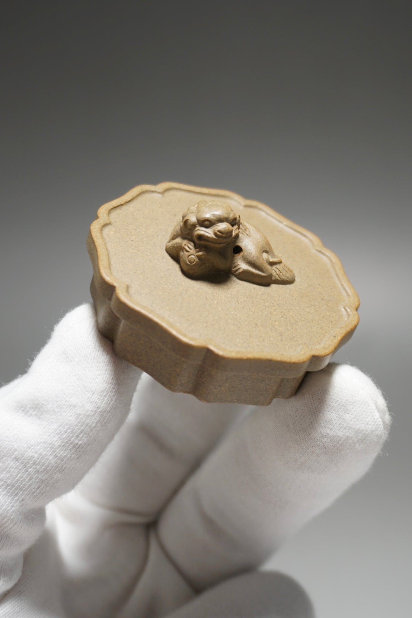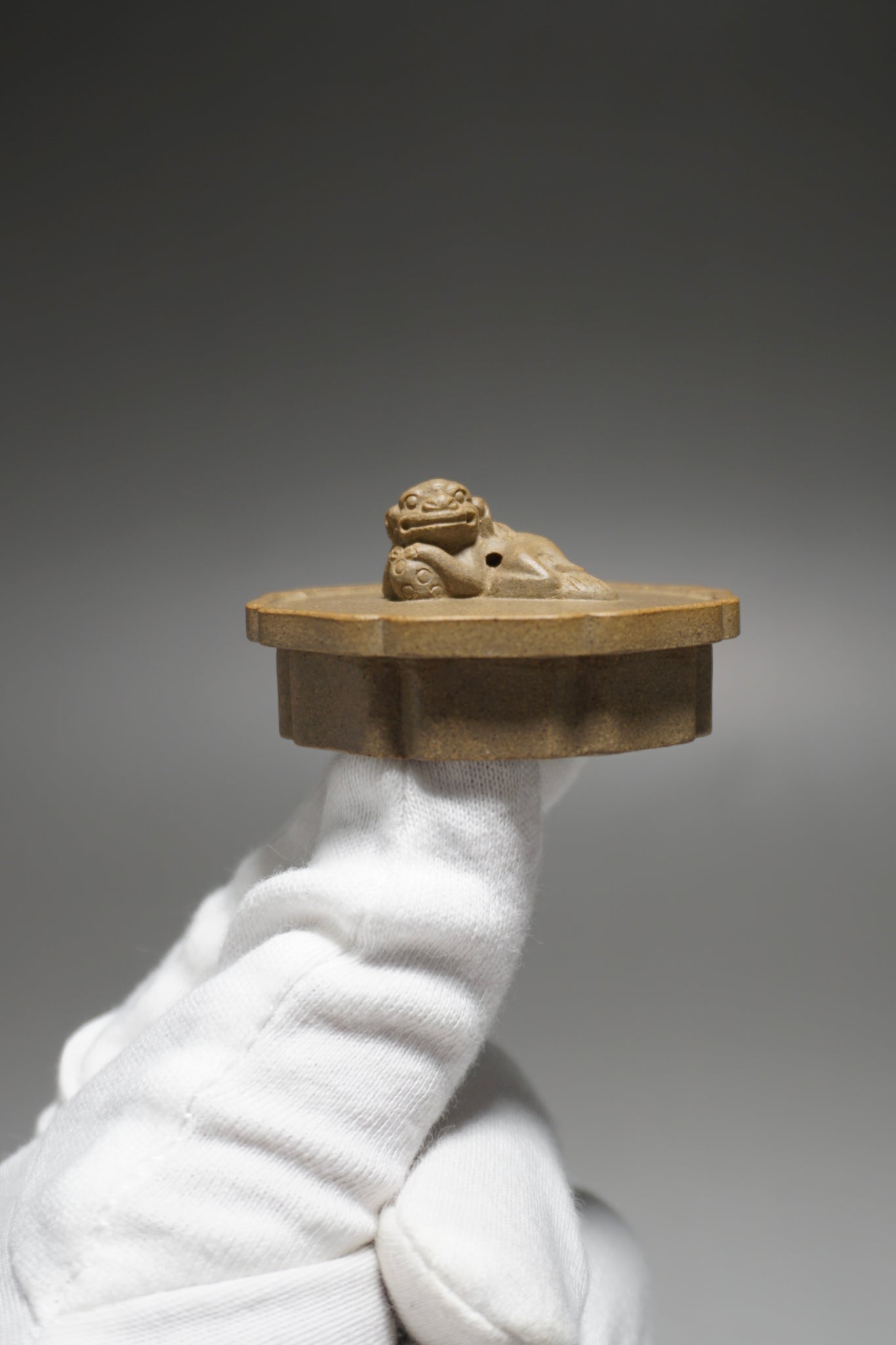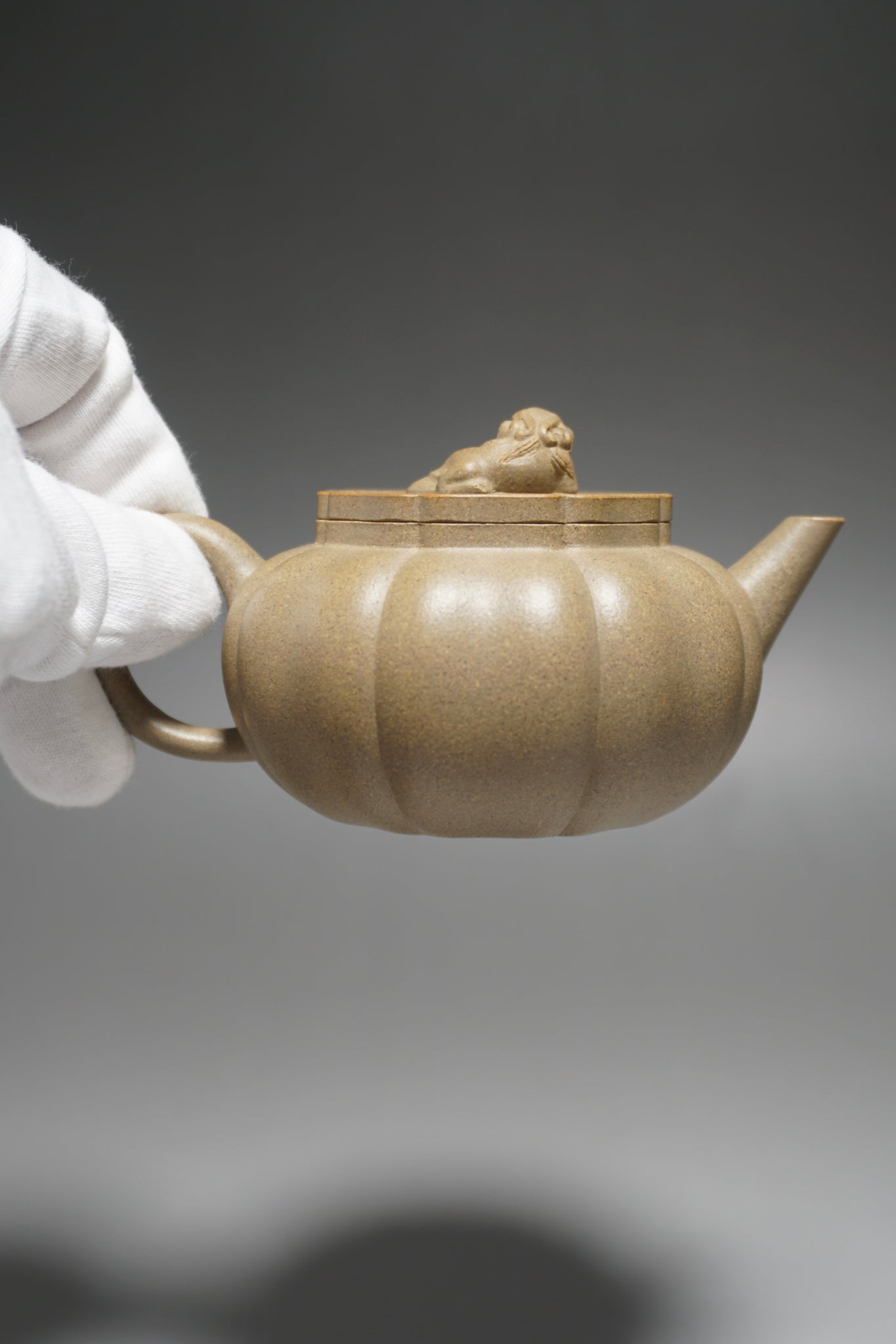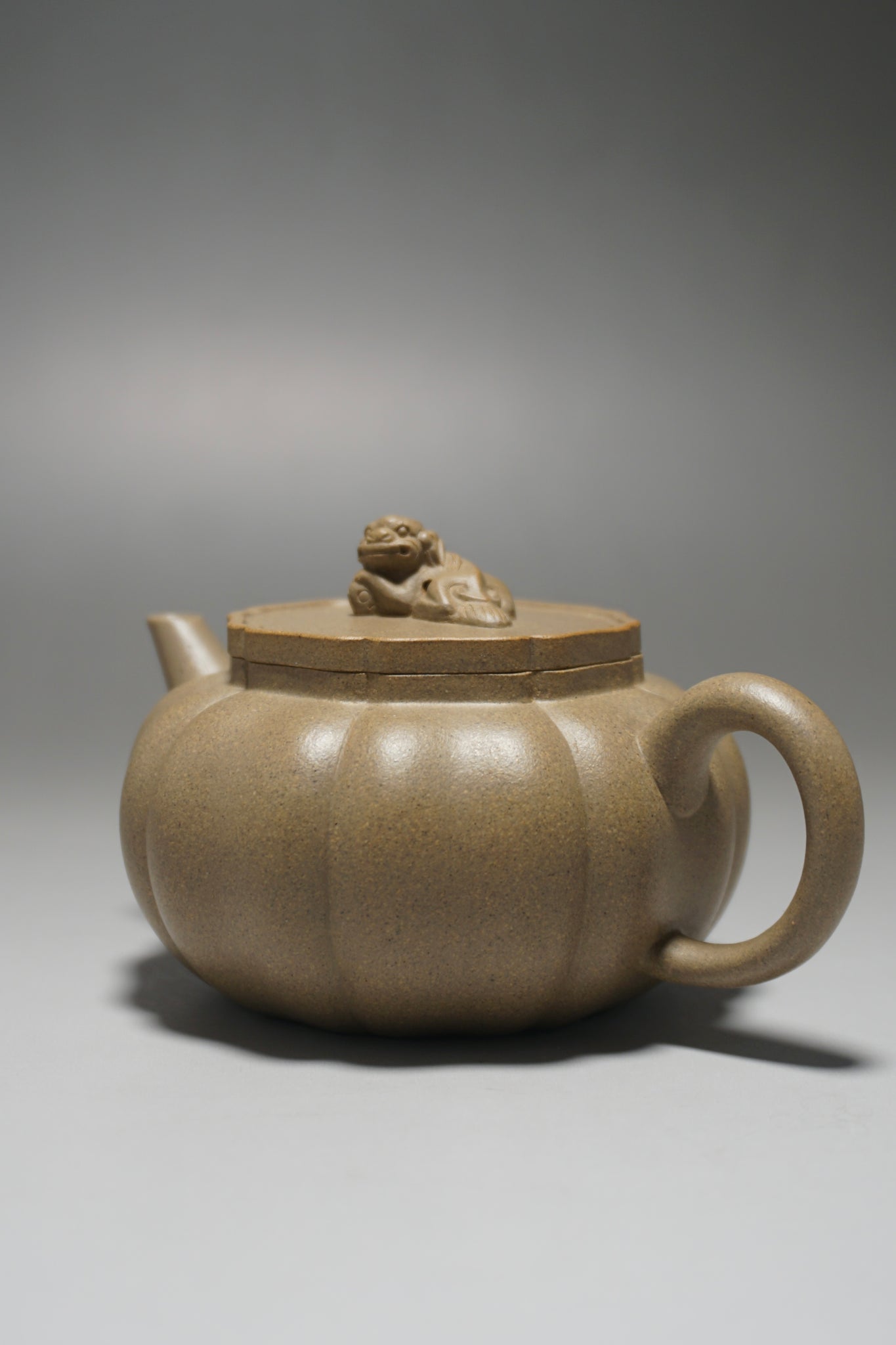 This pot is known as fully handmade as unlike most Yixing teapots that are half handmade the sculptor does not use a molding tool to shape the body, but instead shapes everything, including the body, by hand. Fully handmade teapots require more labor and more skill to construct, especially in the case of more complex shapes. Each one is entirely unique.