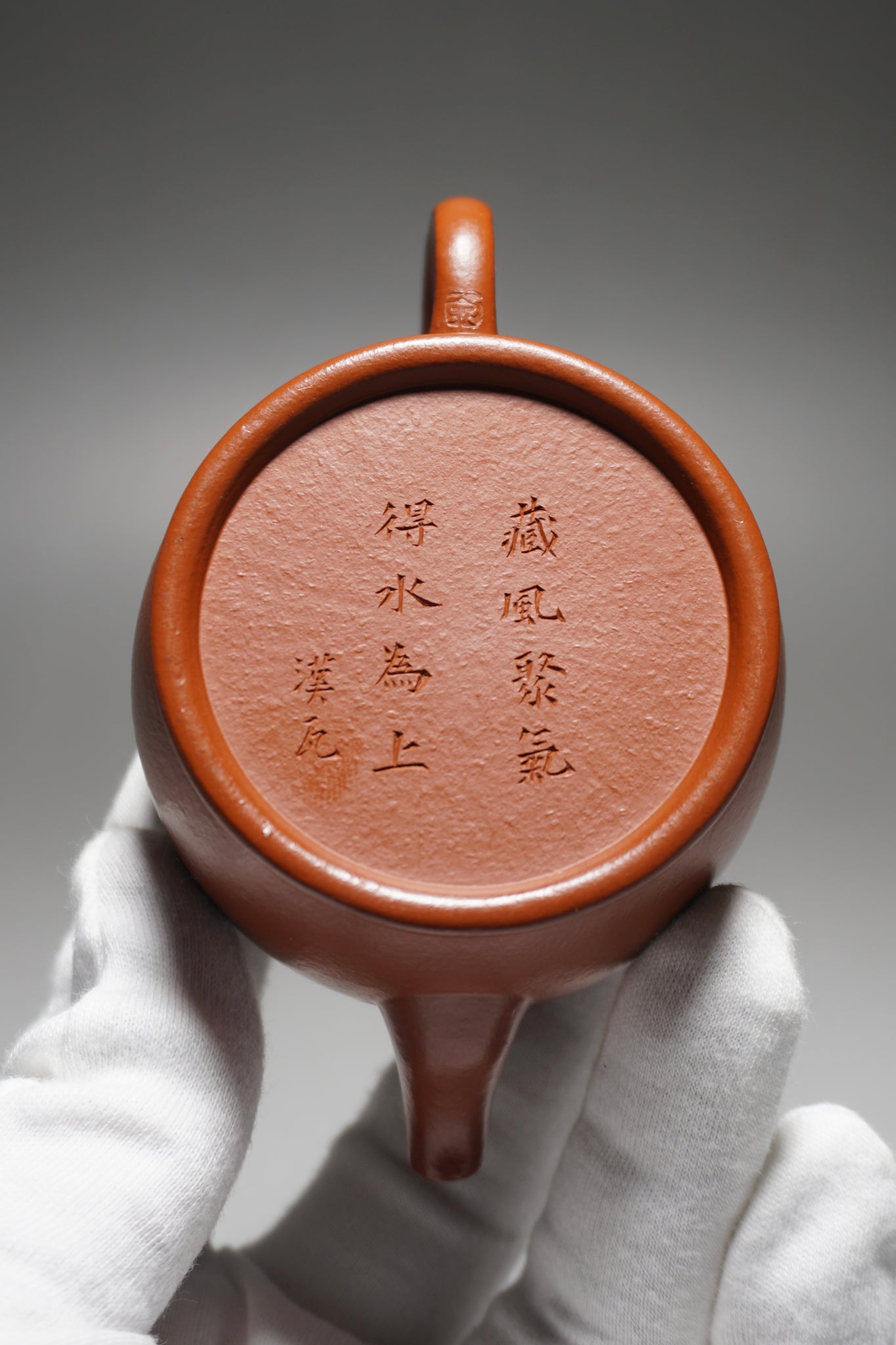 The teapot features an inscription on the bottom that reads, 藏风聚气 得水为上 “Harness the wind and gather the qi; having access to water is most important.”