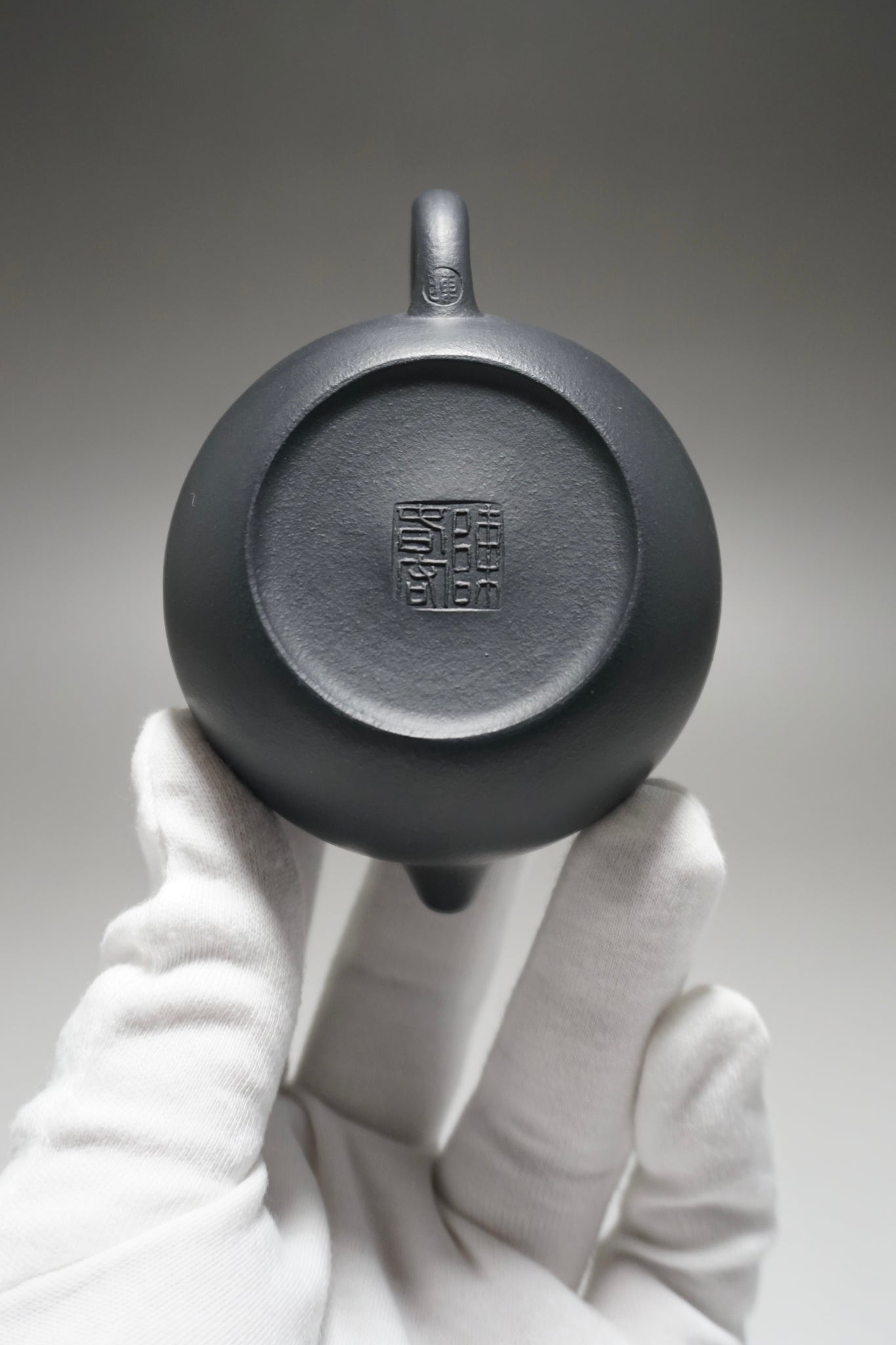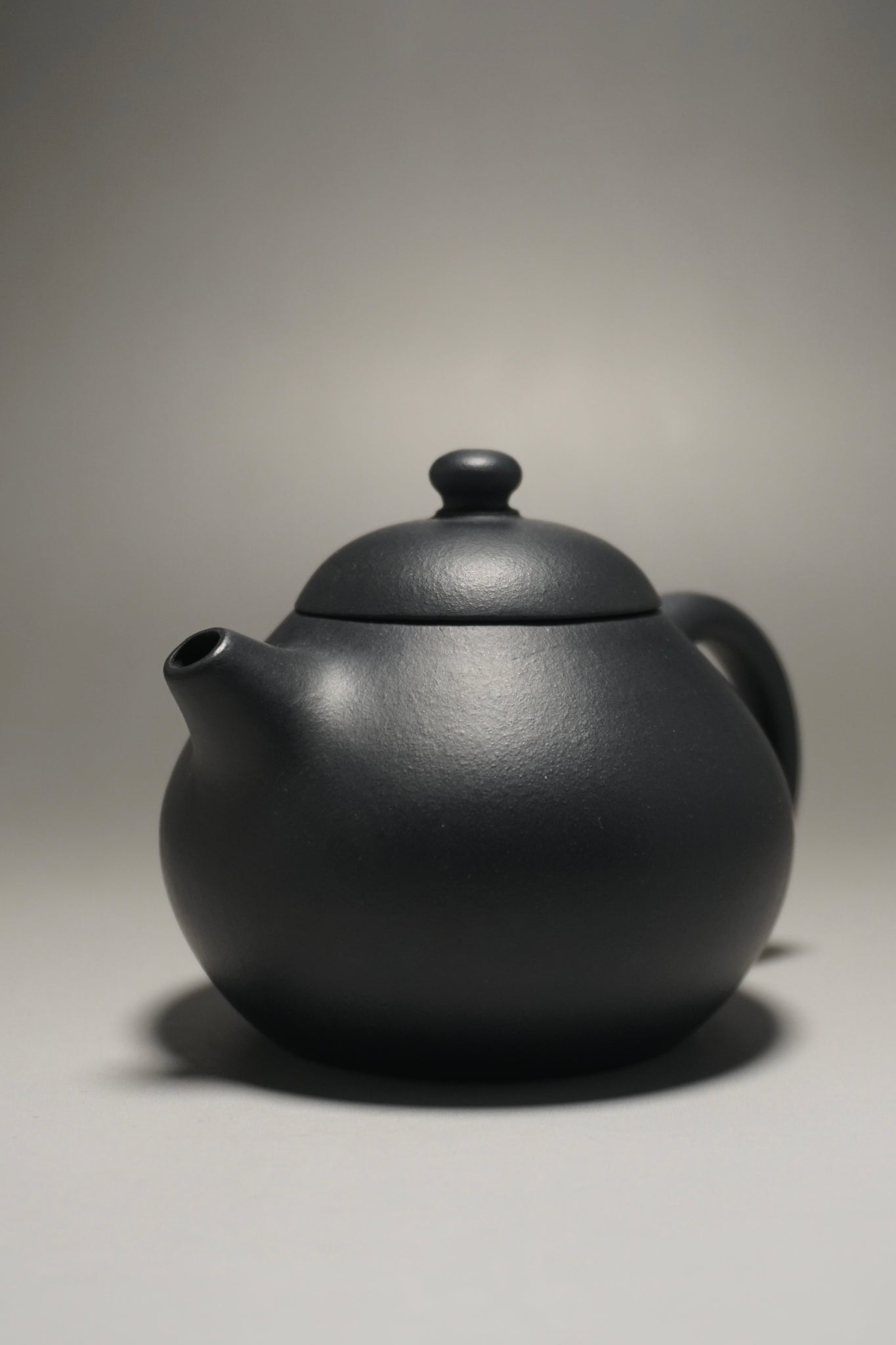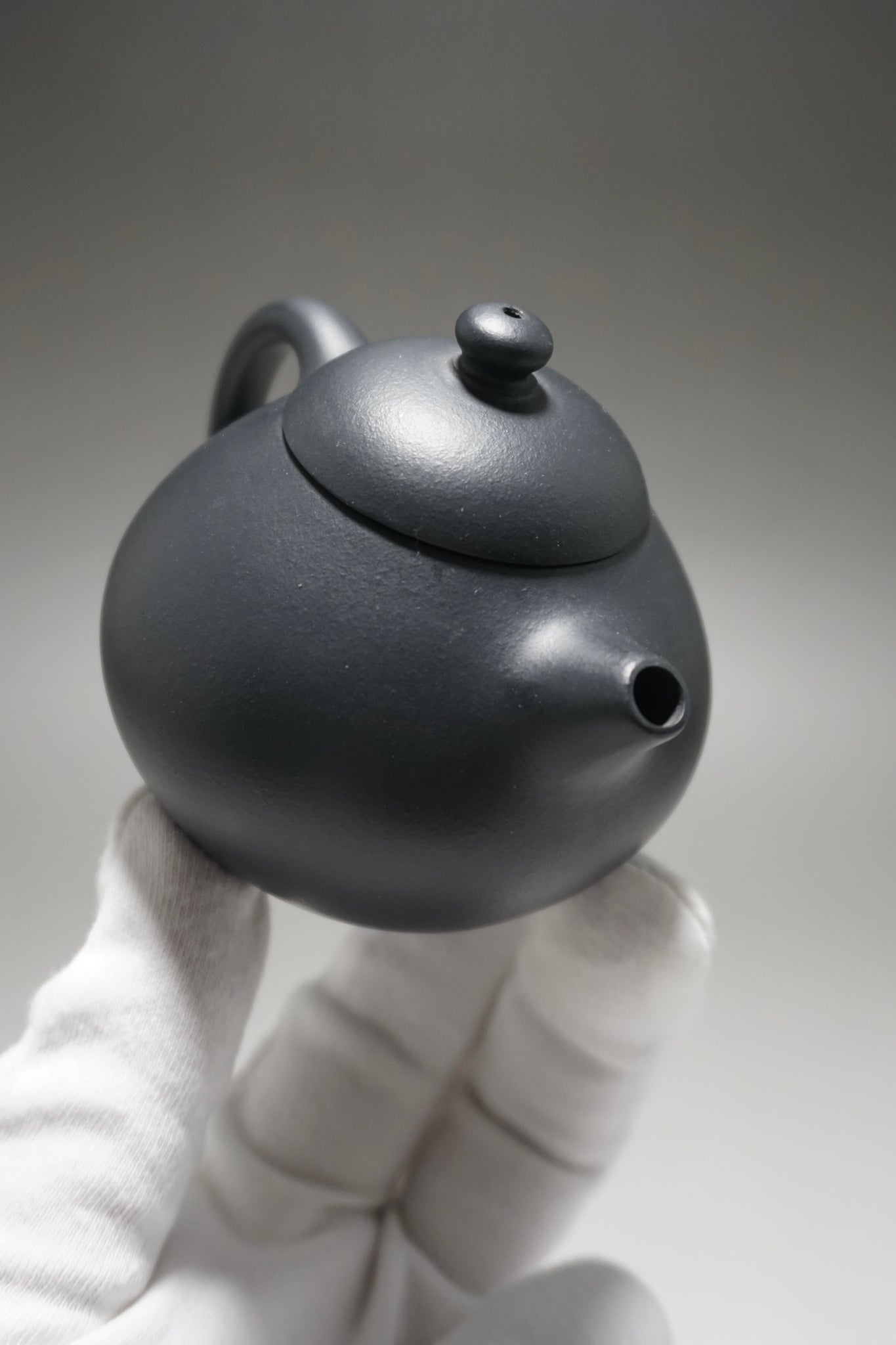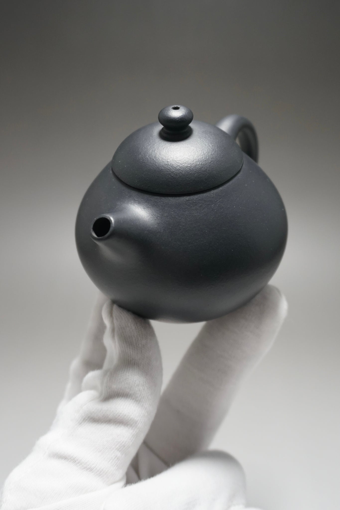 This "heini" or "black clay" Yixing teapot is produced by firing original ore lao zini clay in a low oxygen environment in the kiln. The clay has the same properties as lao zini fired in oxidation firing, but appears black instead of brown/purple.