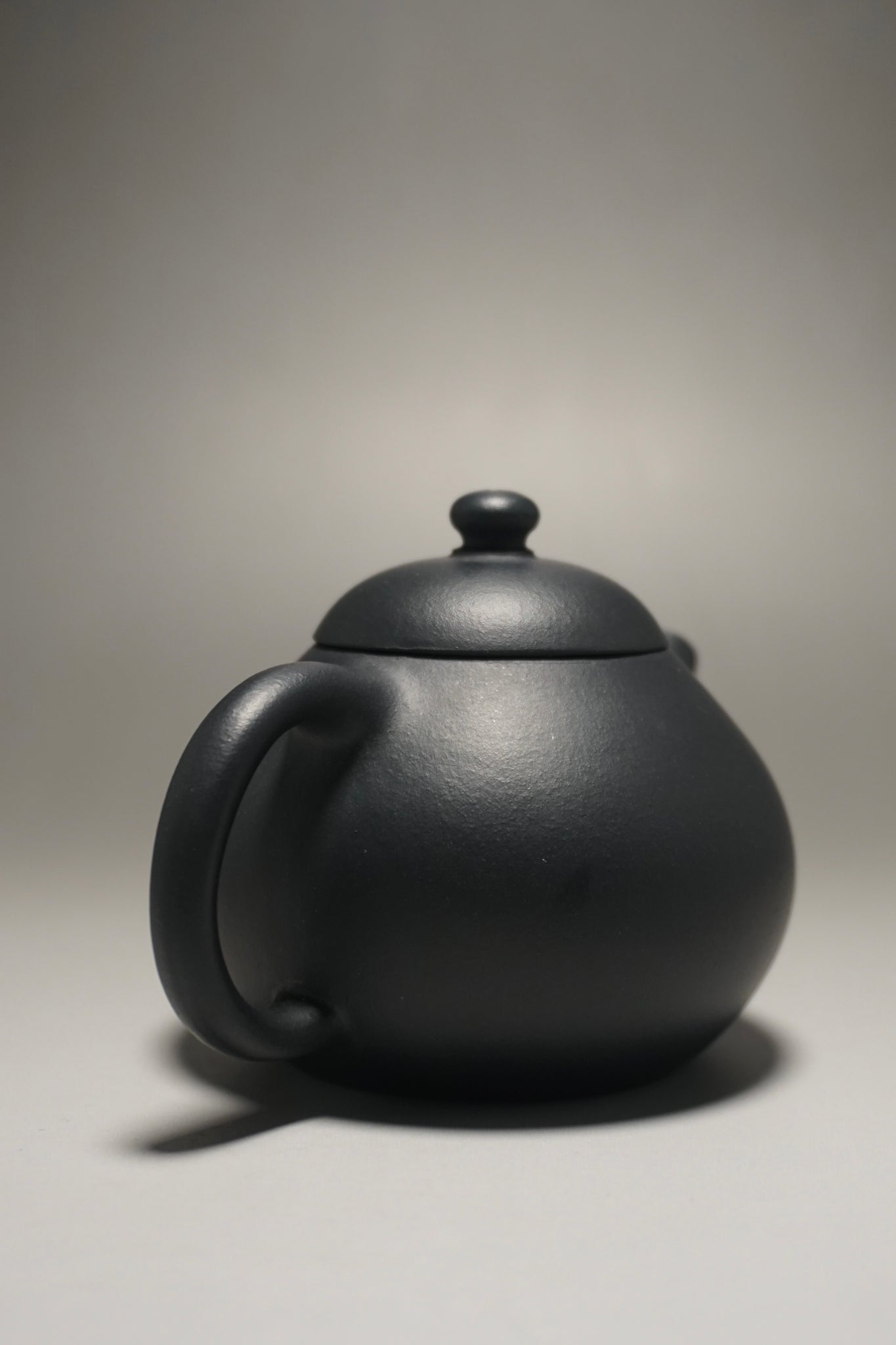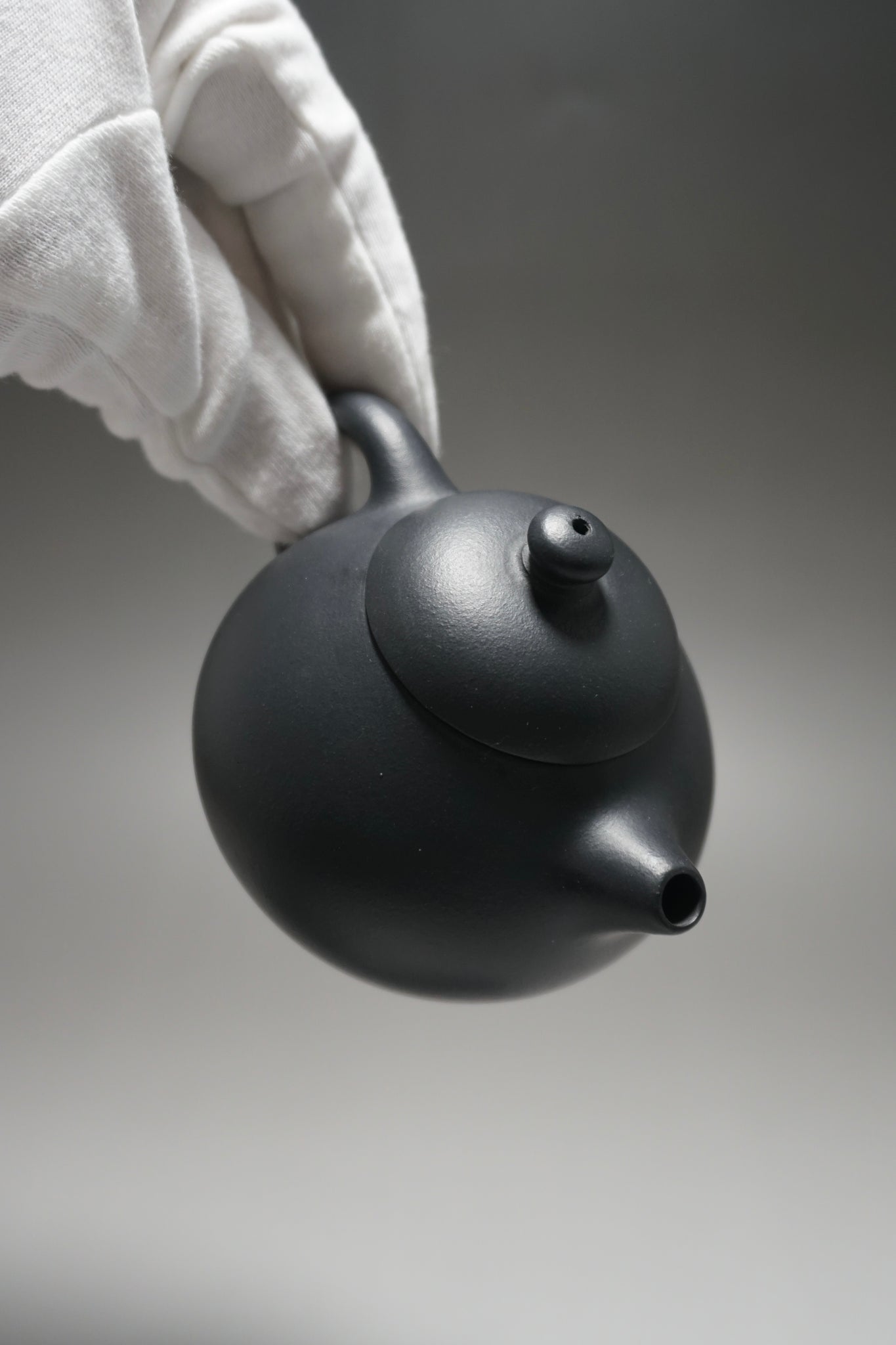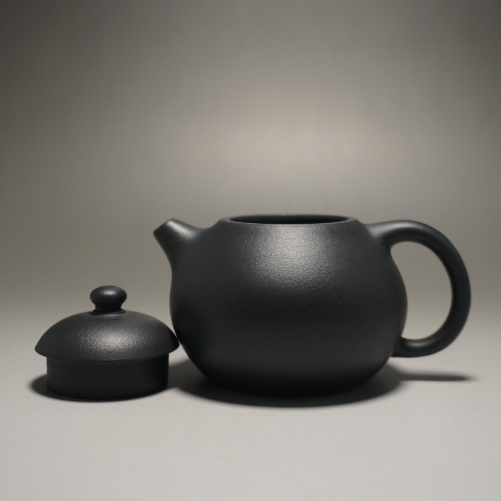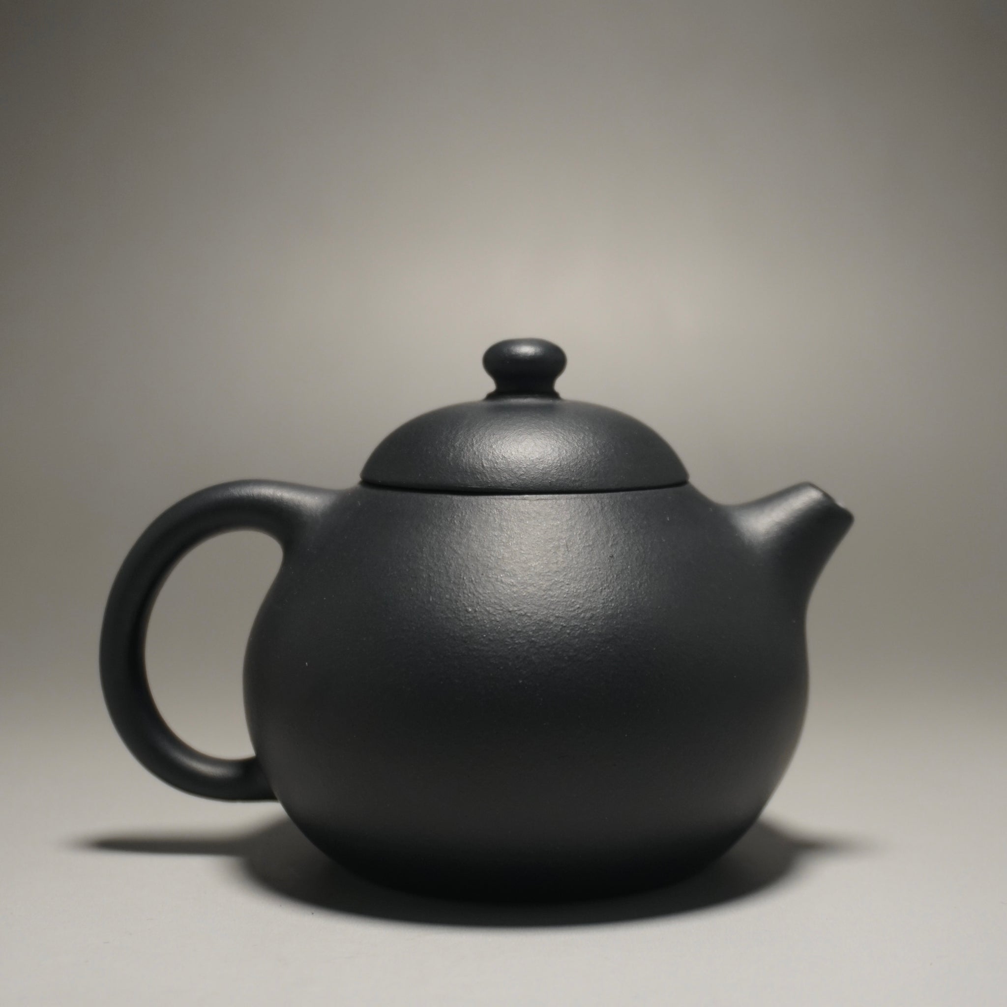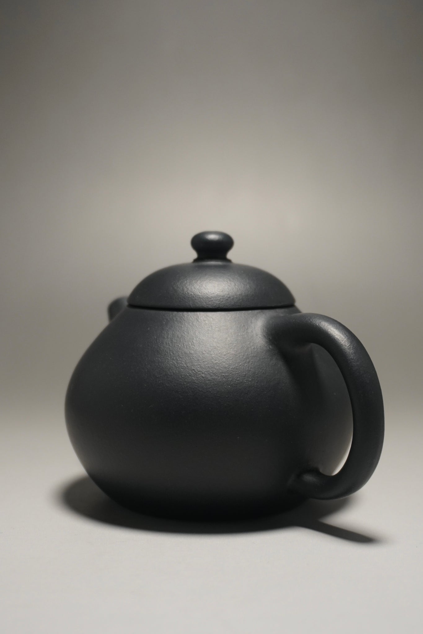 This "heini" or "black clay" Yixing teapot is produced by firing original ore lao zini clay in a low oxygen environment in the kiln. The clay has the same properties as lao zini fired in oxidation firing, but appears black instead of brown/purple.