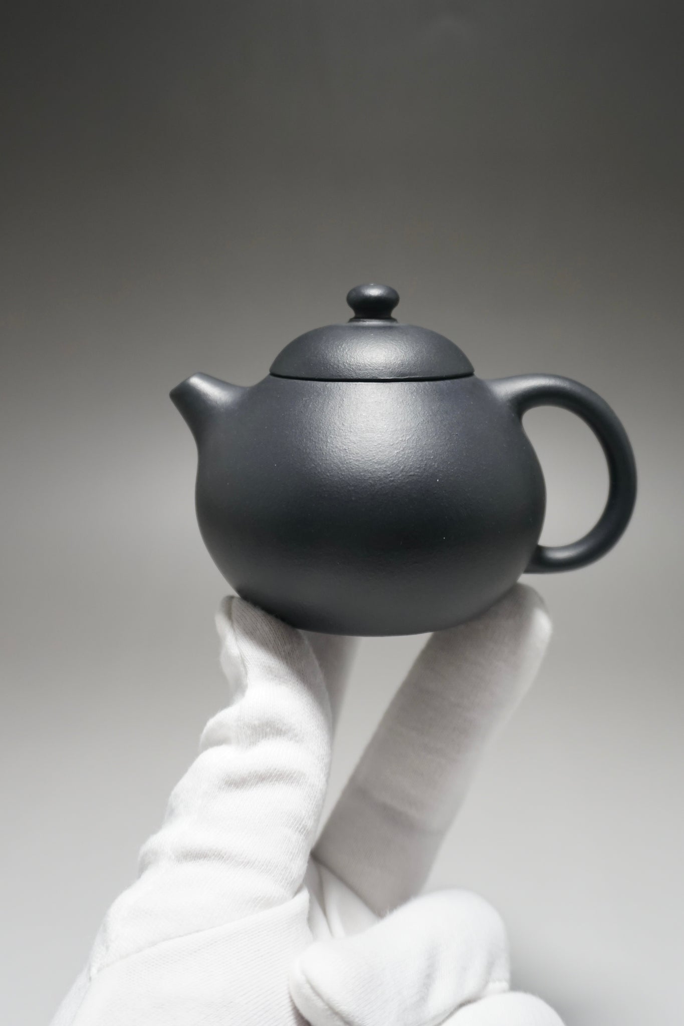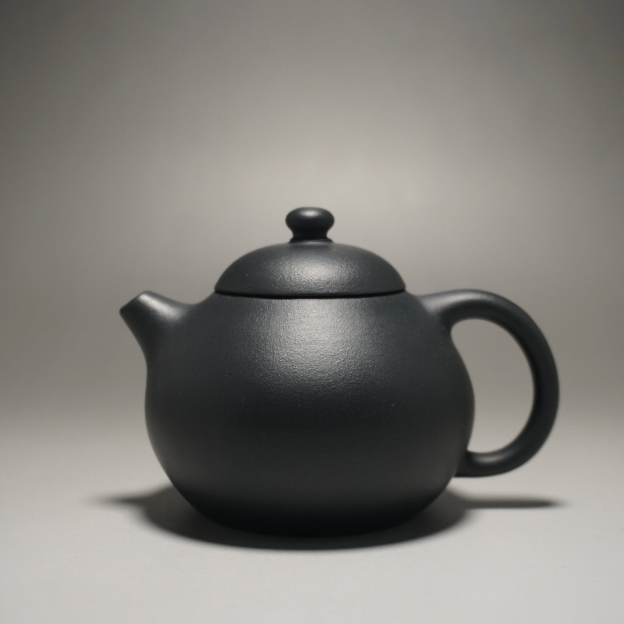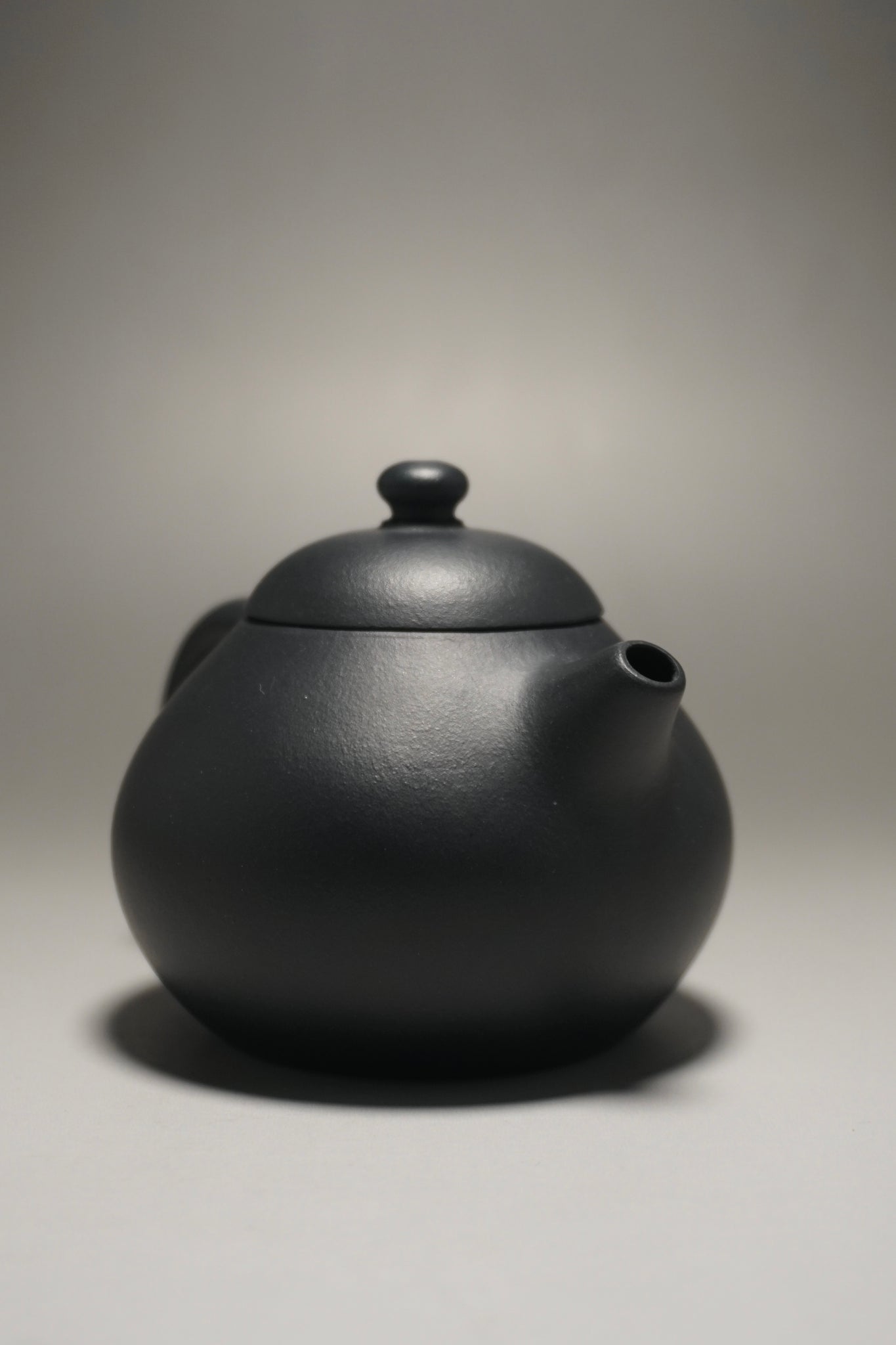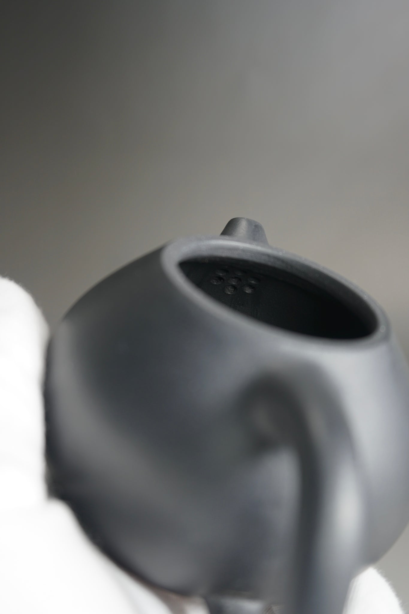 This "heini" or "black clay" Yixing teapot is produced by firing original ore lao zini clay in a low oxygen environment in the kiln. The clay has the same properties as lao zini fired in oxidation firing, but appears black instead of brown/purple.