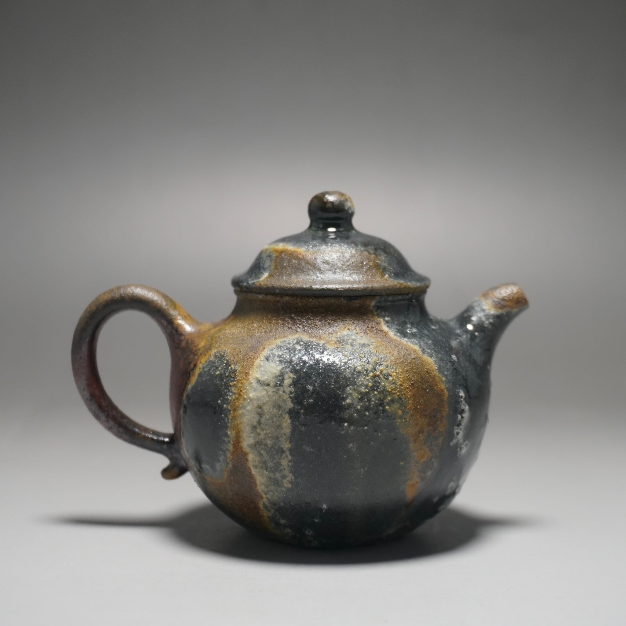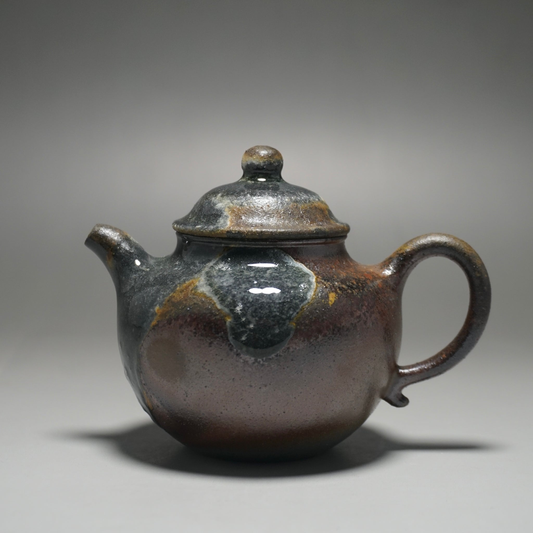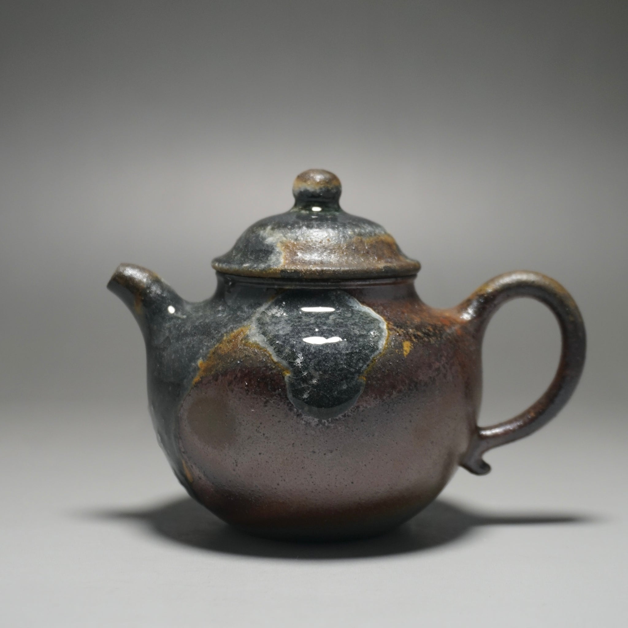 This teapot was fired in a traditional wood kiln in Yixing. The pattern, color and finish are the result of being fired uncovered in a wood kiln for 3 days and 4 nights. The pine wood ash falls on the surface of the teapot forming a natural glaze that is sometimes glossy black, red, brown, yellow, green or any combination of these colors. Wood Fired Yixing Teapots each have their own special appearance, no two are the same. Photos are of actual teapot.