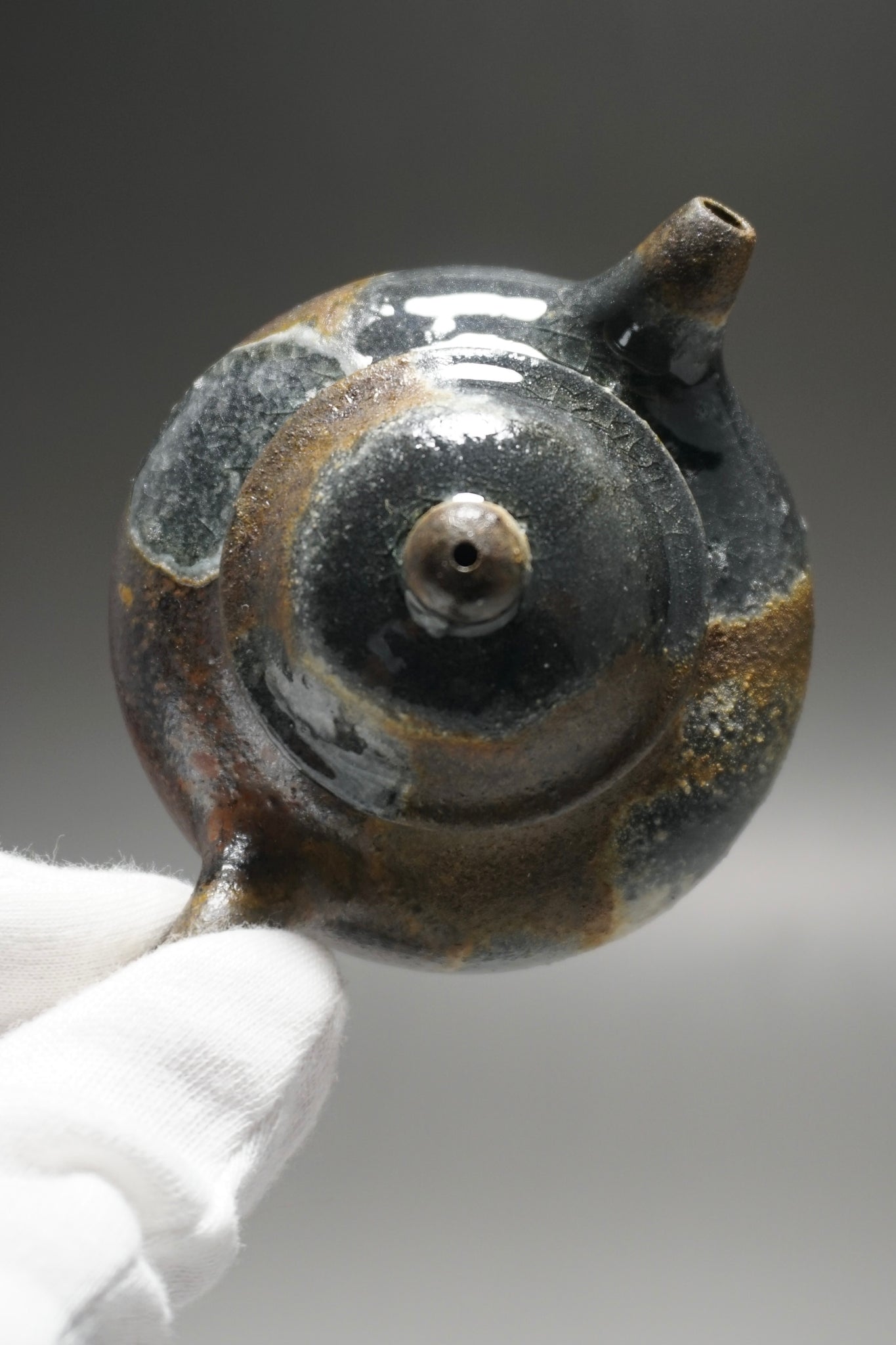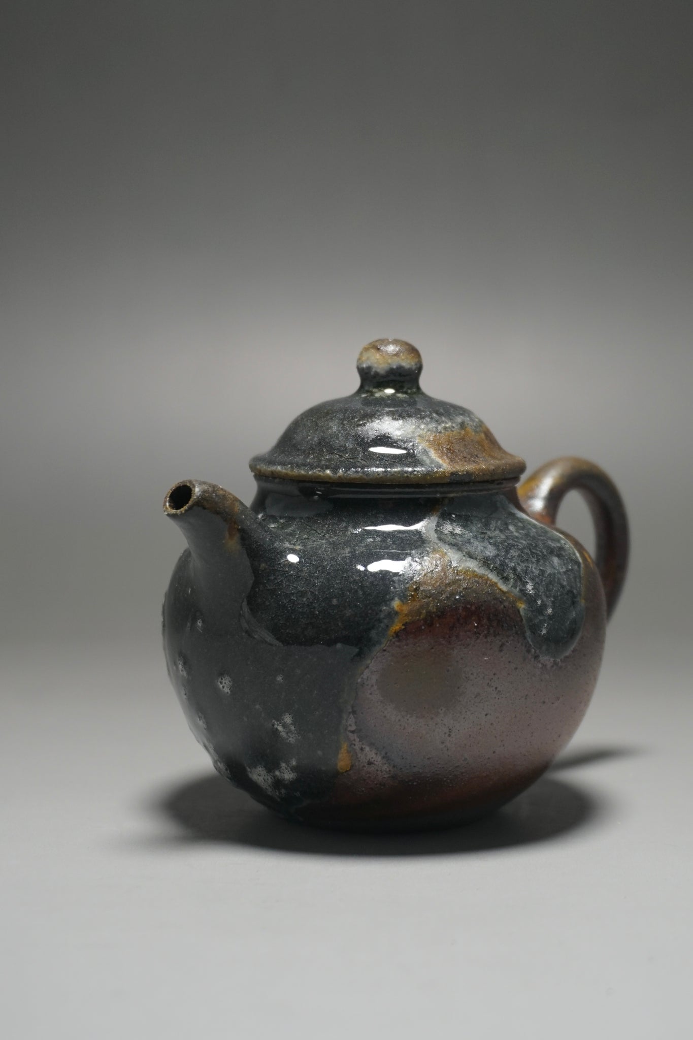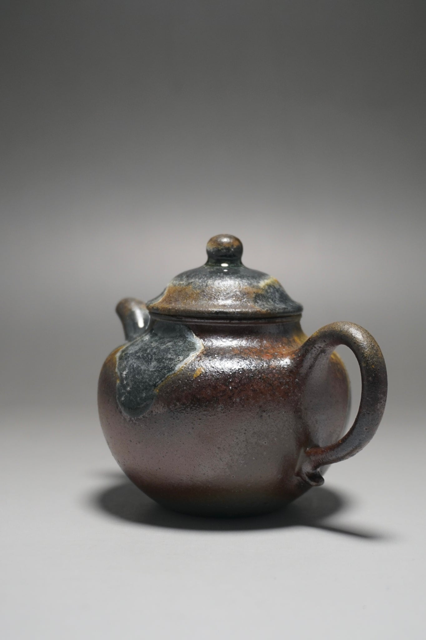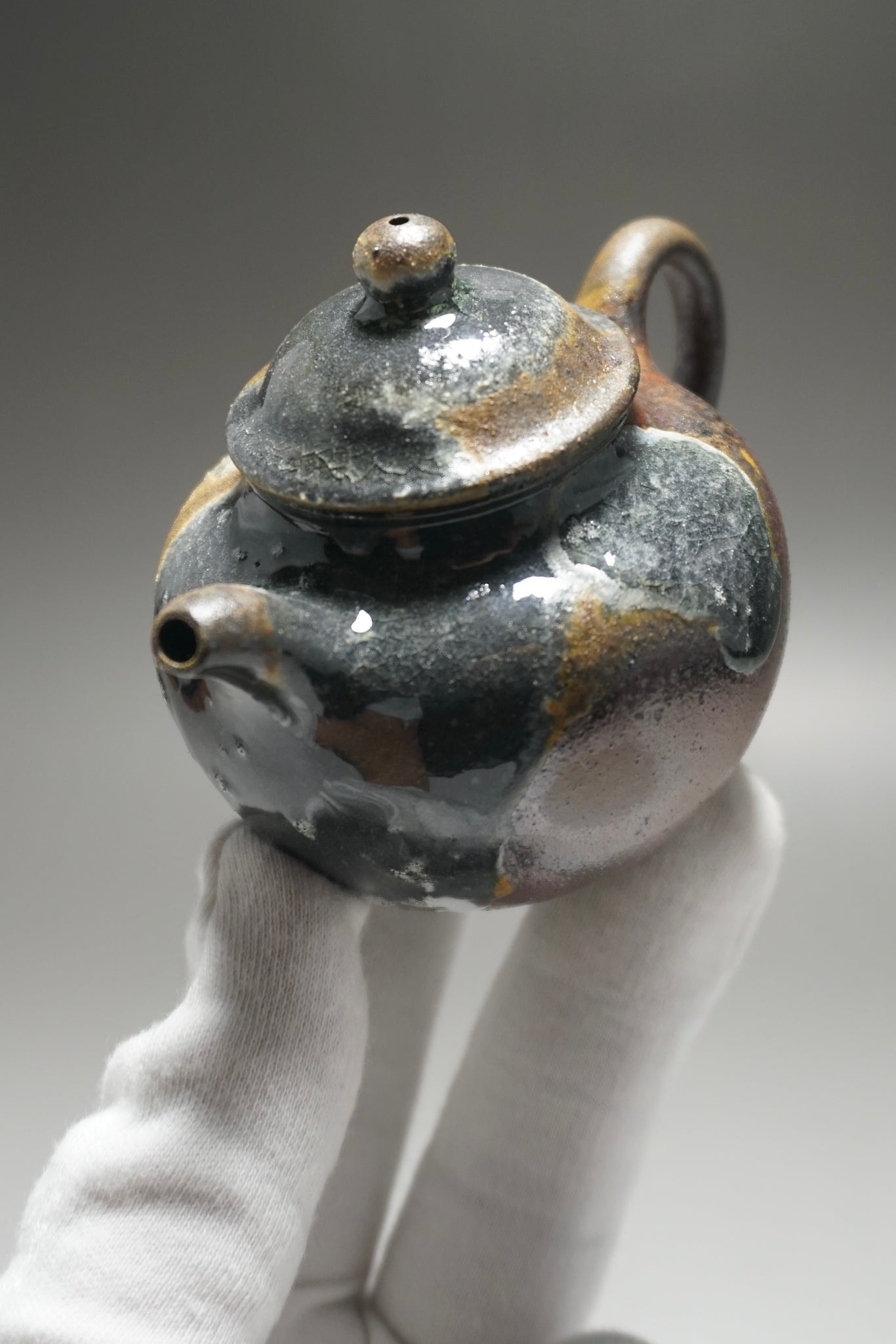 This teapot was fired in a traditional wood kiln in Yixing. The pattern, color and finish are the result of being fired uncovered in a wood kiln for 3 days and 4 nights. The pine wood ash falls on the surface of the teapot forming a natural glaze that is sometimes glossy black, red, brown, yellow, green or any combination of these colors. Wood Fired Yixing Teapots each have their own special appearance, no two are the same. Photos are of actual teapot.