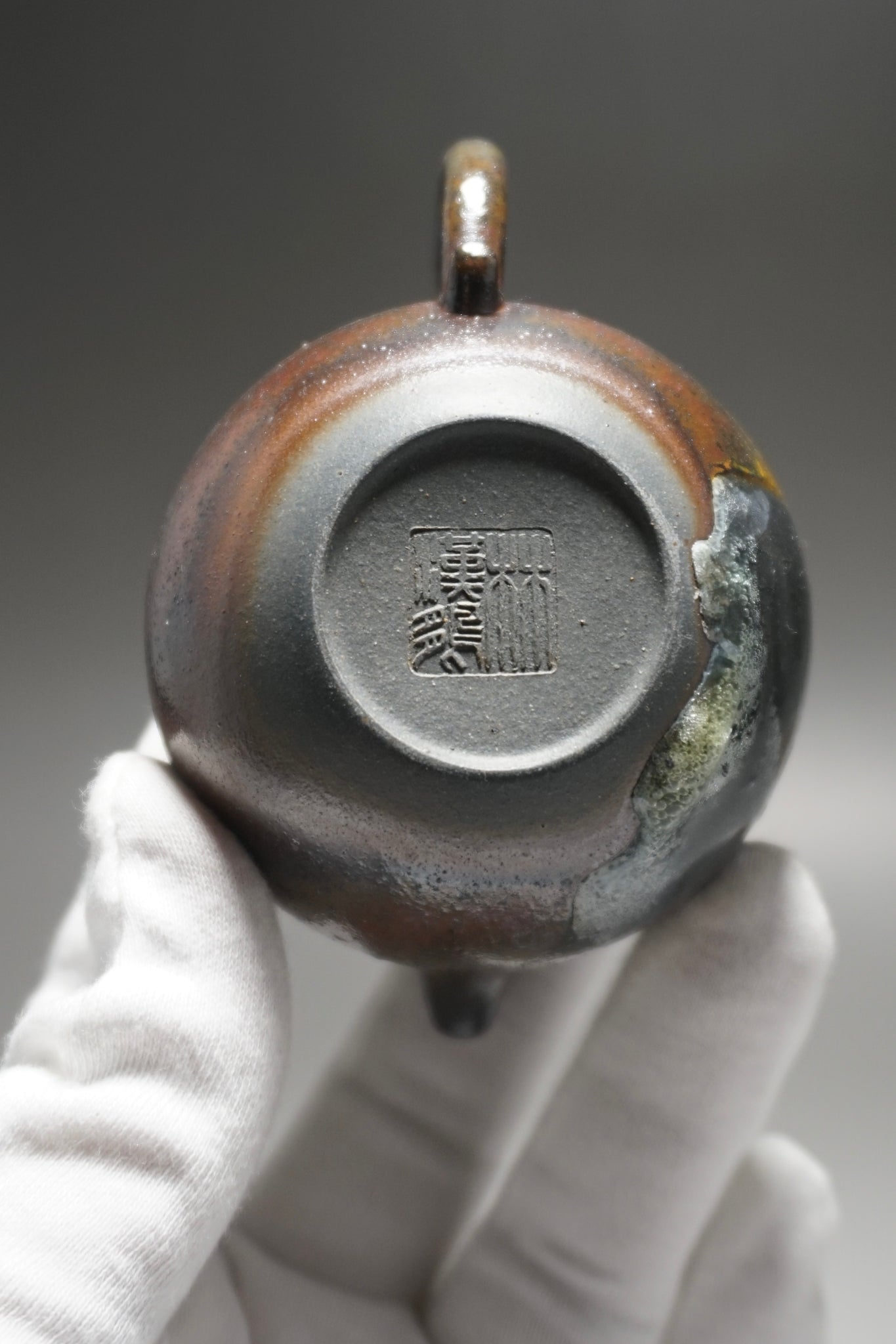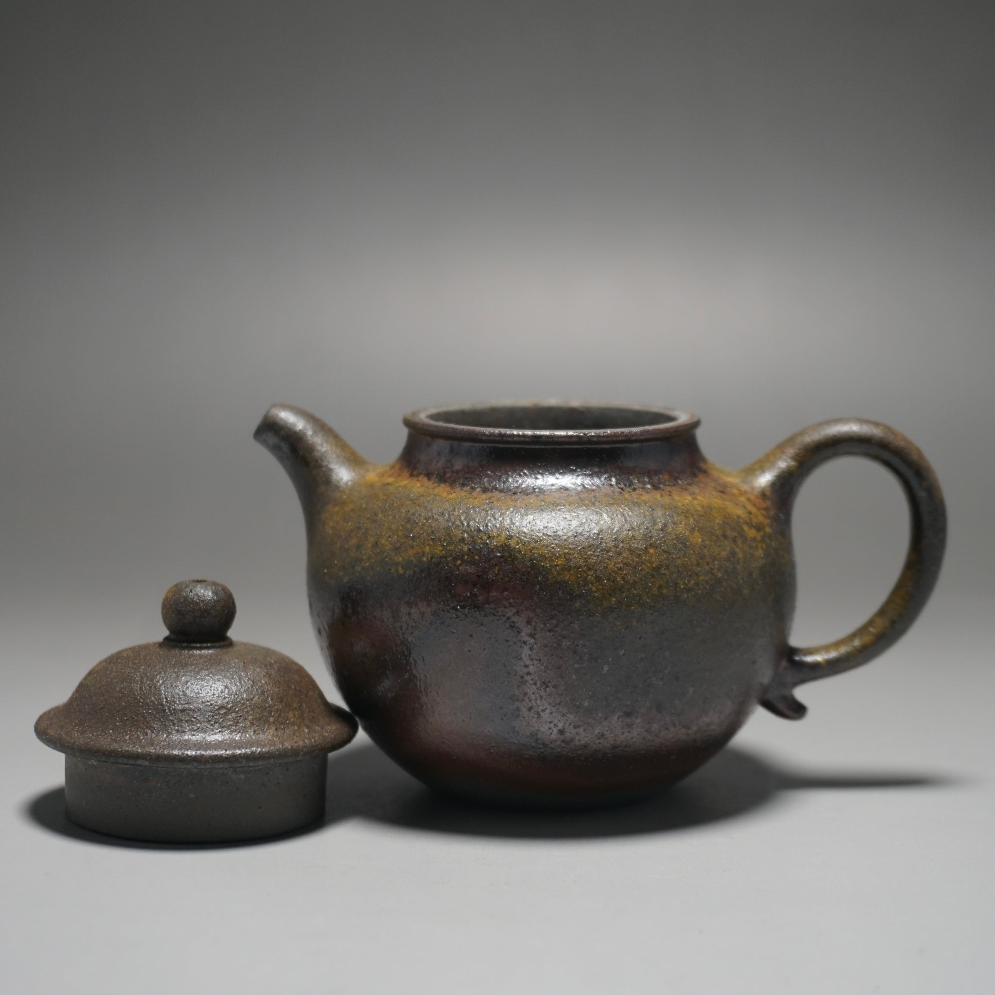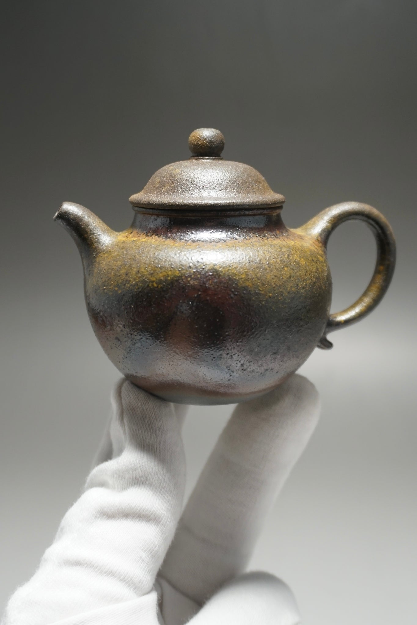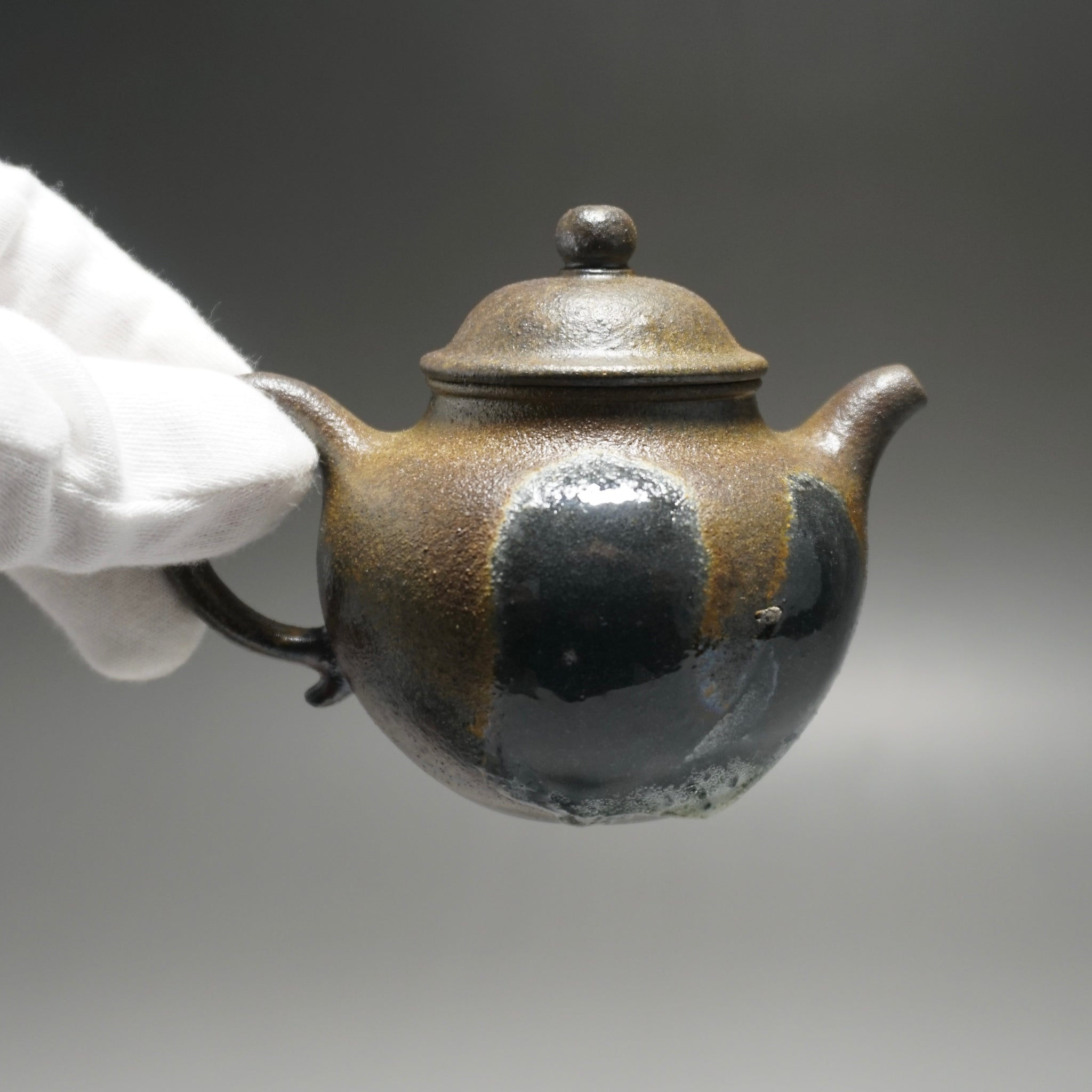 This teapot was fired in a traditional wood kiln in Yixing. The pattern, color and finish are the result of being fired uncovered in a wood kiln for 3 days and 4 nights. The pine wood ash falls on the surface of the teapot forming a natural glaze that is sometimes glossy black, red, brown, yellow, green or any combination of these colors. Wood Fired Yixing Teapots each have their own special appearance, no two are the same. Photos are of actual teapot.