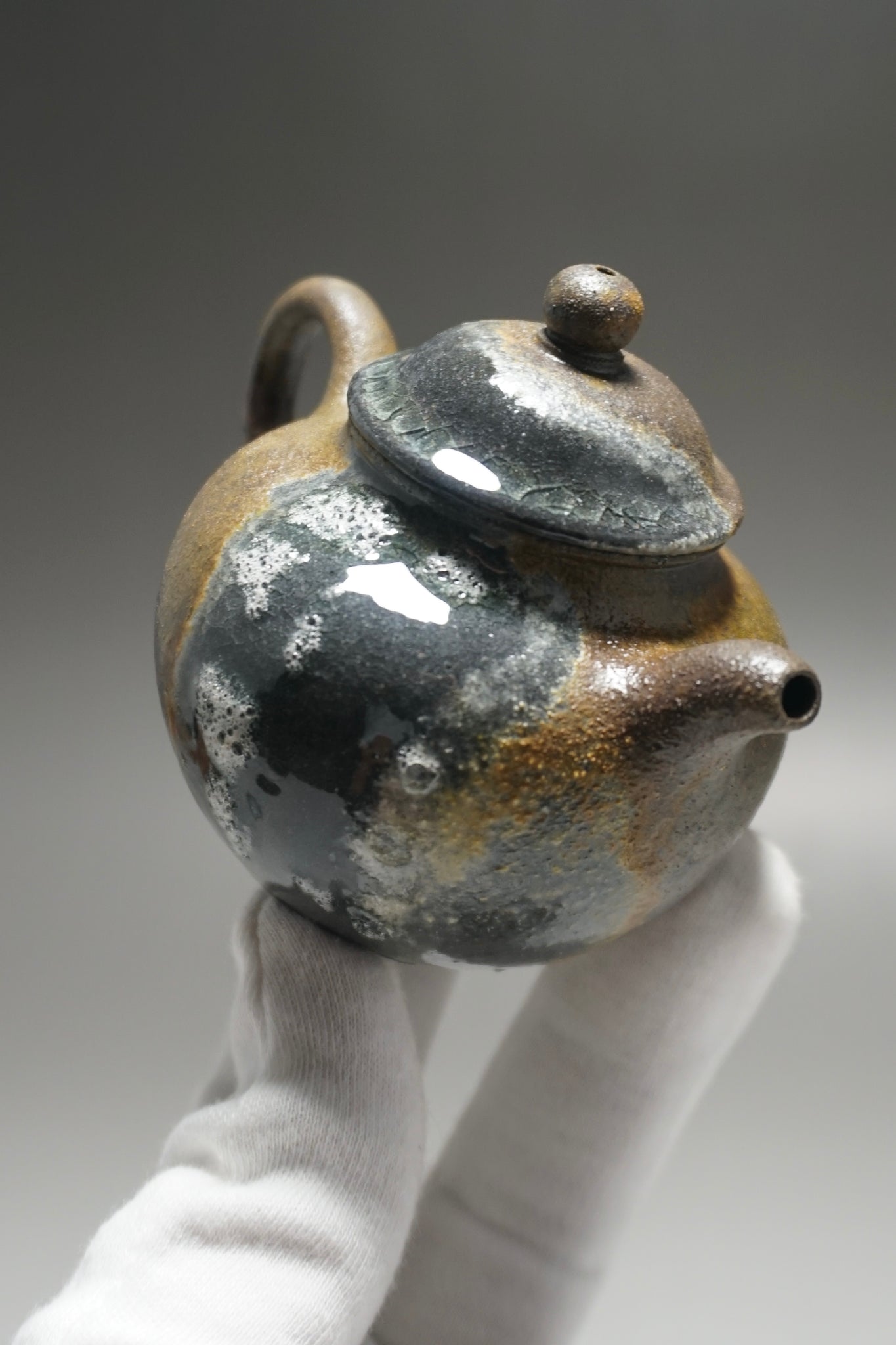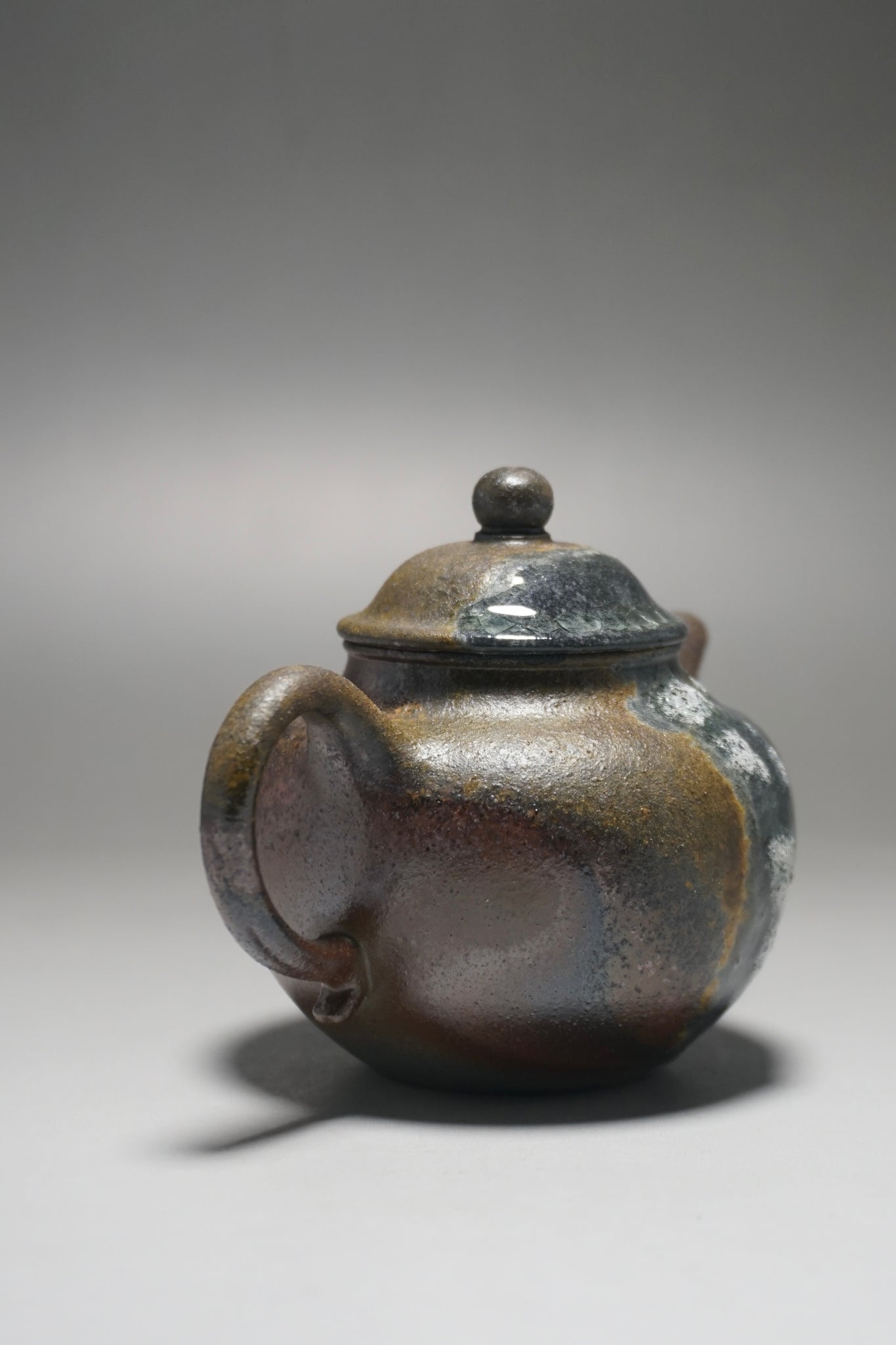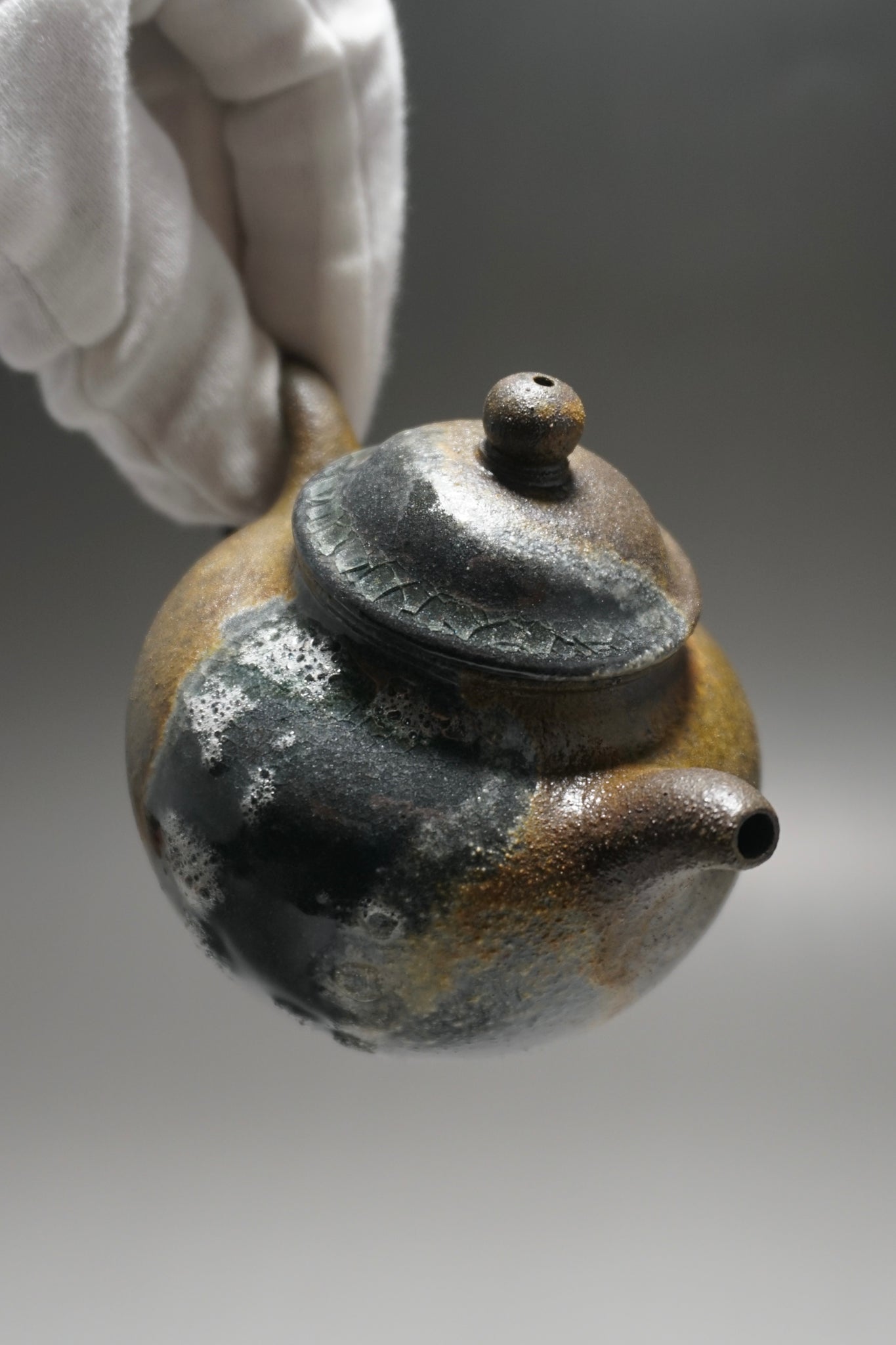 This teapot was fired in a traditional wood kiln in Yixing. The pattern, color and finish are the result of being fired uncovered in a wood kiln for 3 days and 4 nights. The pine wood ash falls on the surface of the teapot forming a natural glaze that is sometimes glossy black, red, brown, yellow, green or any combination of these colors. Wood Fired Yixing Teapots each have their own special appearance, no two are the same. Photos are of actual teapot.