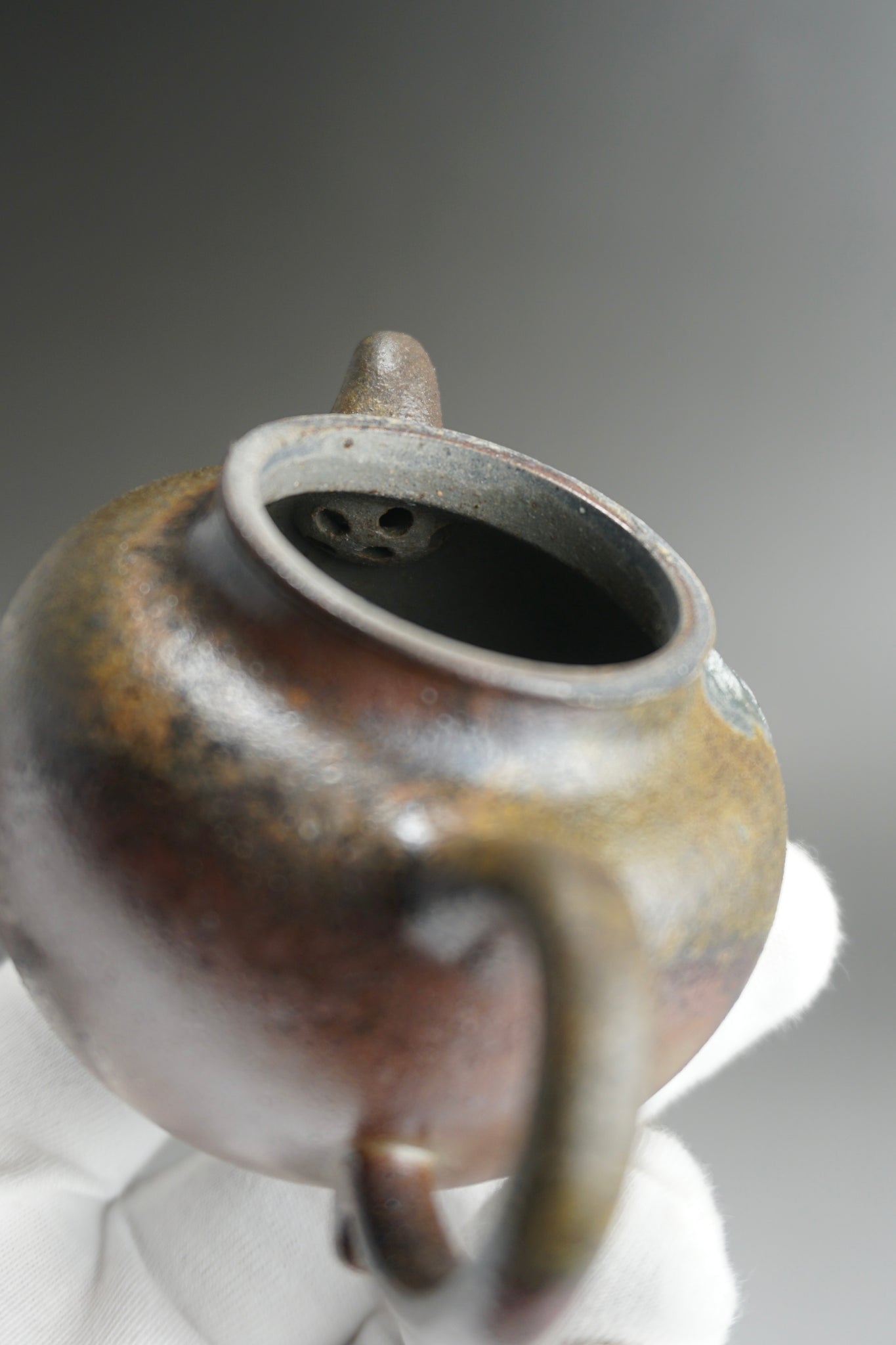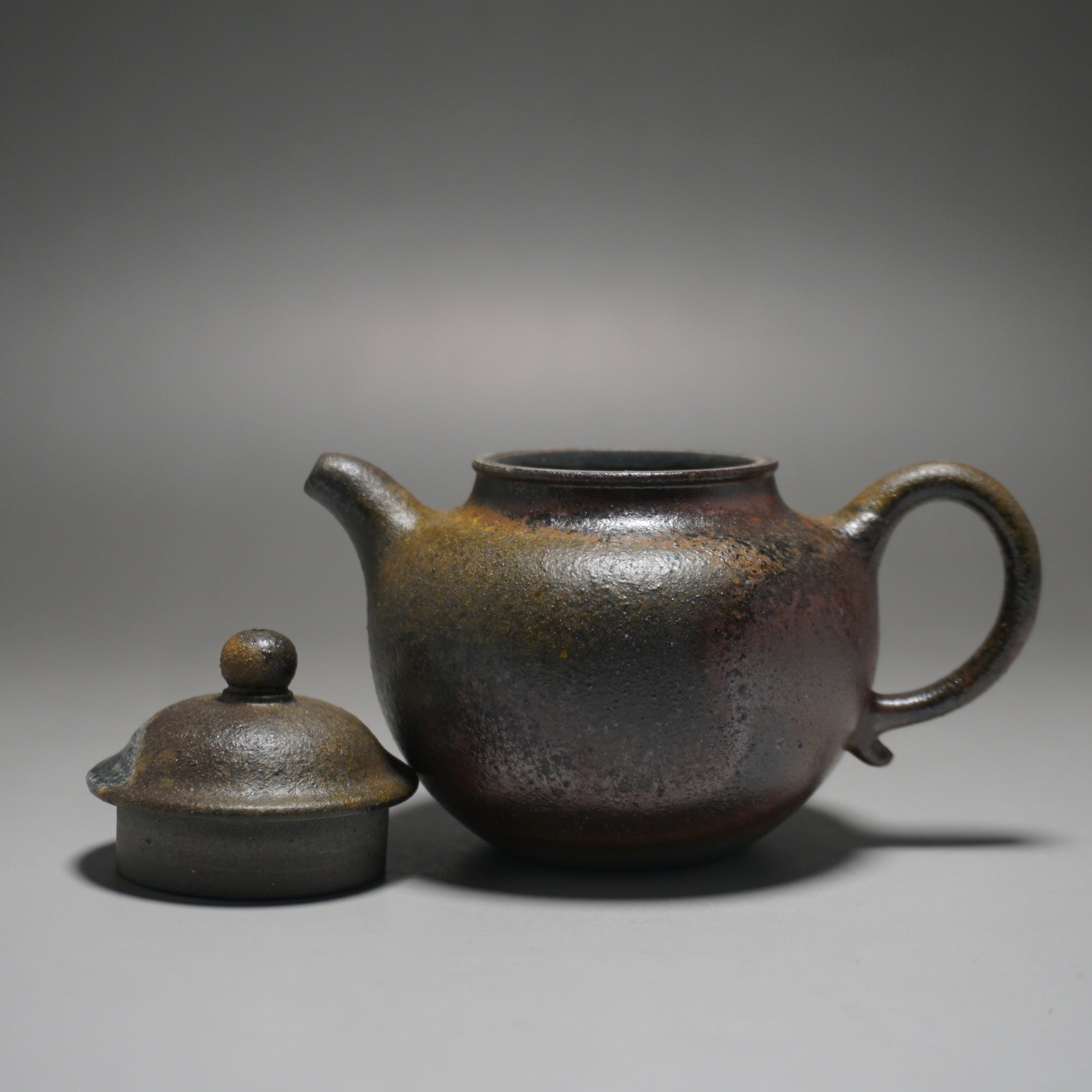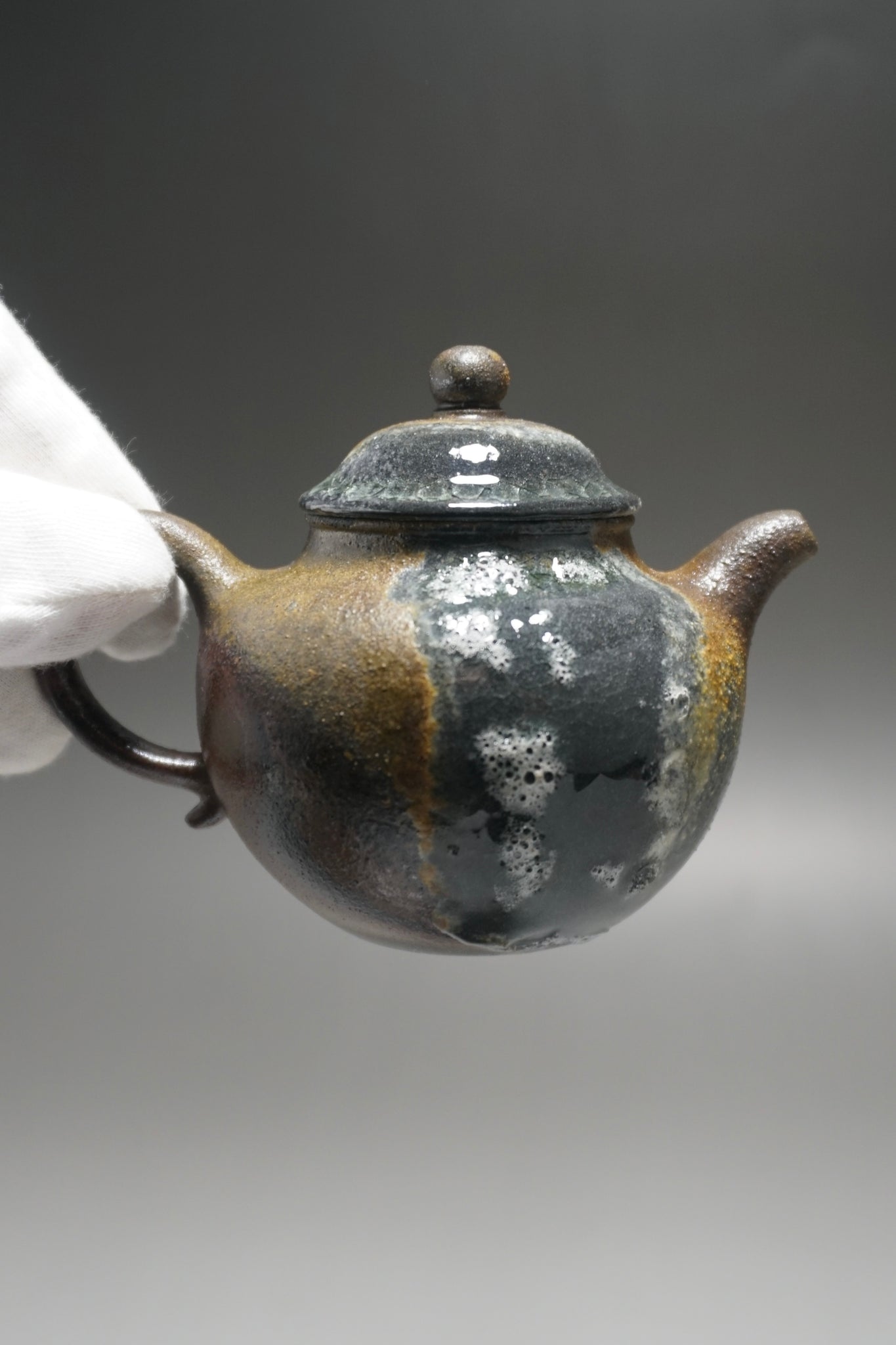 This teapot was fired in a traditional wood kiln in Yixing. The pattern, color and finish are the result of being fired uncovered in a wood kiln for 3 days and 4 nights. The pine wood ash falls on the surface of the teapot forming a natural glaze that is sometimes glossy black, red, brown, yellow, green or any combination of these colors. Wood Fired Yixing Teapots each have their own special appearance, no two are the same. Photos are of actual teapot.