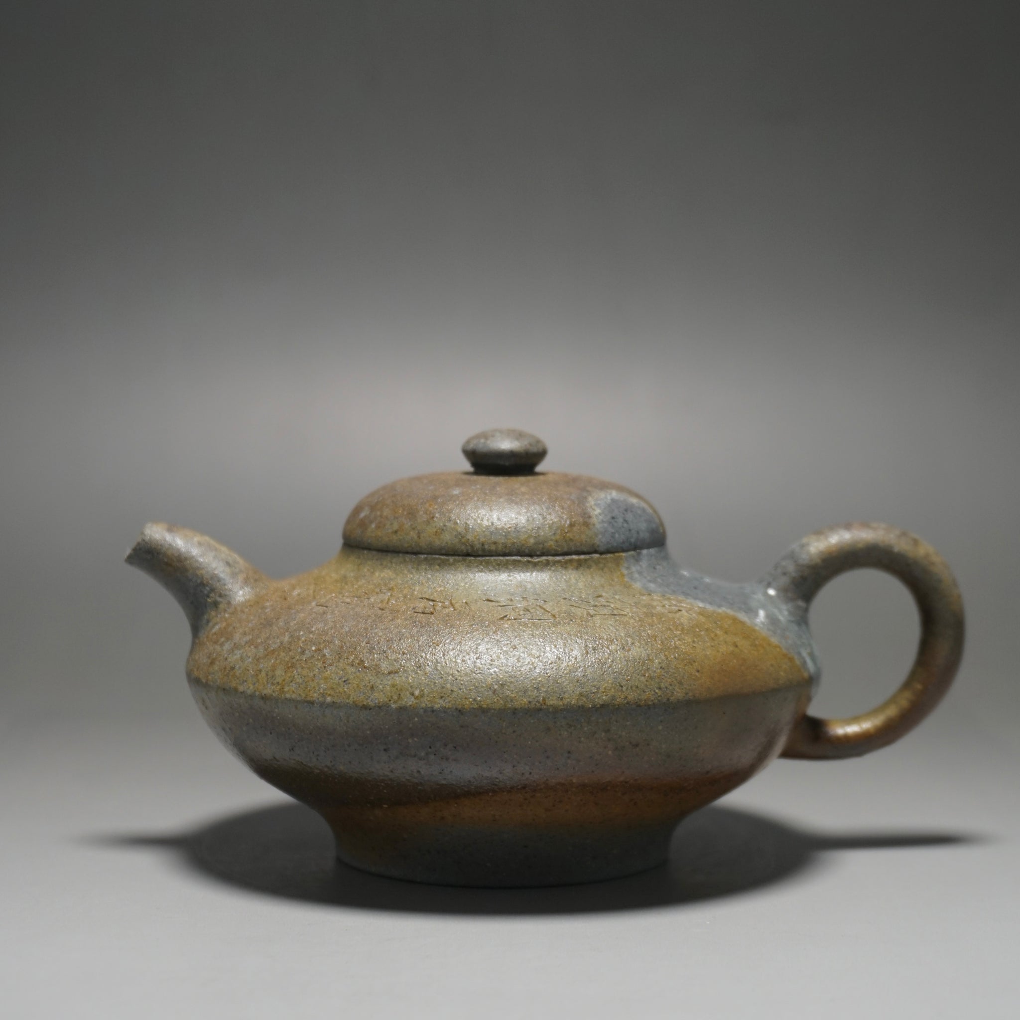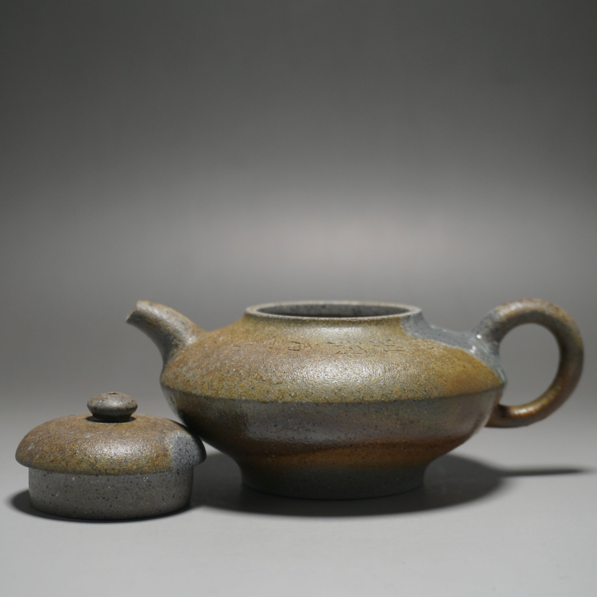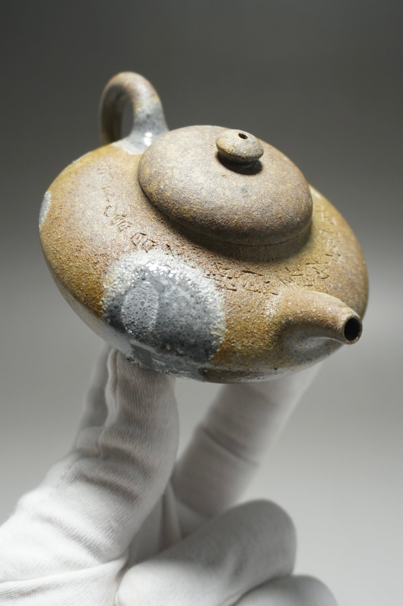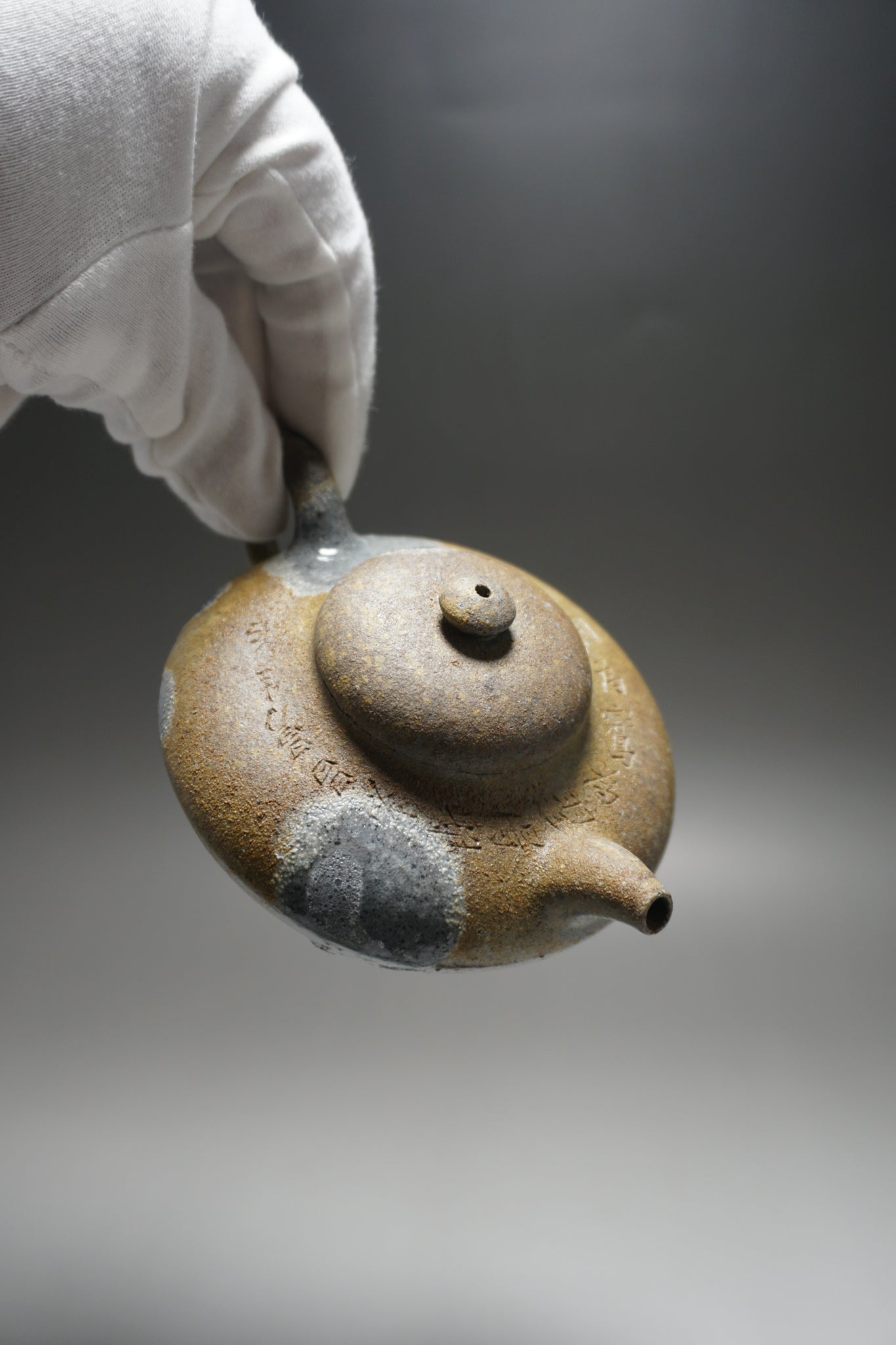 This teapot features a hand-carved inscription.