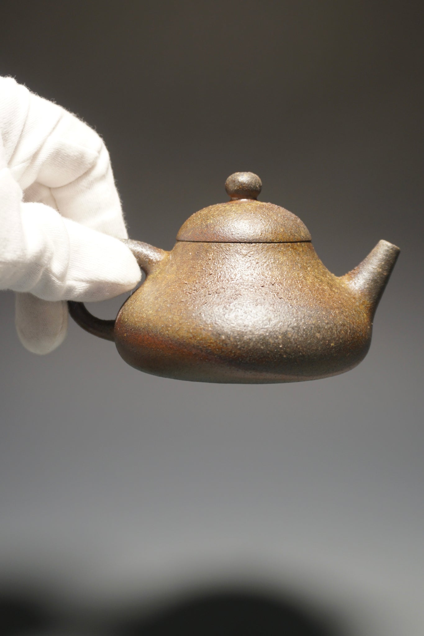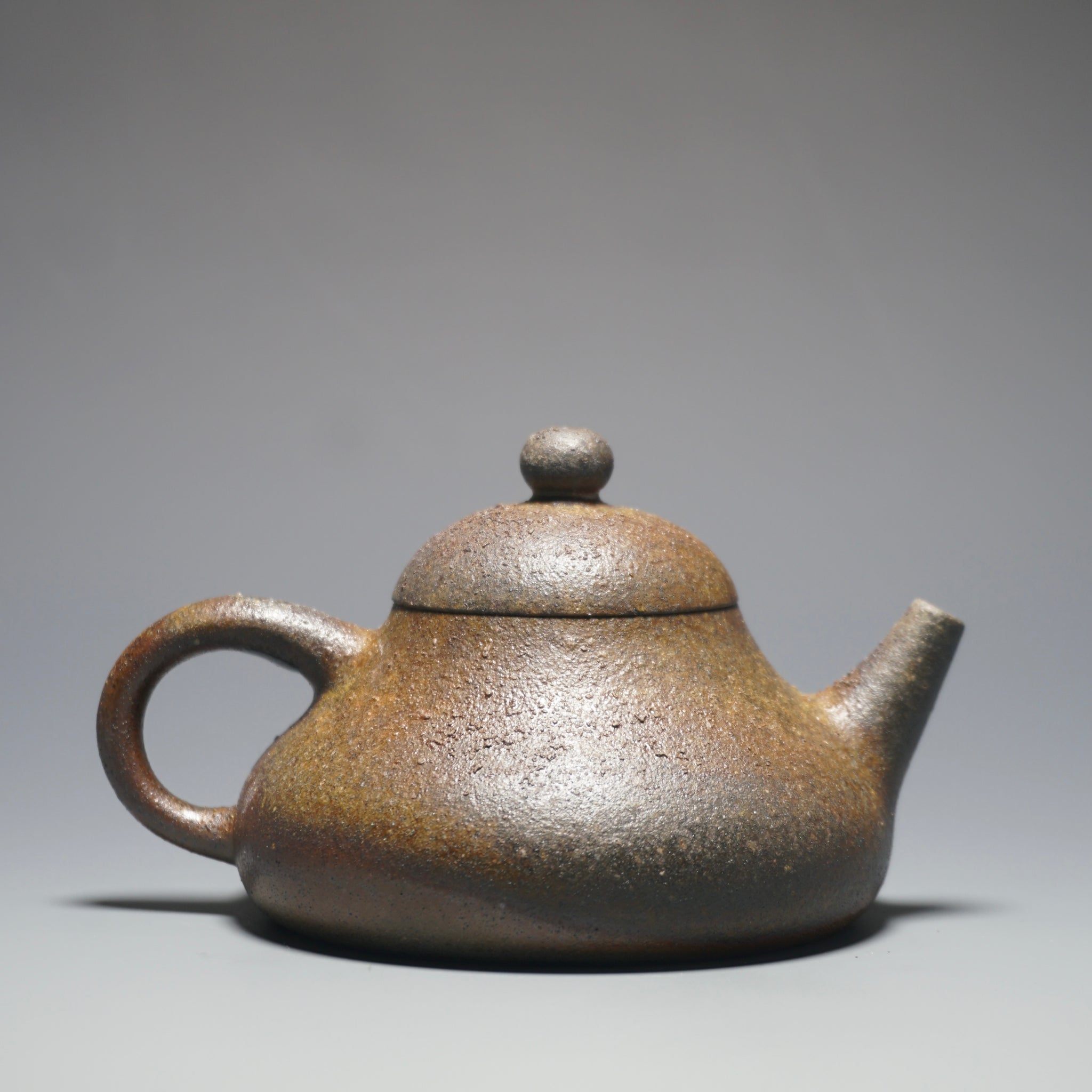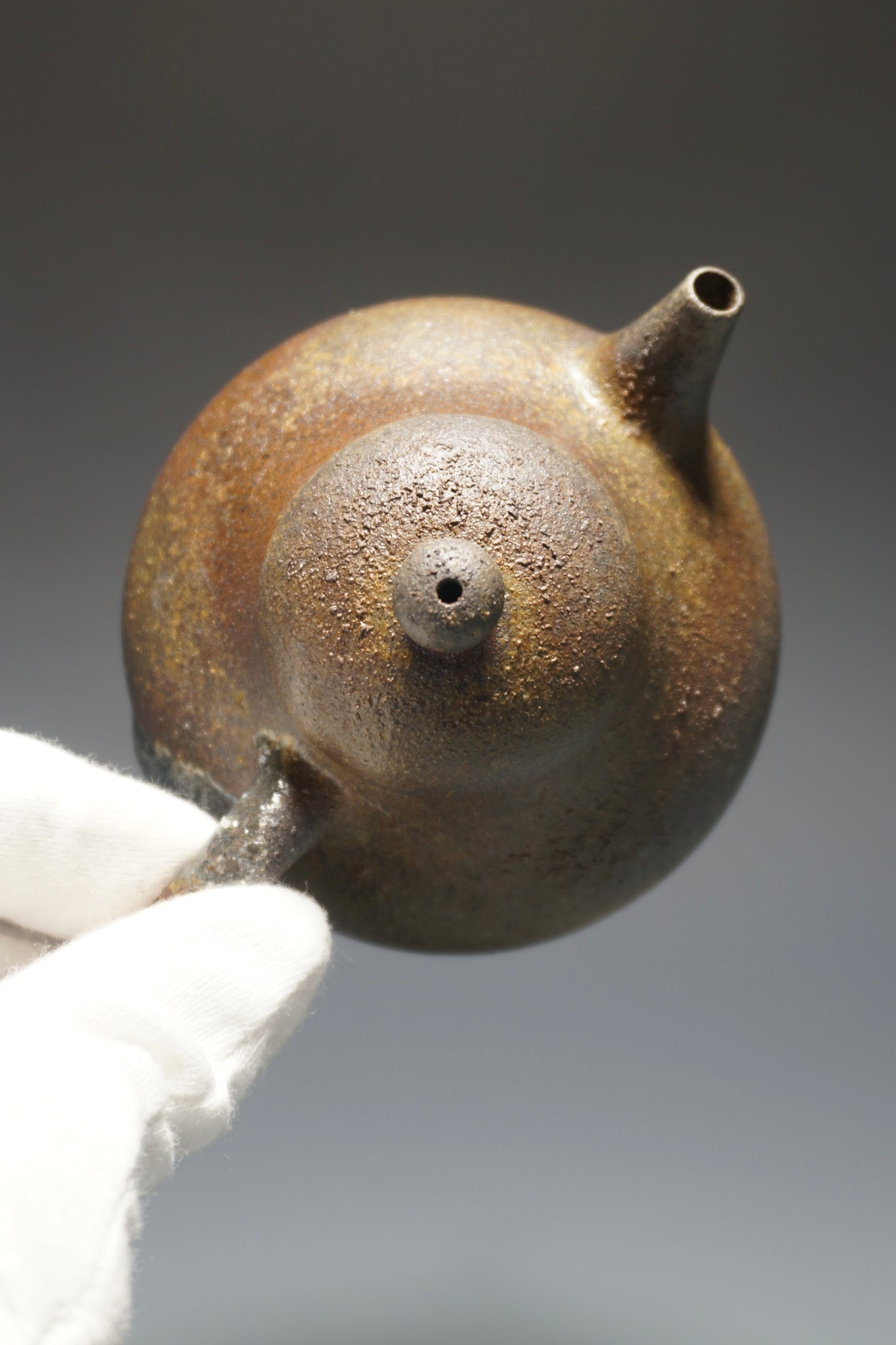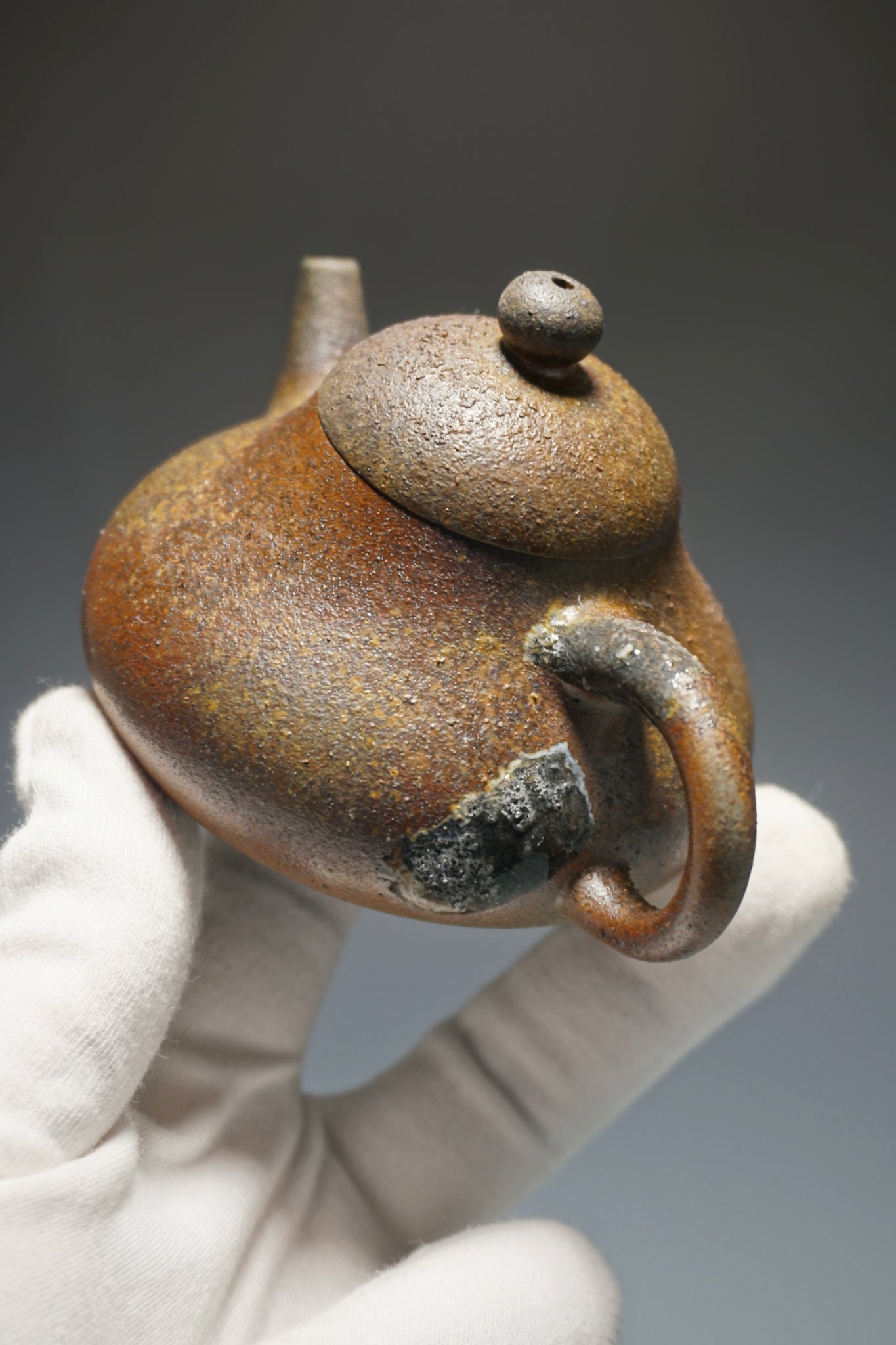 This teapot was fired in a traditional wood kiln in Yixing. The pattern, color and finish are the result of being fired uncovered in a wood kiln for 3 days and 4 nights. The pine wood ash falls on the surface of the teapot forming a natural glaze that is sometimes glossy black, red, brown, yellow, green or any combination of these colors. Wood Fired Yixing Teapots each have their own special appearance, no two are the same. Photos are of actual teapot.