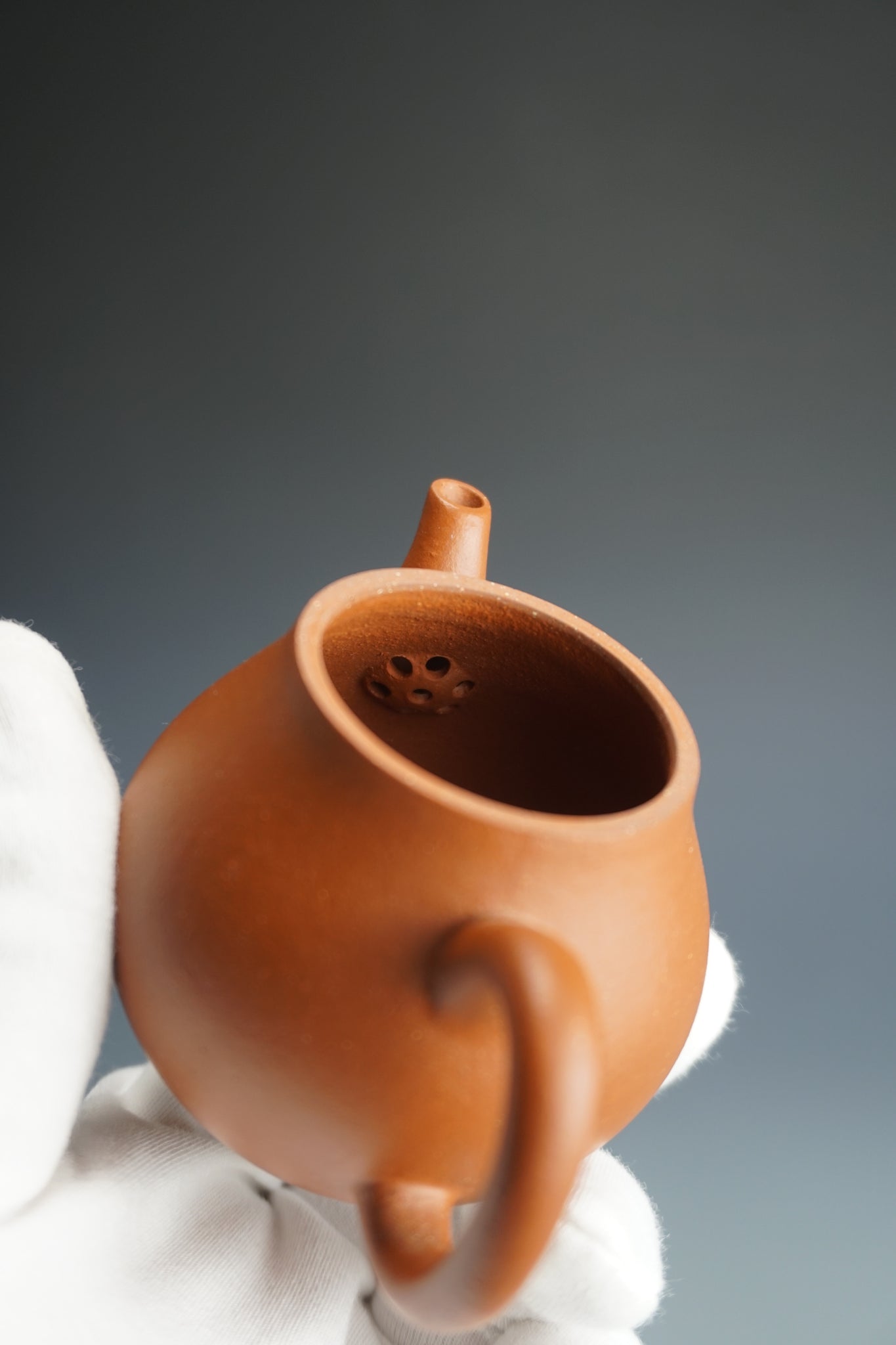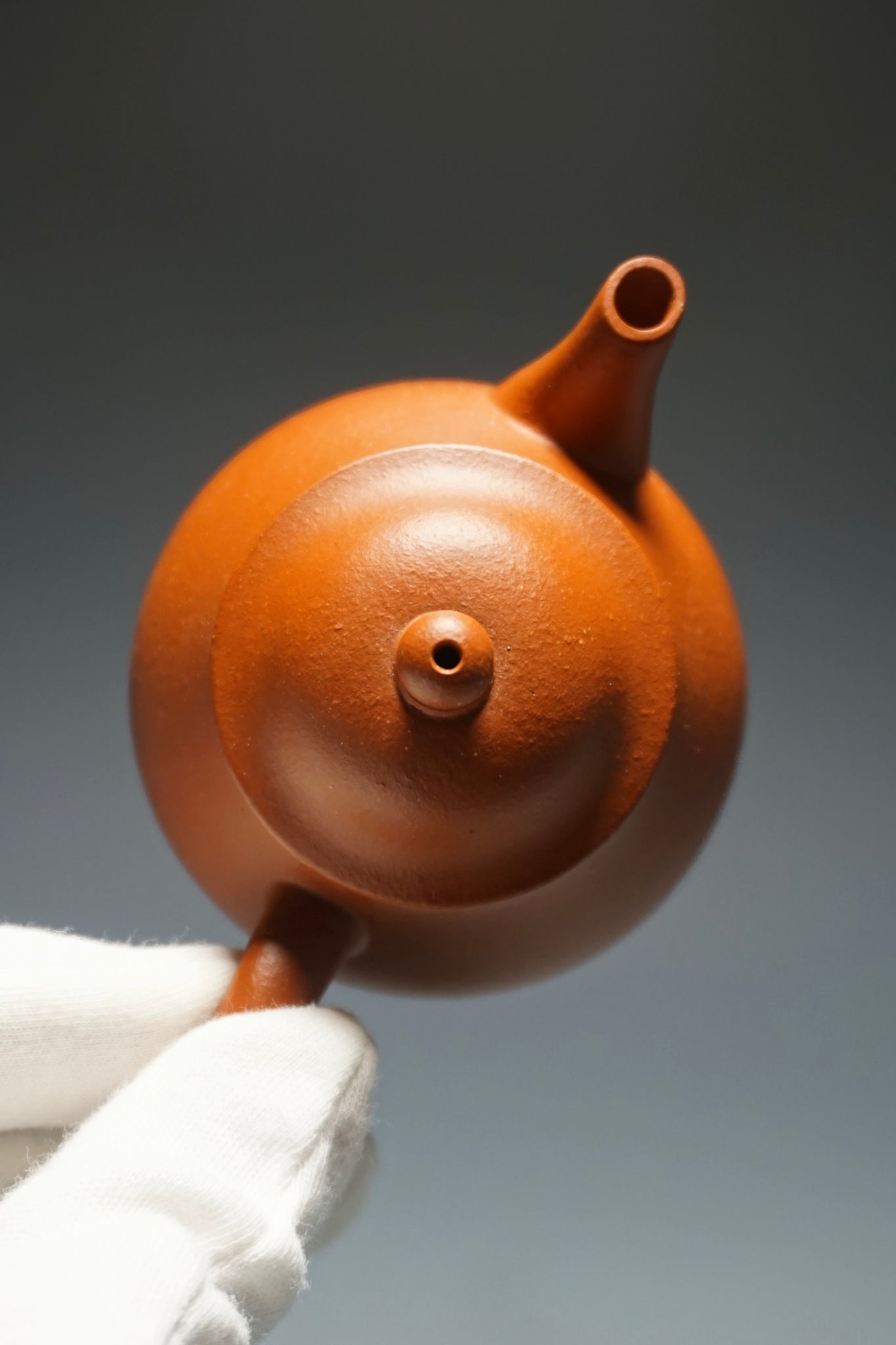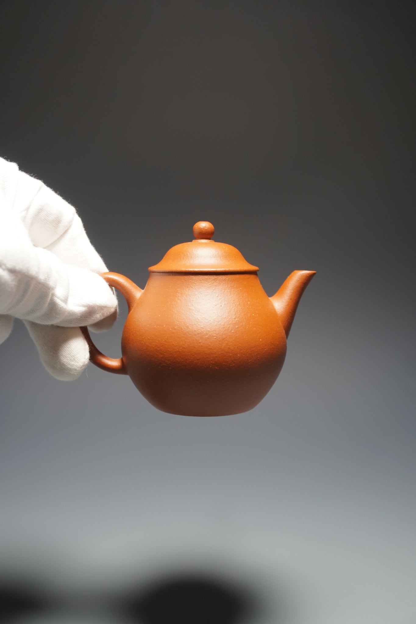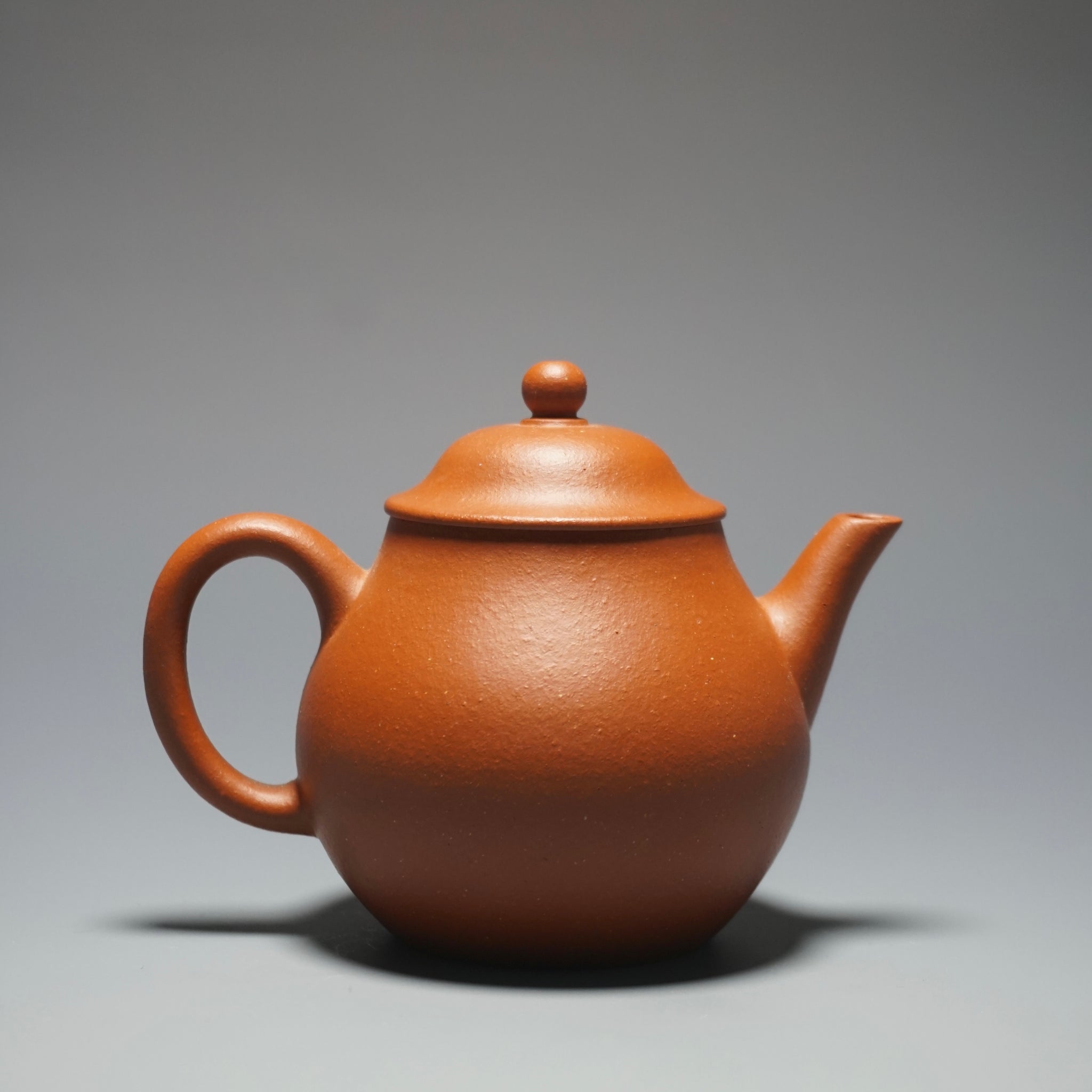 This is an yixing teapot made from the rarer red clay known as zhuni 朱泥. As you can see from the photos, zhuni clay has a slight bumpy appearance. The clay will develop a shine from use. Zhuni clay is prized for its ability to bring out the best flavours. It is also the most difficult clay to fire as it is more likely to break during the process.