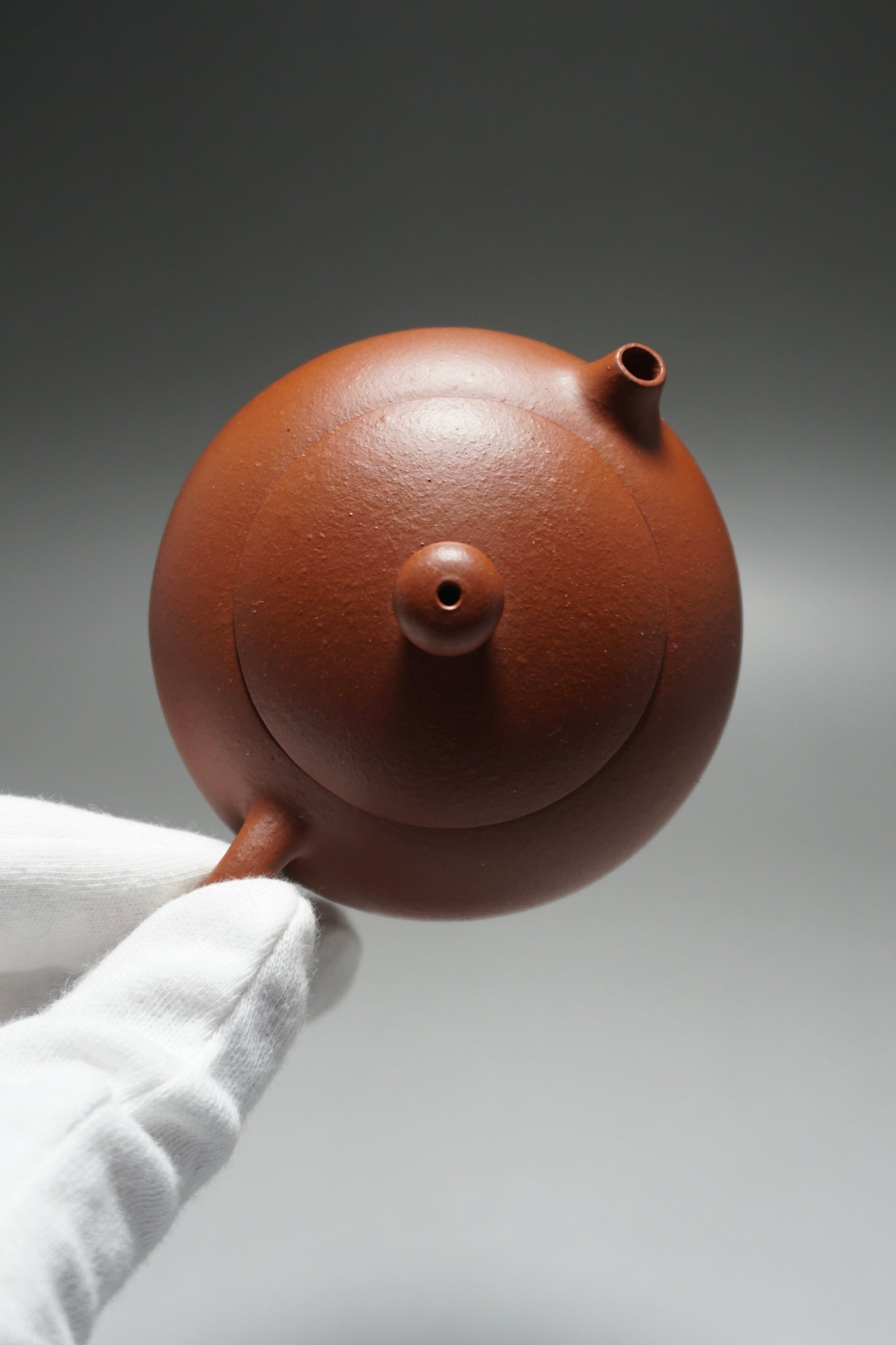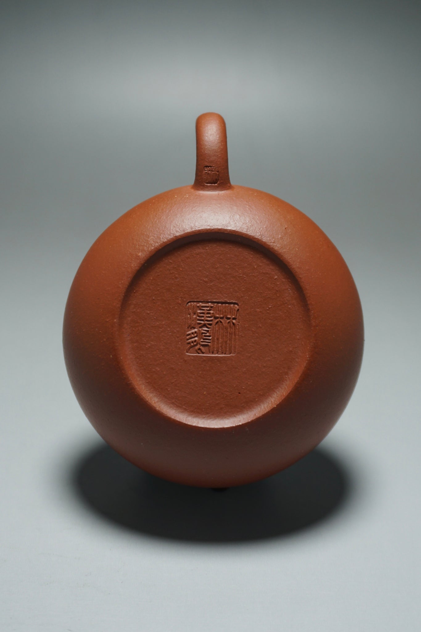 This is an yixing teapot made from the rarer red clay known as zhuni 朱泥. As you can see from the photos, zhuni clay has a slight bumpy appearance. The clay will develop a shine from use. Zhuni clay is prized for its ability to bring out the best flavours. It is also the most difficult clay to fire as it is more likely to break during the process.