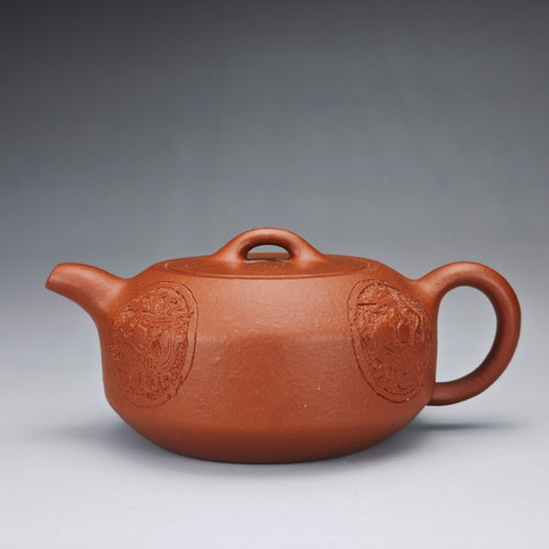 Zhuni Dahongpao Bianshi Yixing Teapot with Carvings 朱泥大红袍扁石带刻绘 150ml